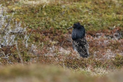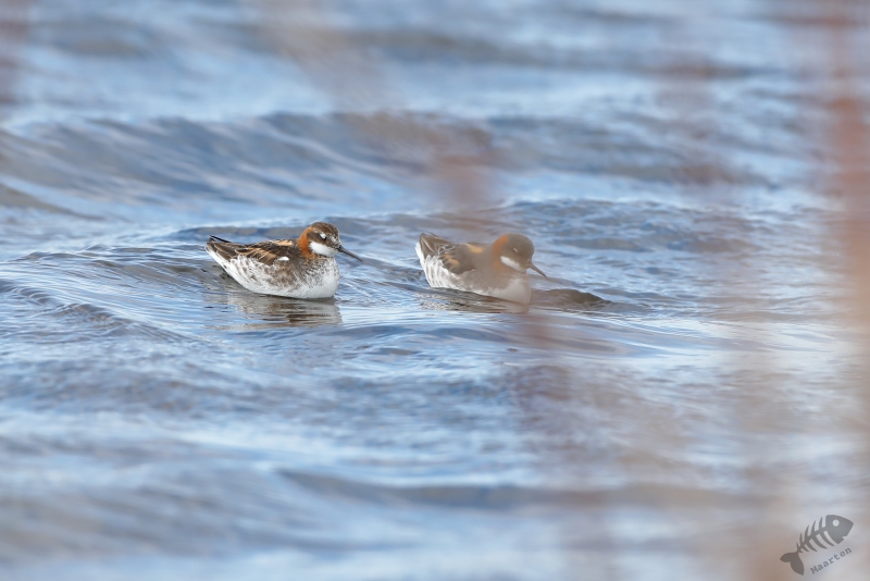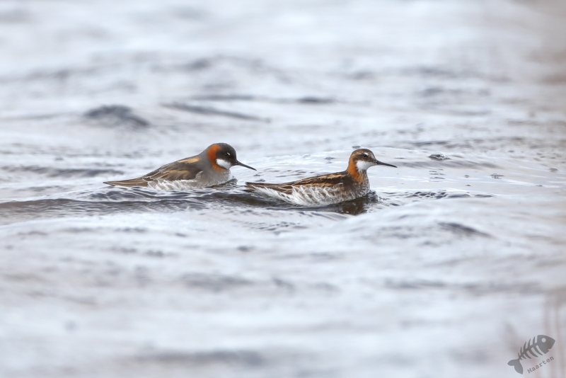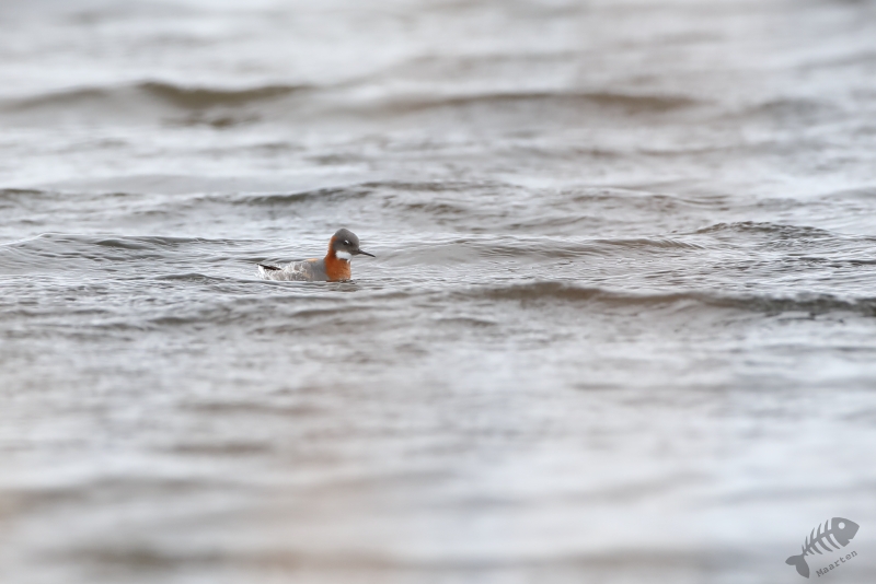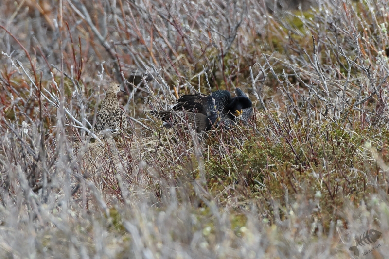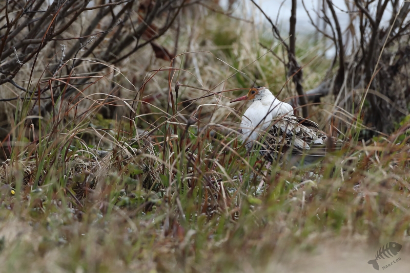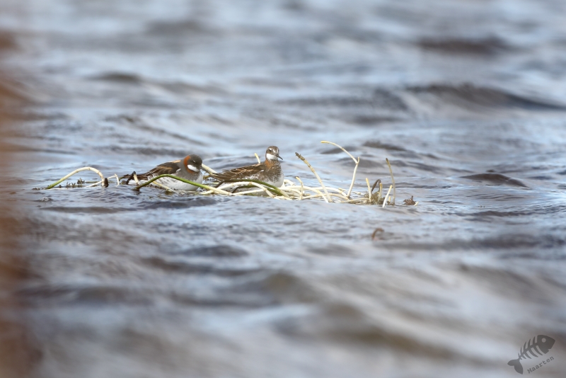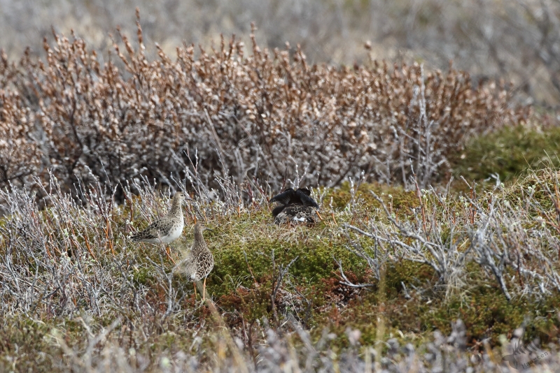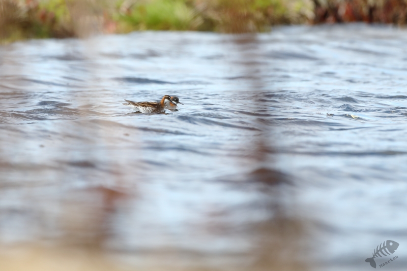 Vandaag kon het dan eindelijk beginnen! Vanwege de lange dag gisteren, ben ik rustig van start gegaan. Ik had besloten niet verder dan Ekkerøy te gaan, voorafgegaan door een bezoek aan Vadsø en Vadsøya. Na het ontbijt in m’n blauwe bolide gestapt en richting Vadsø gereden. Op Vadsøya hoopte ik natuurlijk weer Grauwe Franjepootjes te zien in het meertje Dammen. Dus na aankomst op het eiland ben ik meteen richting Dammen gelopen, maar werd voor even opgehouden door een Kemphaan die druk bezig was indruk op een aantal dames te maken. Toen ik het water naderde, zat er nog een mooie Kemphaan tussen de struiken, maar lag er een eindje verderop ook een fotograaf druk te doen onder een camouflagekleed. Hij (of zij) leek zich vooral bezig te houden met Kemphanen niet ver voor hem. Al vrij snel zag ik een aantal Grauwe Franjepootjes, maar door eerder genoemde fotograaf kon ik niet op de plek gaan zitten die mij het beste leek: ik wilde niet verstoren waar hij mee bezig was en dus bleven de Franjepootjes op grotere afstand dan me eigenlijk lief was. Ik kreeg ze vanaf deze plek eigenlijk helemaal niet in beeld, ook niet na langere tijd wachten waarin ik de hoop had dat ze misschien wel naar me toe zouden komen zwemmen. Een Bosruiter liet zich wel even heel mooi zien en 1 Franjepootje kwam dan in ieder geval op fotografeerbare afstand, maar ik ben na een tijd toch weer vertrokken en heb met een grote omtrekbeweging, een andere plek gevonden. Onderweg naar deze plek vloog er een Zeearend prachtig over! Hoe mooi wil je ze krijgen!? Ondanks het gemis van een camouflagekleed, had ik wel de tactiek van de andere fotograaf afgekeken en ben ik plat op m’n buik langs het water gaan liggen. Een koppeltje Franjepootjes leek daardoor(?) minder onder de indruk van mijn aanwezigheid te zijn en zwom niet ver van me vandaan voor me langs. Daarbij werd een pluk waterplanten geïnspecteerd, misschien om te kijken of het geschikt was om een nest op te maken.
