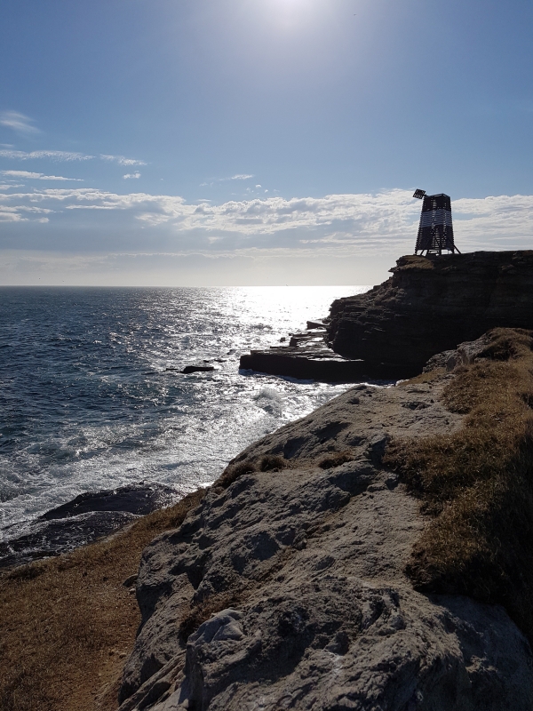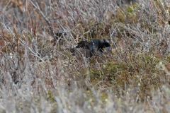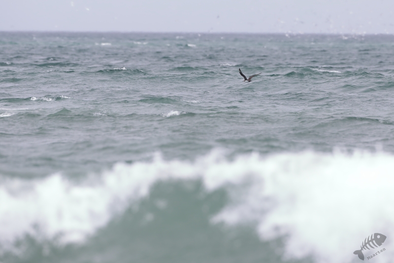 Dat bleken er niet heel veel te zijn… De hele weg naar het baken heb ik eigenlijk alleen vogels op grote afstand gezien. Vanaf het baken ben ik dus maar weer richting het noorden gelopen, richting de keienkust. Een Kleine Jager zat op de rand van het eiland zo’n beetje alles te overzien. Weer op afstand, maar het gaf wel een mooi plaatje. Zo’n geluk als ik vorige keer met deze soort hier had, kun je niet altijd hebben… Een paar Steenlopers leek meer bereid om vastgelegd te worden, wat ik dus maar al te graag deed. Het blijft mooi te zien, hoeveel kleurrijker ze in deze tijd van het jaar zijn. Nog wat verderop vloog een enorme groep Paarse Strandlopers. Een machtig gezicht wanneer de vogels allemaal tegelijk wendden en van donker naar licht veranderden. Schitterend! Op weg naar het baken, was ik 2 Italianen tegengekomen die elk een groot Walvisbot droegen. Ze leken heel trots op hun trofee. Tja… Ze liggen er nou eenmaal, zoals bleek toen ik verder langs de kust liep. Vogels zag ik niet zo heel veel meer. Een mooie Graspieper langs het pad waarvan ik dacht dat het naar de parkeerplaats leidde. Dat bleek niet het geval… Ik was verkeerd gelopen (mijn geheugen bleek net iets minder goed dan ik dacht dat het is) en moest de klim maken naar de bovenkant van de klif om via dezelfde weg als ik gekomen was weer terug te komen. Daardoor pikte ik nog wel een Kleine Jager mee, maar daar bleef het ook wel bij.
