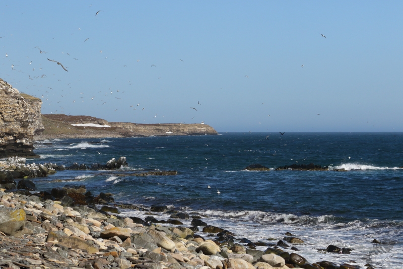 Na een klein half uur rijden kwam ik zonder oponthoud aan bij Ekkerøy. Van de vorige keer herinnerde ik me nog een parkeerplaats van waaraf het minder ver lopen was naar de “Drieteenmeeuwkliffen”, dus ben ik daarheen gereden, heb de auto geparkeerd en ben naar de klif gelopen. Aangekomen onder aan de voet van de klif, was ik weer diep onder de indruk van de grote hoeveelheid vogels die er rondvloog. Het leken er meer te zijn dan 3 jaar geleden, maar dat kan suggestie zijn… Na weer een beetje bij te zijn gekomen van deze eerste indrukken, ben ik foto’s gaan maken van, misschien toch wel, mijn lievelingsmeeuw. Niet voor niets heb ik de “soort” gesponsord in het boek van SOVON. Ook net als de vorige keer hoorde ik de zang van de Tapuit om me heen. Toen ik dacht dat ik wel voldoende foto’s van de Drieteentjes had, ben ik weer begonnen aan de klim naar de top van de klif. Al heel snel zag ik verschillende Tapuiten, wat een goede reden was de klim even te onderbreken… Vanaf de klif heb je echt een machtig gezicht over de Drieteenmeeuw kolonie, maar ook over de rest van Ekkerøy. Ik besloot de wandeling naar het baken aan de uiterste oostpunt van het eiland weer te gaan maken. Wie weet welke soorten me nu weer blij zouden kunnen verrassen…