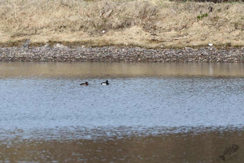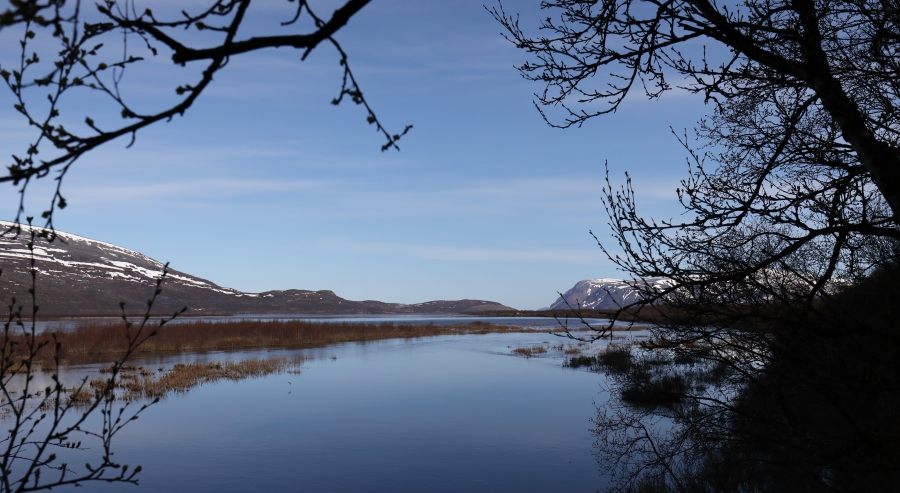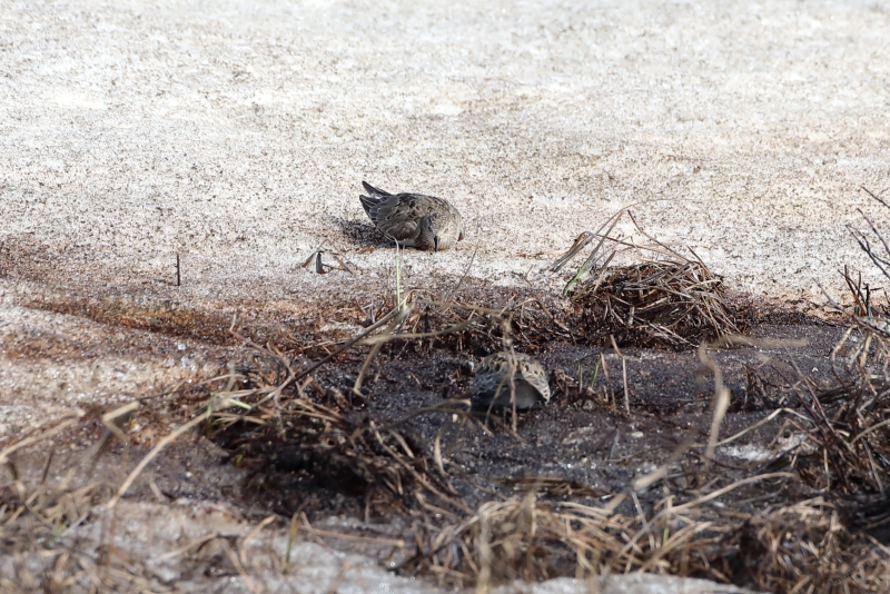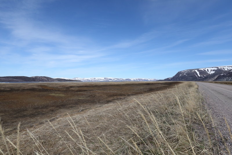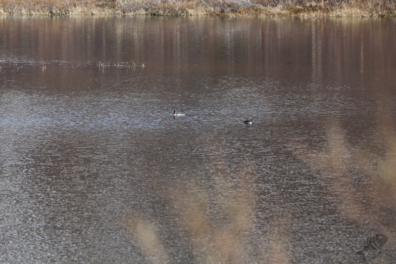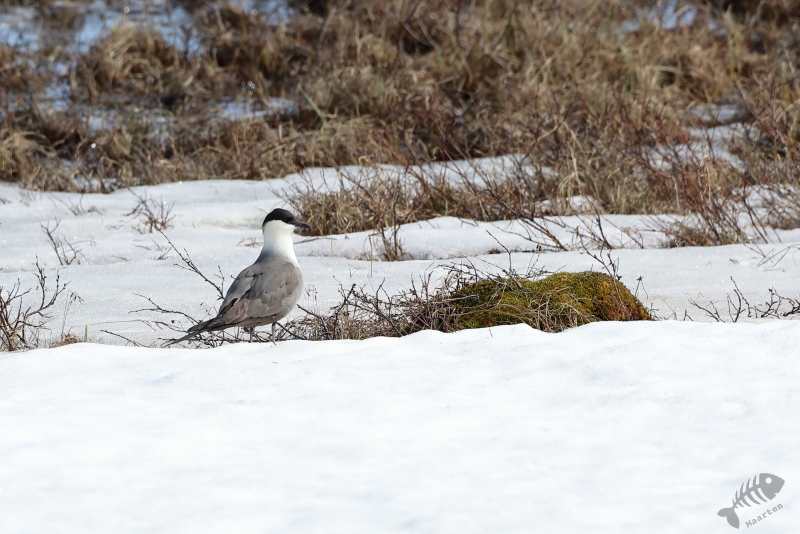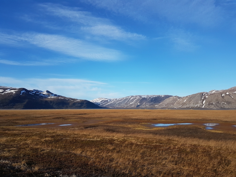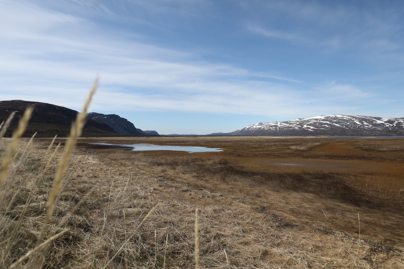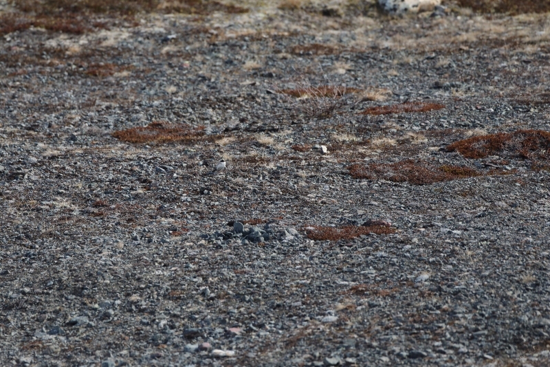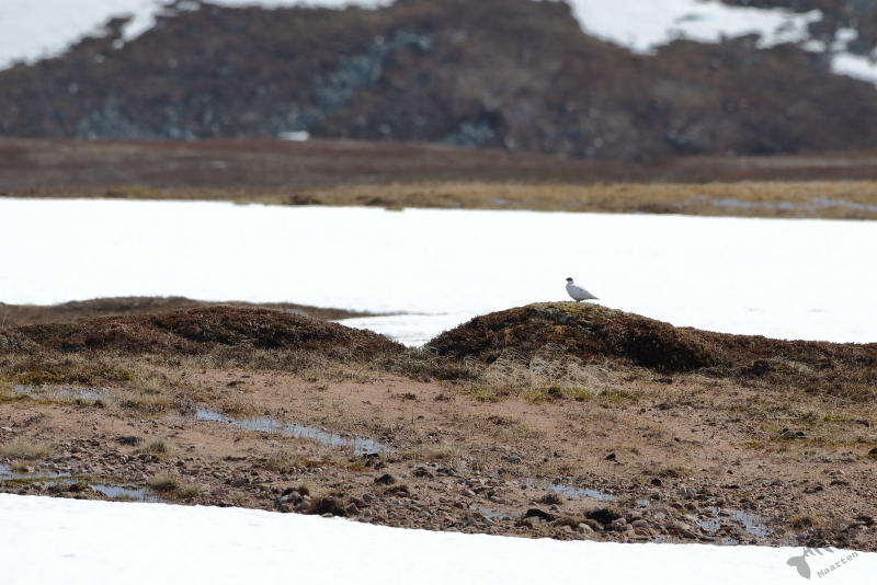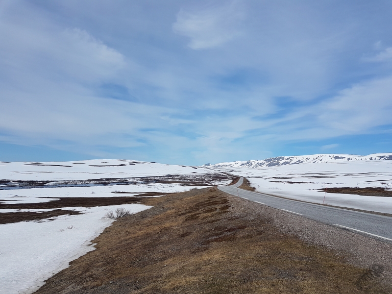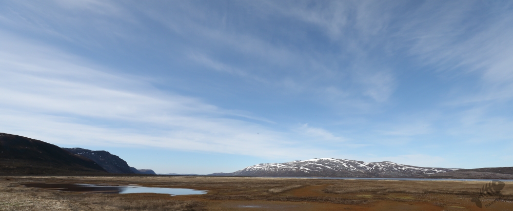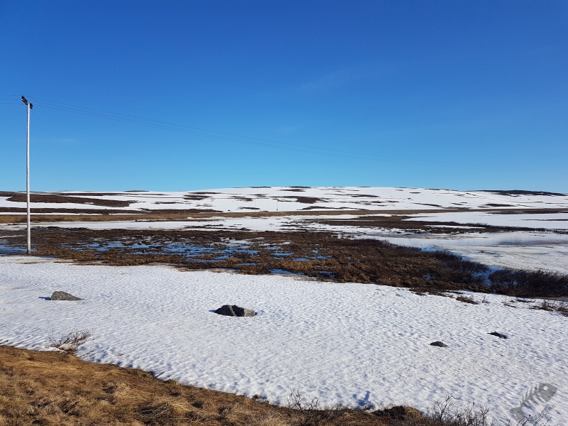 Aan de overkant van het wegwerkstation van Gednje lag ook een meertje. Lang nog niet ijsvrij, maar er was al water zichtbaar. Ook hier hebben Anders en ik een tijd gestaan. Op een bepaald moment nam Anders het geluid op van de omgeving, iets waar ik nu zeker spijt van heb dat ik dat ook niet gedaan heb. Het was het typische geluid van het voorjaar in het noorden. Roepende Roodkeelduikers, blatende Watersnippen en gakkende Toendrarietganzen: wat een heerlijke plek! Over de Roodkeelduikers en IJseenden wist Anders het volgende te vertellen: “Ze broeden aan de meertjes op deze hoogvlakte, maar willen wel water in de buurt hebben (en geen ijs). Hoe weten ze nou wanneer er voldoende water is zodat het voor hun aantrekkelijk is om te starten met nestelen? In de winter en vroeg in het voorjaar verblijven ze in zee of ander groot open water. Om de zoveel dagen vliegen ze op en vliegen naar de hoogvlakte om te inspecteren hoe het gesteld is met het ijs. Wanneer er nog teveel ligt, vliegen ze weer terug en wachten weer een paar dagen om het daarna opnieuw te proberen. Als het water voldoende open is, blijven ze en kunnen ze gaan beginnen.” Ik vind dit zo’n geniaal gedrag: gewoon een stukje vliegen, even kijken, omdraaien en later weer proberen. Terwijl wij daar stonden kwam er een Roodkeelduiker aanvliegen en vond een minuscuul plasje om in te landen. Later kwam er nog 1 en ze zwommen gezamenlijk rond. Misschien vonden ze het al wel oké…