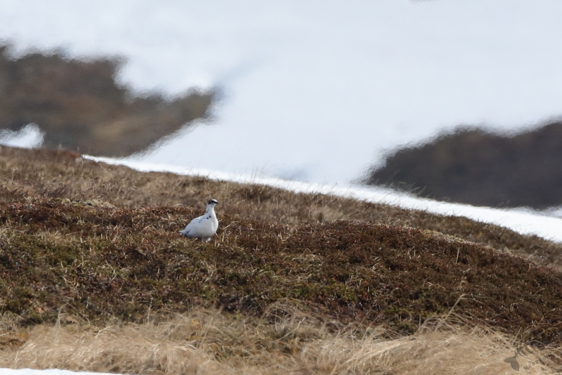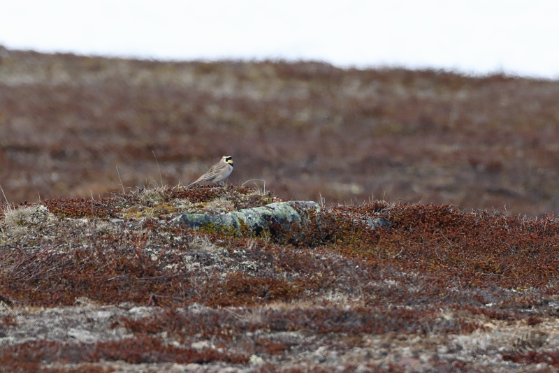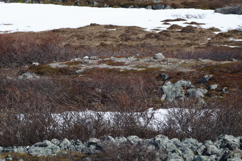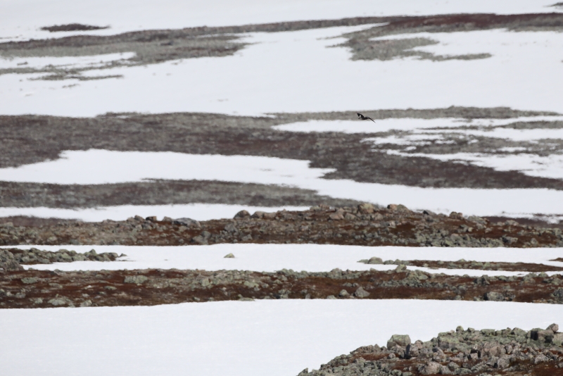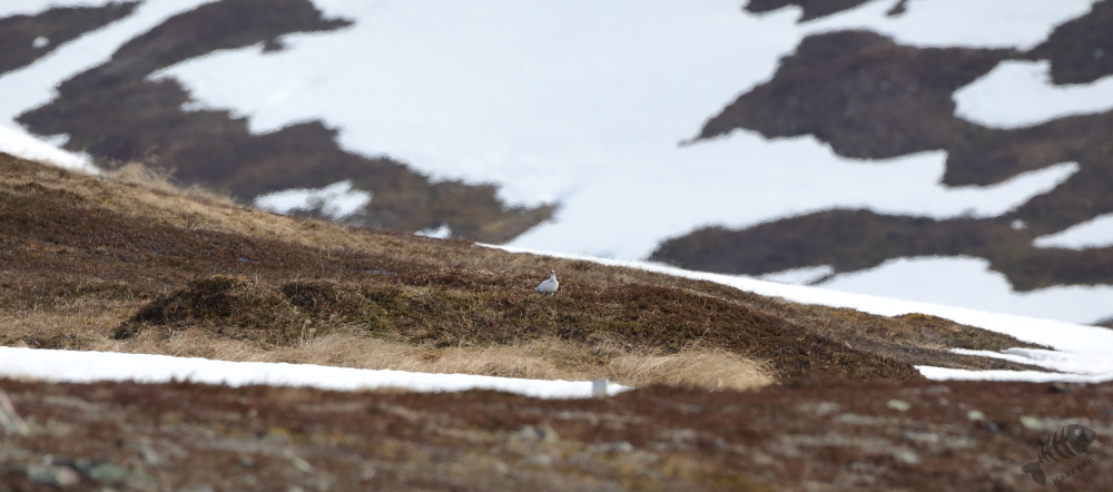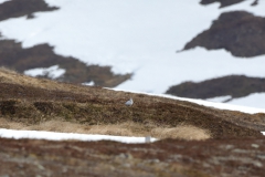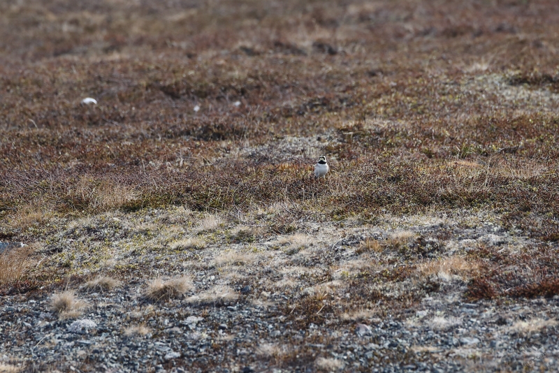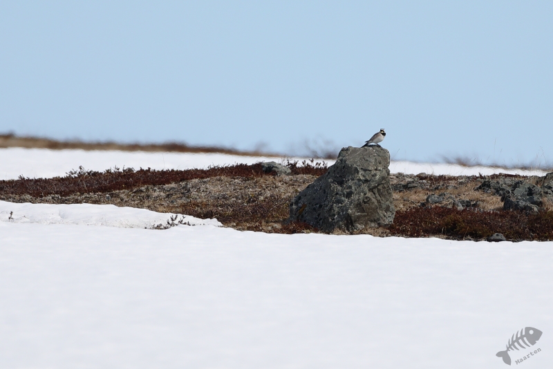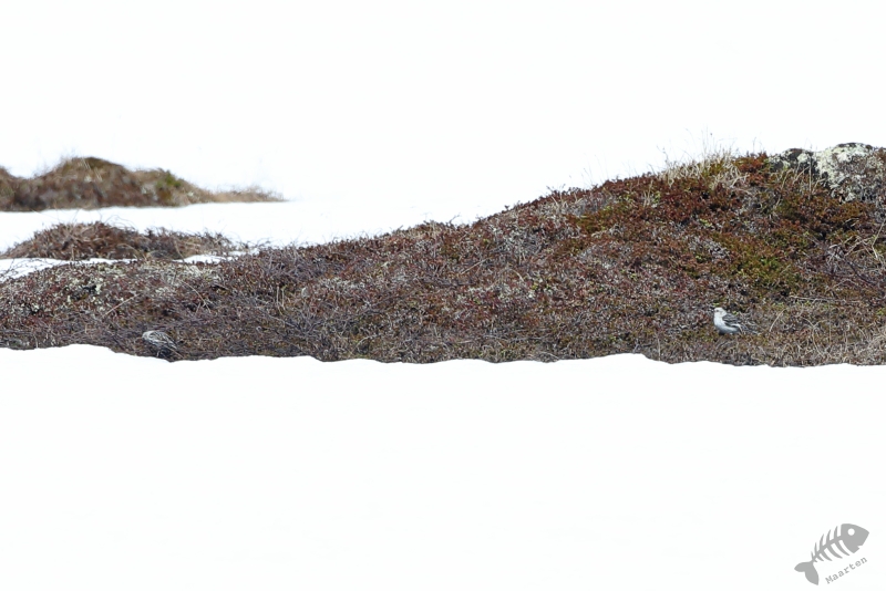 Toen we een stukje onderweg waren, stopte Anders de auto weer langs de kant van de weg om de omgeving te scannen. Vanuit de auto meende hij een Morinelplevier te hebben zien vliegen en hij wilde proberen deze weer terug te vinden. Dat lukte helaas niet, maar aan de linkerkant van de weg, waar de Morinel ingevallen zou zijn, zag hij wat beweging wat Sneeuwgorzen bleken te zijn! Ook deze heel leuke soort was me vorige keer niet gelukt in hun zomer-omgeving te zien. Nu scharrelde er een aantal op een sneeuwvrij stukje rond. Het was op grote afstand, maar bij 1 mannetje was te zien dat hij al volop in zijn zomer pluimage was. Superleuk! Anders was aan de andere kant van de weg aan het scannen en liet plotseling weten dat hij weer iets interessants ontdekt had. Er bleek een Alpensneeuwhoen te zitten! Ook deze zat vrij ver weg, maar het lukte me toch om hem aardig in beeld te krijgen. Een nieuwe soort, en niet de makkelijkste om te vinden. Echt gaaf! Daarna weer een stukje verder, tot Anders weer wat zag bewegen. Ook meer richting Båtsfjord bleken Strandleeuweriken te zitten en ondanks het vervelende licht, kwam deze ook mooi in beeld.