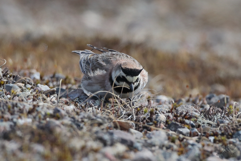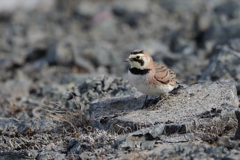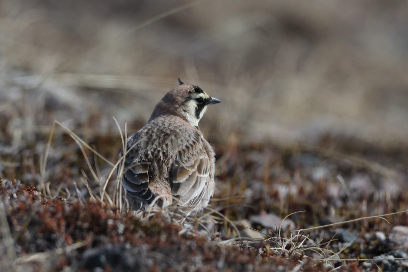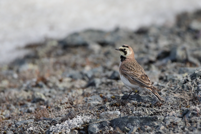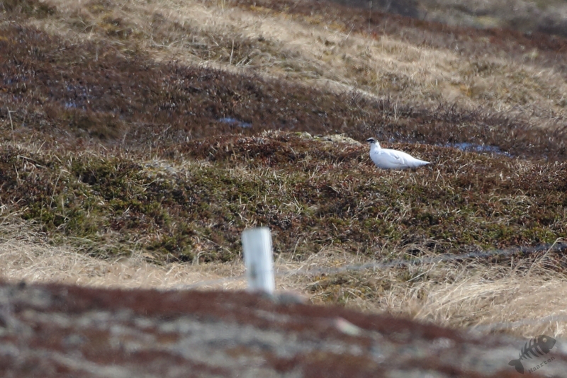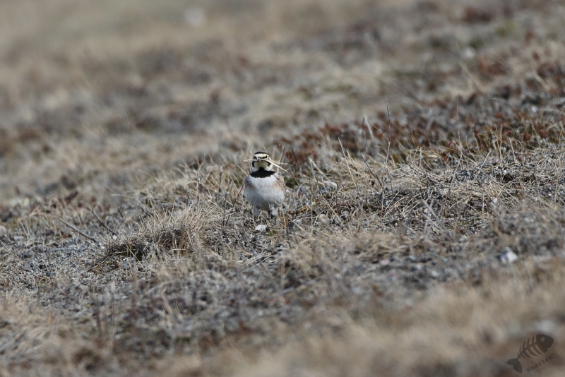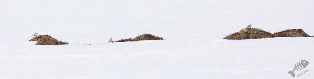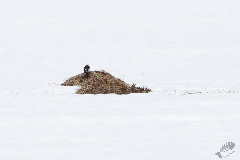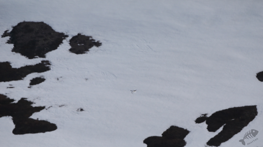 Toen we een stukje onderweg waren, stopte Anders de auto weer langs de kant van de weg om de omgeving te scannen. Vanuit de auto meende hij een Morinelplevier te hebben zien vliegen en hij wilde proberen deze weer terug te vinden. Dat lukte helaas niet, maar aan de linkerkant van de weg, waar de Morinel ingevallen zou zijn, zag hij wat beweging wat Sneeuwgorzen bleken te zijn! Ook deze heel leuke soort was me vorige keer niet gelukt in hun zomer-omgeving te zien. Nu scharrelde er een aantal op een sneeuwvrij stukje rond. Het was op grote afstand, maar bij 1 mannetje was te zien dat hij al volop in zijn zomer pluimage was. Superleuk! Anders was aan de andere kant van de weg aan het scannen en liet plotseling weten dat hij weer iets interessants ontdekt had. Er bleek een Alpensneeuwhoen te zitten! Ook deze zat vrij ver weg, maar het lukte me toch om hem aardig in beeld te krijgen. Een nieuwe soort, en niet de makkelijkste om te vinden. Echt gaaf! Daarna weer een stukje verder, tot Anders weer wat zag bewegen. Ook meer richting Båtsfjord bleken Strandleeuweriken te zitten en ondanks het vervelende licht, kwam deze ook mooi in beeld.