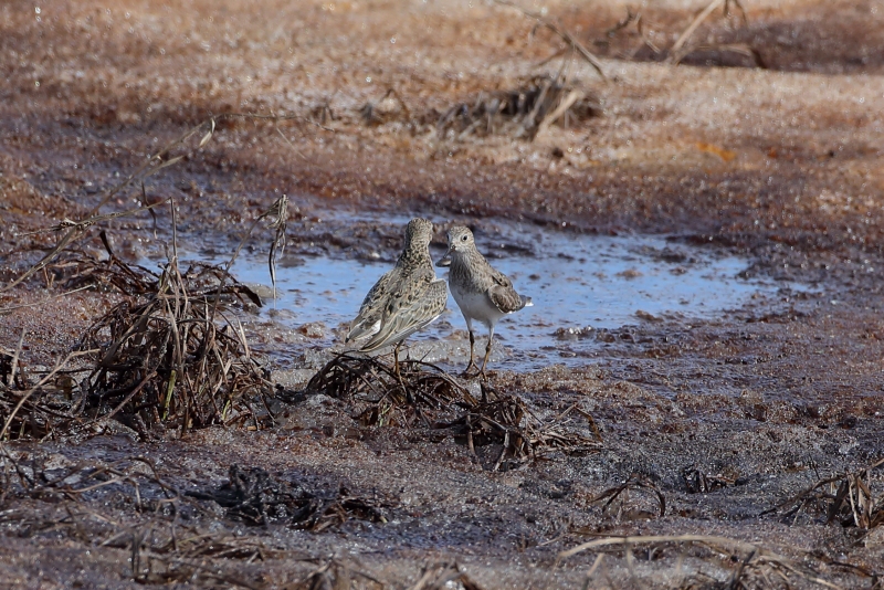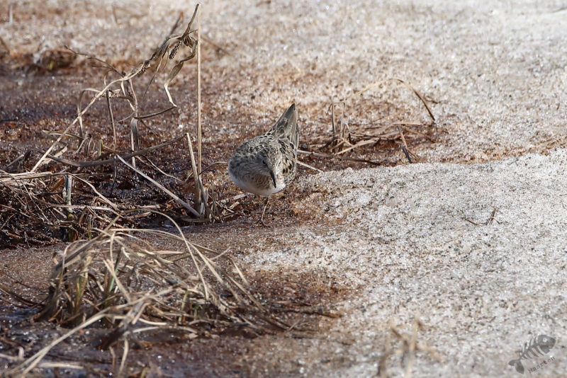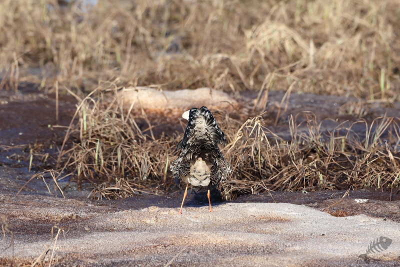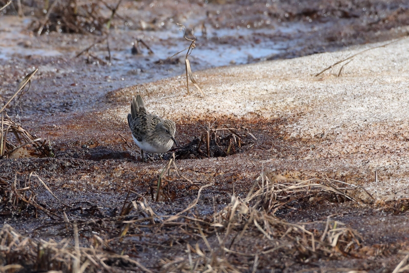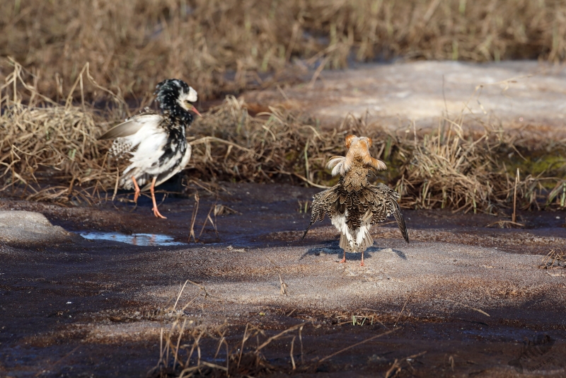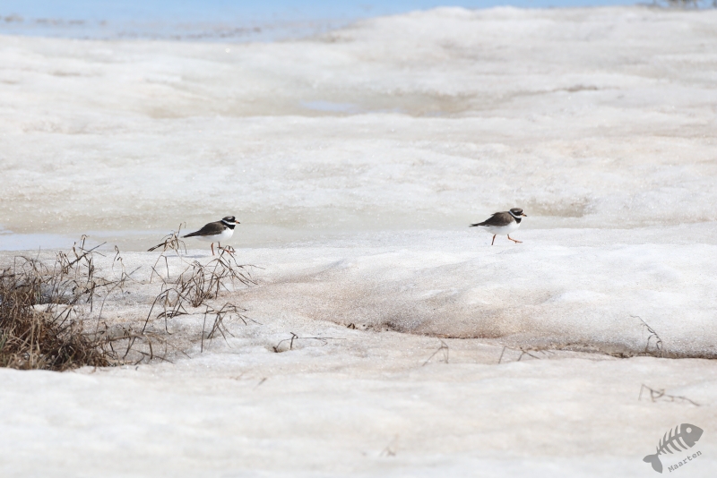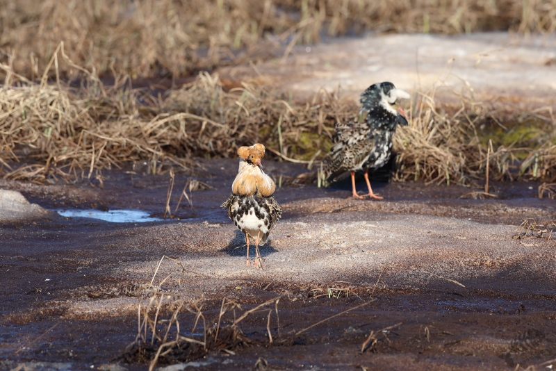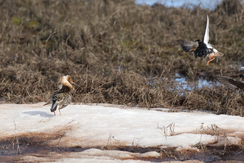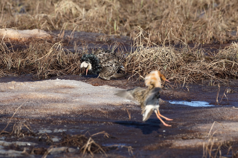 Een gedeelte van het water was ontdooid en bleek al in bezit te zijn genomen door 2 koppeltjes Franjepootjes. Dat zijn natuurlijk ook altijd dankbare onderwerpen, dus kreeg mijn camera nog even geen pauze. Op het moment dat 2 Kemphanen het met elkaar aan de stok leken te krijgen, heb ik ook maar wat foto’s gemaakt… Wat een indrukwekkend gezicht als die mannen zich even goed laten zien! Maar ook de minder uitbundige soorten konden onze waardering zeker krijgen. Een heel mooie Bosruiter op het ijs of een Roodkeelpieper, ook op het ijs. Een Bontbekplevier of Temmincks Strandloper en een Graspieper, voor allemaal hebben we de tijd genomen om ze eens goed te bekijken en vast te leggen. Had ik al gezegd wat een geweldig gebied het is!?