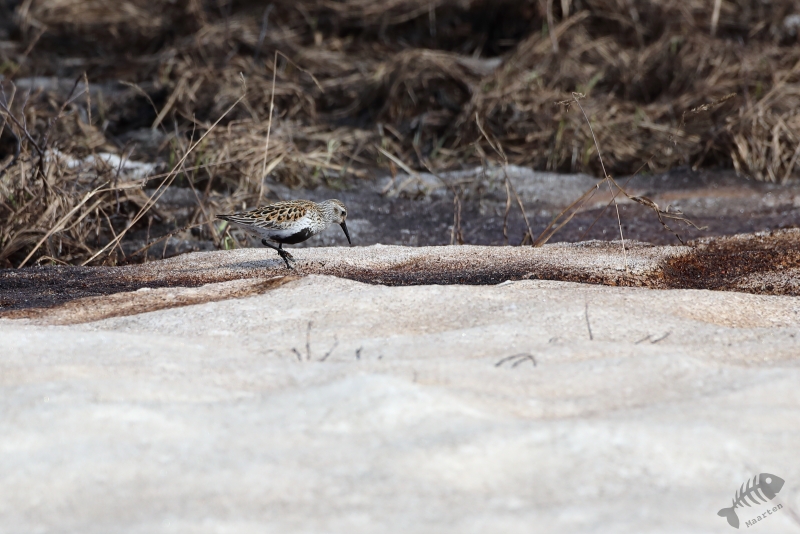 Maar goed, eerst de Strandleeuwerik. We reden dus naar een plek waarvan Anders eigenlijk wel zeker wist waar ze zouden kunnen zitten. Hij stopte de auto daar en eigenlijk had hij er meteen 1 in het vizier, een mannetje dat op een rotsje zat te zingen. Het bleek dat er meerdere zaten en dus kon ik al heel snel m’n halve schijfje vol schieten met deze prachtige vogels. Omdat we deze weg later weer zouden rijden als we door zouden gaan naar Båtsfjord, zijn we dus inderdaad omgekeerd en zijn bij Gednje rechtsaf geslagen richting Berlevåg. De vorige keer dat ik hier was in het voorjaar, zag ik rechts naast de weg in een klein meertje prachtige Roodkeelduikers. Nu bleek de situatie anders te zijn. Er lag veel meer sneeuw in de omgeving en de meertjes waren nog grotendeels bevroren. Roodkeelduikers bleken er dan ook niet te zitten, maar er zwom wel een, hoe toepasselijk, IJseend rond. Een klein stukje verderop langs de Getnjejohka (waar ik vorige keer ook al zo’n mooie dingen had gezien) was een gebiedje waar het ijs iets begon te smelten en er een soort moerasje was ontstaan. Anders stopte de auto er even en raakte meteen helemaal enthousiast. Er bleken Kemphanen te zitten, Temmincks en Bonte Strandlopers en Bontbekpleviertjes. Ik geloof dat we hierna nog een stuk de 890 afgereden zijn, naar een parkeerplaats waar ik in 2019 ook een keer gestopt was om te zien wat we op dit stuk weg nog allemaal zouden kunnen vinden. Vanaf de parkeerplaats zag Anders heel in de verte een Moerassneeuwhoen zitten. Hij gebruikte telkens zijn telescoop om de omgeving af te zoeken naar interessante vogels en ik was elke keer weer verwonderd wat hij allemaal wist te vinden. Een kleinste Jager was mijzelf nog gelukt en daarna keerde Anders de auto weer om bij Gednje linksaf te gaan, de 891 op nu echt richting Båtsfjord.