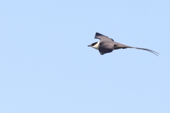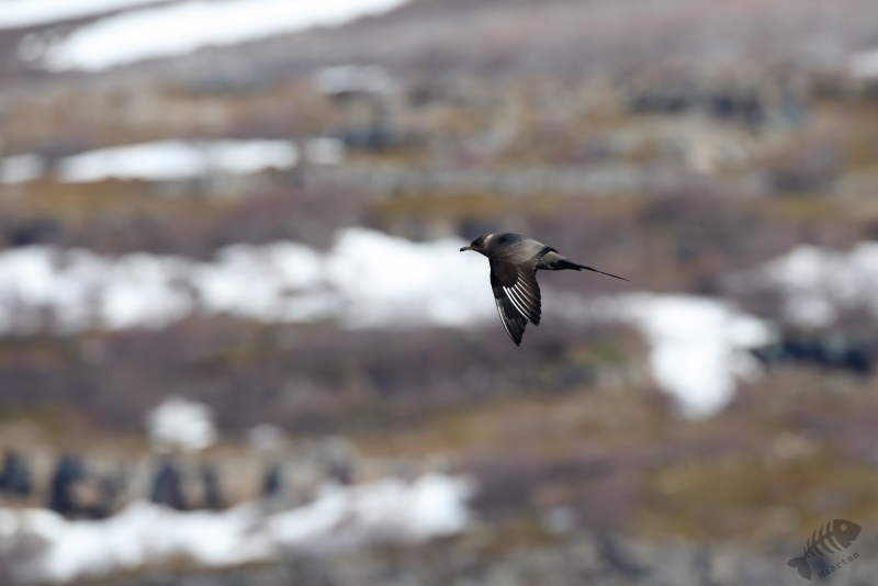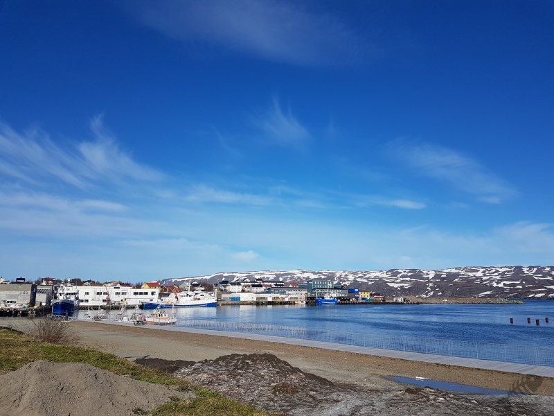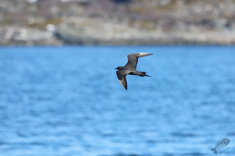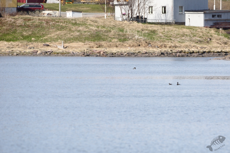 Daarna zijn we doorgereden tot Båtsfjord. Nét voor Båtsfjord ligt een “meertje”, wat de bodem van het fjord is, en Anders wist dat daar ook nog wel eens leuke vogels te zien kunnen zijn. Zeker Meeuwen als de beide Burgermeesters wilden hier nog wel eens zitten. We reden om het water heen en parkeerden de auto naast een boerenschuur. Al snel zag ik dat er IJseenden en Kuifeendjes rondzwommen en dat is altijd leuk. Maar toen ik het water verder afzocht, kreeg ik een Duiker in beeld. Hij zat behoorlijk ver weg, maar ik kon het toch wel aardig zien. Het bleek niet een Roodkeelduiker te zijn (die we net even hiervoor nog wel gezien hadden), maar een Parelduiker! Hoppa, zomaar deze prachtige vogel erbij. Ik had er ooit eerder in Schotland 1 gezien, en vond het geweldig er hier, na 12 jaar, weer eens 1 te zien. In eerste instantie zat ook hij wat ver weg, maar na een behoorlijke tijd wachten kwam hij beetje bij beetje dichterbij. Zo lukte het dan toch ook deze geweldenaar mooi vast te leggen. Daarna zijn we weer ingestapt om echt naar Båtsfjord te gaan (Anders had geen bijzondere Meeuwen kunnen vinden). Toen we het water weer gerond hadden, en de brug overstaken zaten aan de fjordkant 2 Roodkeelduikers niet ver uit de kant. Tja, die kon ik natuurlijk niet zomaar laten zwemmen… Dus weer gestopt, foto’s gemaakt en toen dan echt door naar de haven. We reden meteen door naar een plek in de haven waar een visverwerkingsbedrijf zat. We stonden er nog niet en de eerste Kleinste Jagers vlogen ons al om de oren! Ze kwamen af op het visafval en vlogen op maar een paar meter van ons vandaan. De focus heb ik het meest op deze Jagers gelegd, maar er vlogen ook Kleine Jagers en Drieteenmeeuwen rond. En dan kan ik het dus niet laten om te proberen geslaagde vliegbeelden te maken. Juist omdat ze zo dichtbij vlogen was dit weer een behoorlijke uitdaging, maar als ik nu naar de plaatjes kijk, ben ik best tevreden. Na nog 2 snelle kiekjes van Drieteenmeeuwen op hun nest op een havengebouw, zijn we weer verder gereden richting het noorden. Het leek niet per se een heel interessant gebiedje, maar het was mogelijk dat hier Beflijsters zouden zitten. Jammer maar helaas: die hebben we niet gezien, wel nog een Blauwborst op een wel heel lelijke elektriciteitsdraad, en daar bleef het bij. Ik heb nog een paar foto’s van het plaatsje en het fjord gemaakt en toen hebben we de terugreis weer aangevangen.