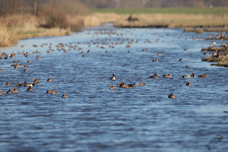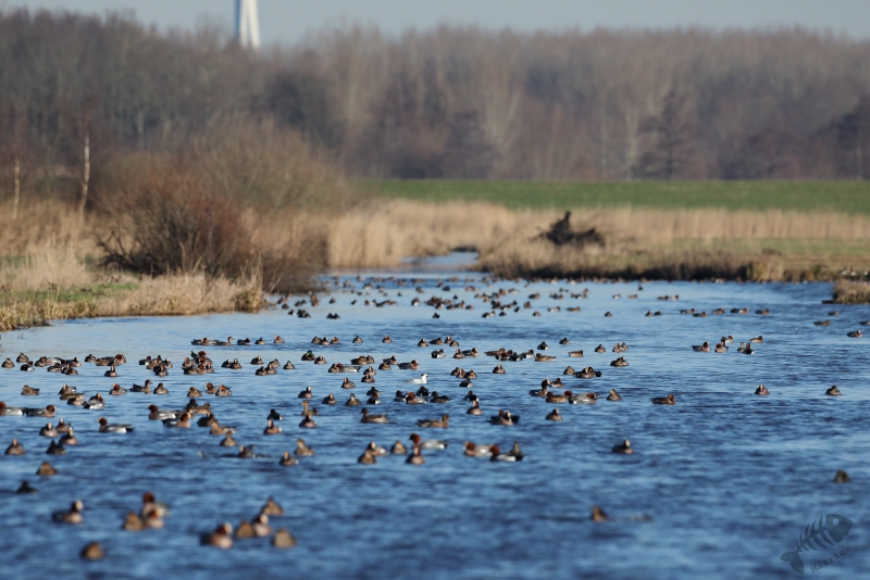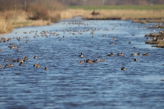Daarom ben ik vandaag maar weer eens in de auto gestapt en ben ik naar de oude, vertrouwde Arkemheense Polder gereden om maar weer eens rustig te beginnen. Ik hoopte in ieder geval Nonnetjes te zien en voor de rest alles wat maar voor de lens wilde komen. Als eerste ben ik de polder ingereden om het Nekkeveld af te rijden. In het open water willen nog wel eens interessante soorten zitten en dat bleek ook nu weer het geval. Op het Wiel zaten weer 10-tallen, zo niet 100derden Smienten en vond ik inderdaad een vreemde Eend in de Bijt. Heel in de verte zat een mannetjes Nonnetje. Ik heb snel wat plaatjes gemaakt, maar tot m’n verbazing steeg hij op uit het water en vloog min of meer recht op me af! Het ging allemaal zo snel dat ik hier geen redelijke plaatjes van kon maken, maar gelukkig landde hij achter mij in de vaart en kreeg ik toen alsnog de kans hem aardig vast te leggen, al werkte het licht niet mee…