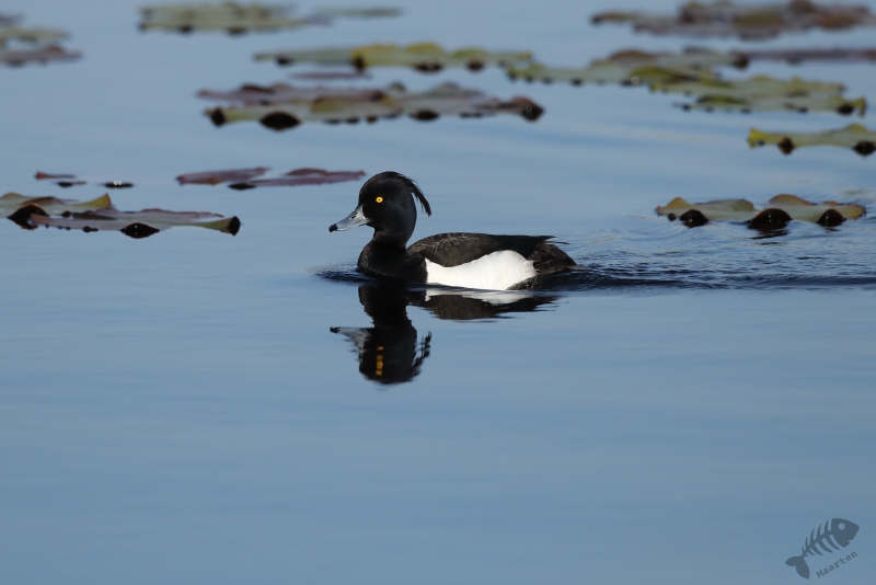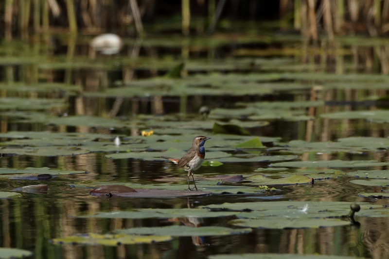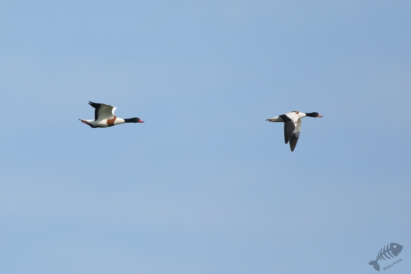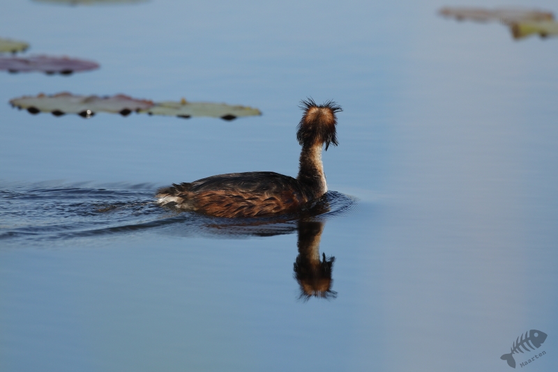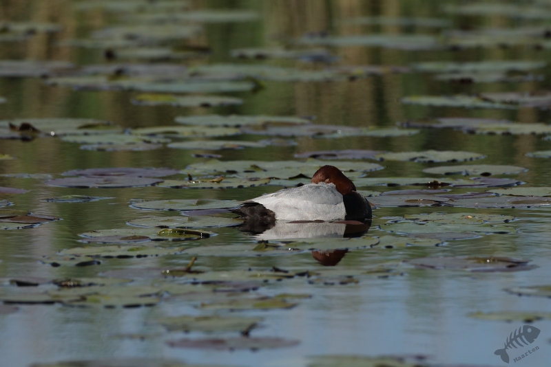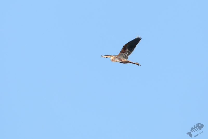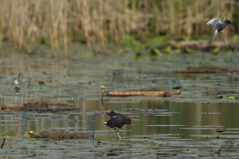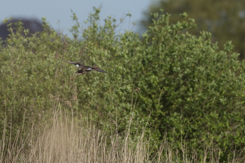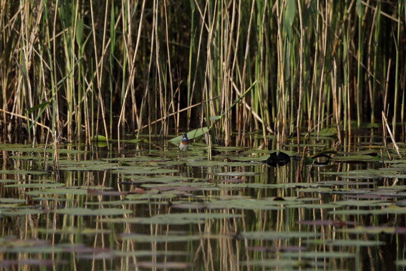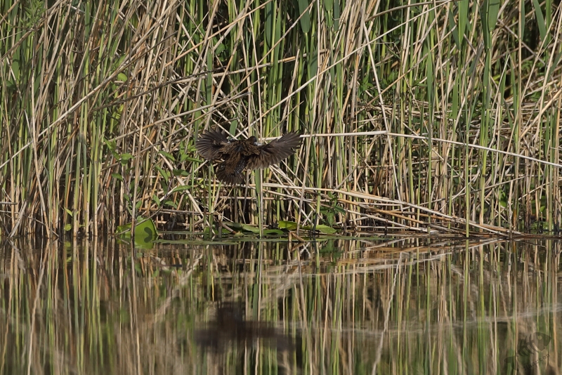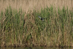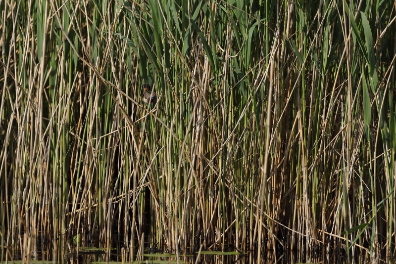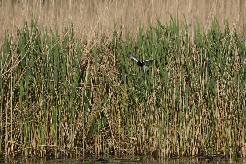 Maar gelukkig zijn er altijd de vogels die voor afleiding kunnen zorgen en ik heb me daar dan ook heerlijk mee bezig gehouden. En de M-stand werkte! De lichtomstandigheden bleven de hele tijd gelijk, het was heel zonnig zonder enige wolk aan de hemel, waardoor ik nauwelijks de eerst gekozen instellingen hoefde te wijzigen, precies zoals Arie in de workshop had uitgelegd. En het werkte inderdaad veel rustiger. Of ik nou omhoog tegen de lucht Bergeenden fotografeerde, of een Fuut of Kuifeend op het water, of Witvleugelsterns tegen het riet, de belichting was de hele tijd goed (Met de zon in de rug. Arie had tijdens de workshop ook uitgelegd dat, áls je meer tegen het licht in ging fotograferen, je de belichting zo’n 2 stops moest verhogen.). De vogelaar/o.h. negerend, heb ik mooie plaatjes weten te schieten van de 2 soorten Sterns en een zich Jacana-wanende Blauwborst. Wat ik heel leuk vond, was dat ik ineens iets voorbij zag vliegen en in het riet zag verdwijnen. Ik heb er snel wat foto’s van kunnen maken en wat ik al vermoedde bleek te kloppen: het was een een Waterral die in het riet verdween. Omdat ik net bezig was met een Zwarte Stern tegen de lucht, zou ik waarschijnlijk te laat zijn geweest als ik mijn oude techniek had gebruikt, maar nu was ik perfect op tijd voor de Ral.