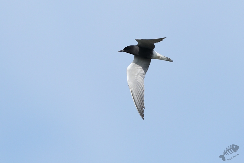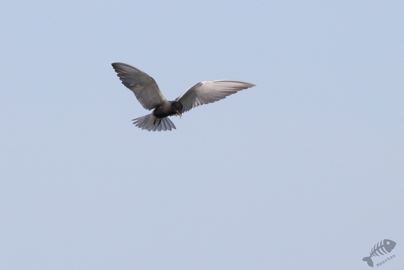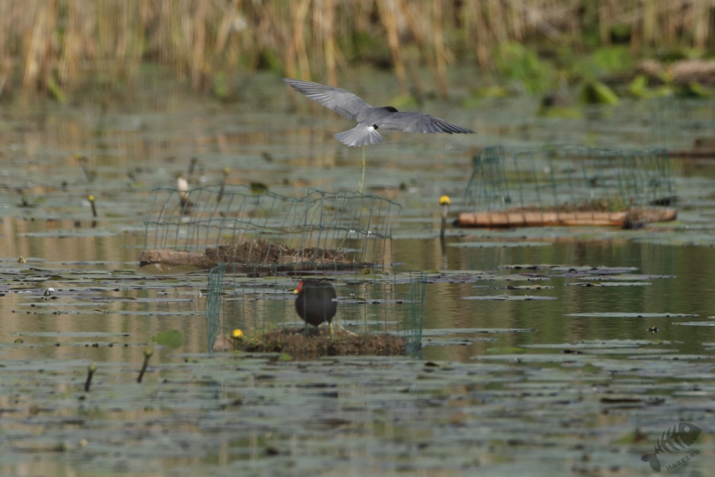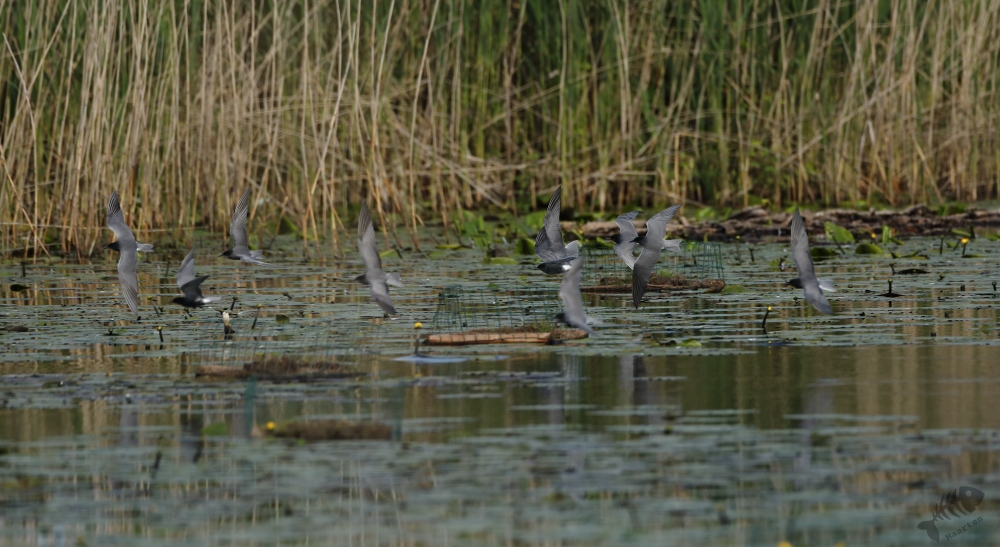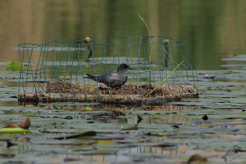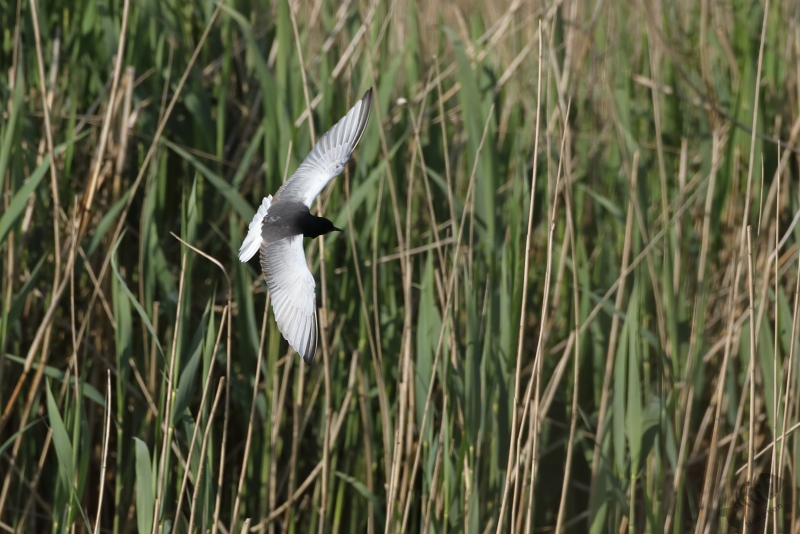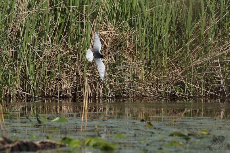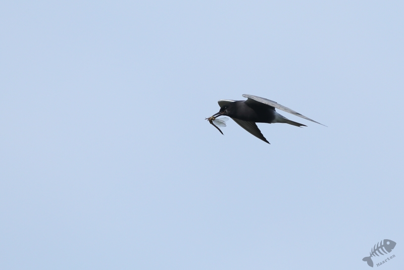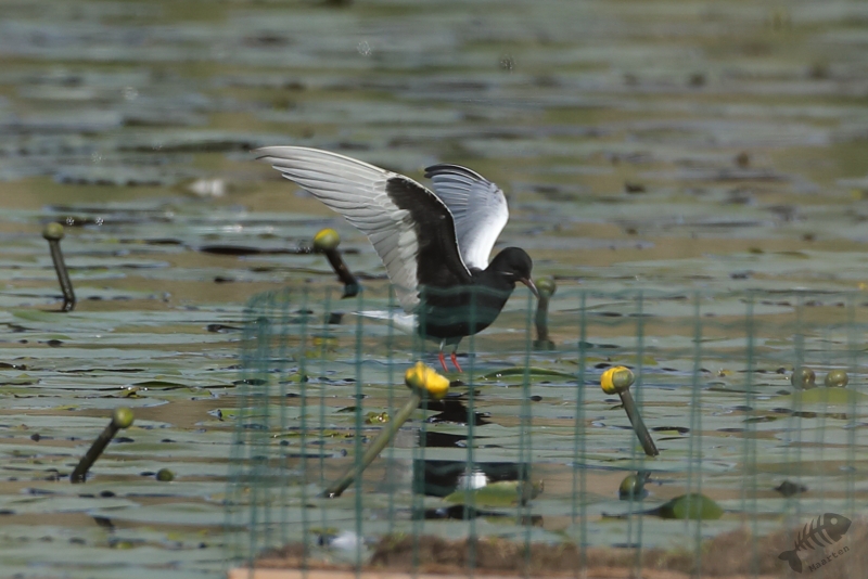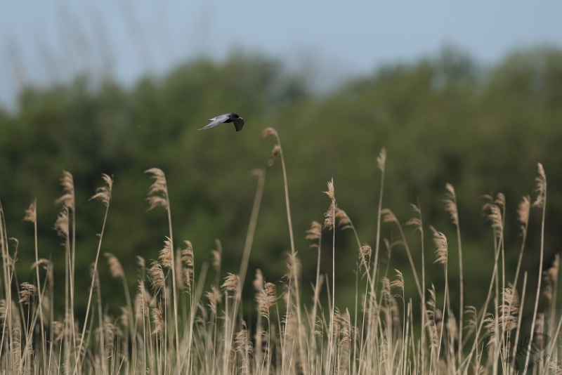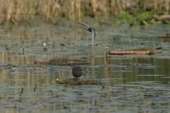 Om iets voor 9 kwam ik aan bij de vlonder, maar ik bleek niet de enige/eerste te zijn (wat op de parkeerplaats al duidelijk was geworden). De hele vlonder stond vol met vogelaars en vogelfotografen waardoor ik maar besloot te beginnen vanaf het fietspad. Het ging me toch niet om close-ups en aangezien de Zwarte Sterns ook met regelmaat over de vlonder heen vlogen, zou ik mijn kansen toch wel krijgen. Allereerst stelde ik de belichting in op de bloemen van het Fluitekruid wat er langs het fietspad stond. Die bloemen waren het lichtste object in de buurt en daarmee zou het wit van de Sterns dus ook goed van belichting moeten zijn. En toen moest ik dus wachten… Ik begon met een Bruine Kiekendief en Purperreiger. De Sterns bleven wat op afstand dus daar moest ik nog even op wachten. Op een gegeven moment kwam er een vogelaar aanlopen en die wachtte niet af of er plek op de vlonder zou komen, maar ging er als vanzelfsprekend zitten. Het bleek dat deze man graag aan anderen wilde laten weten wat hij van het gebied wist, vogels in het algemeen, zeldzaamheden in de rest van Nederland, fotoresultaten wilde laten zien en dus ontzettend graag aan het woord was. Ik heb mijn best gedaan hem te negeren, want ik vind het niet nodig continue in gesprek te zijn als ik aan het vogelen ben, wat in het begin nog wel lukte omdat ik op een afstandje stond (noodgedwongen), maar toen er weer wat ruimte op de vlonder kwam, werd het wel lastig…