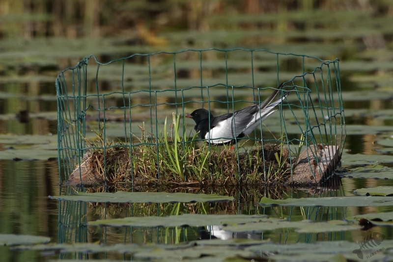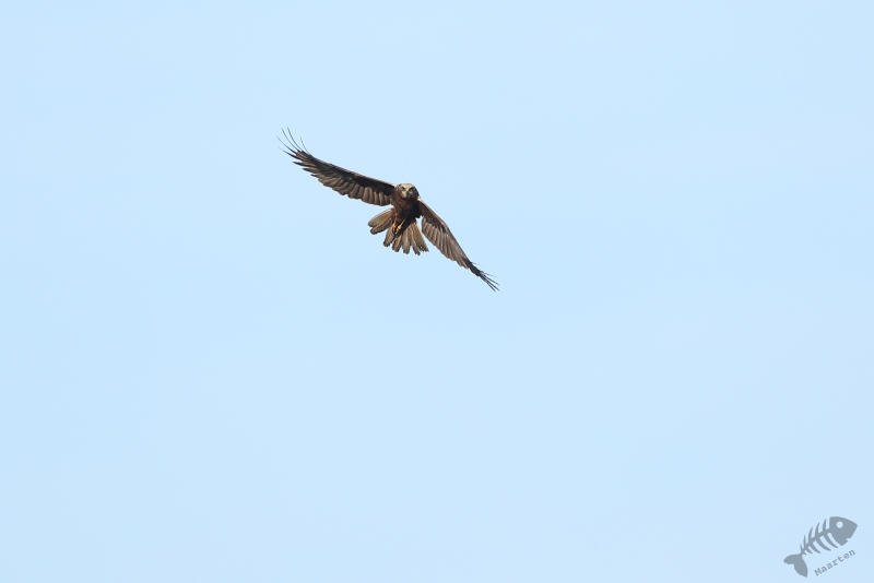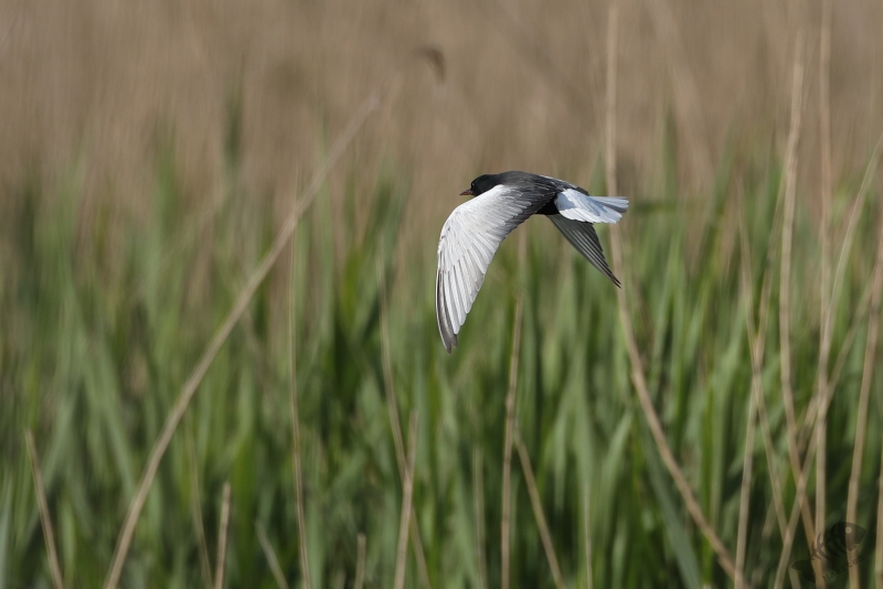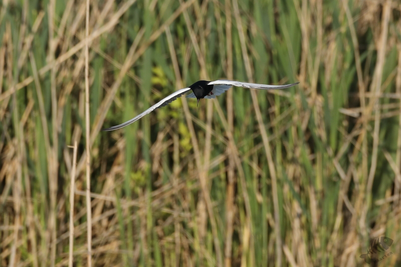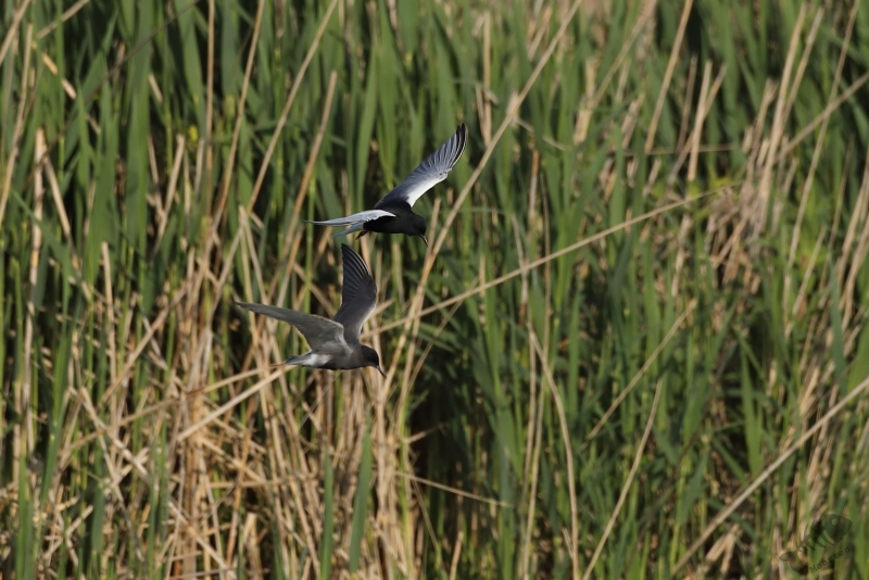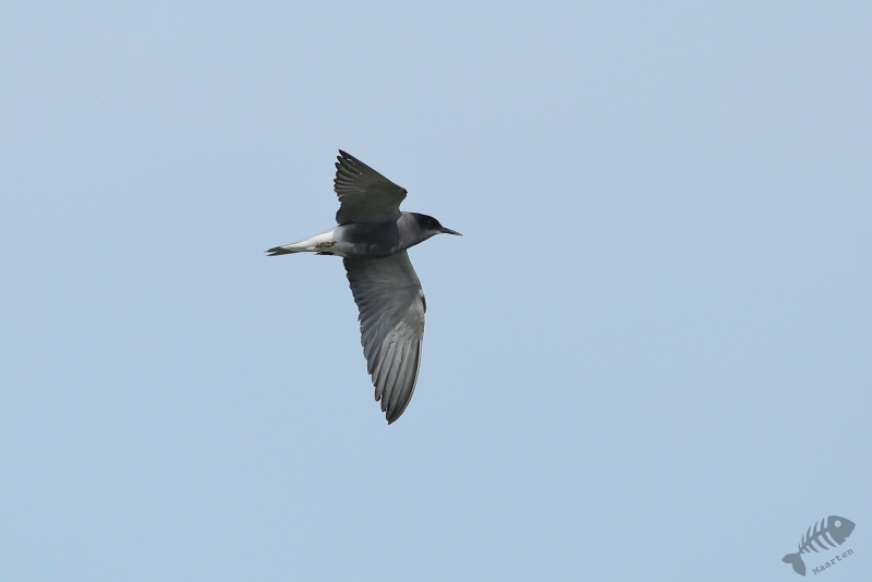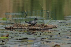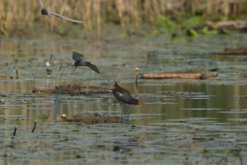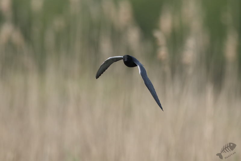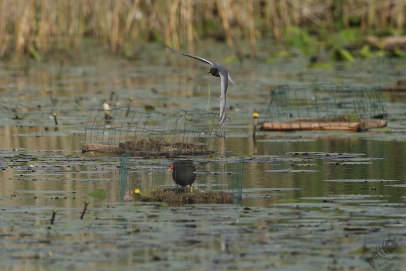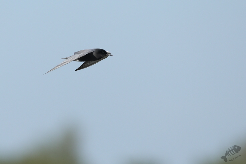 Om iets voor 9 kwam ik aan bij de vlonder, maar ik bleek niet de enige/eerste te zijn (wat op de parkeerplaats al duidelijk was geworden). De hele vlonder stond vol met vogelaars en vogelfotografen waardoor ik maar besloot te beginnen vanaf het fietspad. Het ging me toch niet om close-ups en aangezien de Zwarte Sterns ook met regelmaat over de vlonder heen vlogen, zou ik mijn kansen toch wel krijgen. Allereerst stelde ik de belichting in op de bloemen van het Fluitekruid wat er langs het fietspad stond. Die bloemen waren het lichtste object in de buurt en daarmee zou het wit van de Sterns dus ook goed van belichting moeten zijn. En toen moest ik dus wachten… Ik begon met een Bruine Kiekendief en Purperreiger. De Sterns bleven wat op afstand dus daar moest ik nog even op wachten. Op een gegeven moment kwam er een vogelaar aanlopen en die wachtte niet af of er plek op de vlonder zou komen, maar ging er als vanzelfsprekend zitten. Het bleek dat deze man graag aan anderen wilde laten weten wat hij van het gebied wist, vogels in het algemeen, zeldzaamheden in de rest van Nederland, fotoresultaten wilde laten zien en dus ontzettend graag aan het woord was. Ik heb mijn best gedaan hem te negeren, want ik vind het niet nodig continue in gesprek te zijn als ik aan het vogelen ben, wat in het begin nog wel lukte omdat ik op een afstandje stond (noodgedwongen), maar toen er weer wat ruimte op de vlonder kwam, werd het wel lastig…