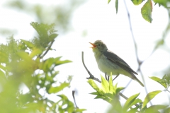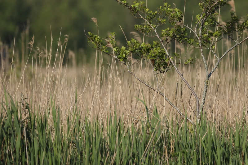 Na zo’n 3 uur hield ik het voor gezien op de vlonder. Ik had nog 1 wens voor vandaag en wilde kijken of ik die in vervulling kon laten gaan. Ik had gezien dat vlak bij “Huisje de Kikker” een Spotvogel zou moeten zitten en daar wil ik graag wat tijd voor vrijmaken. In een boompje in de buurt van het huisje hoorde ik hem inderdaad. In eerste instantie liet hij zich niet zien, maar gelukkig ging hij na een tijdje boven in de boom zitten en zat hij redelijk vrij. Hij zat wel pal tegen het licht in, dus heb ik de 2-stops regel van Arie toegepast. Ook dit ging prima en zo lukte het ook nog 1 van mijn favoriete soorten prachtig vast te leggen. Regelmatig kwamen er mensen bijstaan terwijl ik daar bezig was en ook zij wilden graag praten. Tot mijn verbazing (of misschien ook wel niet), wilde een redelijk aantal van de mensen, allemaal bewapend met een riante telelens en behoorlijk dure spullen, weten waarnaar ik stond te kijken. Ze herkenden de zang niet eens..! Anderen wilden me doen geloven dat zij de perfecte plek hadden om hem te zien, terwijl ze me toch echt bezig hebben moeten zien met het maken van m’n foto’s…