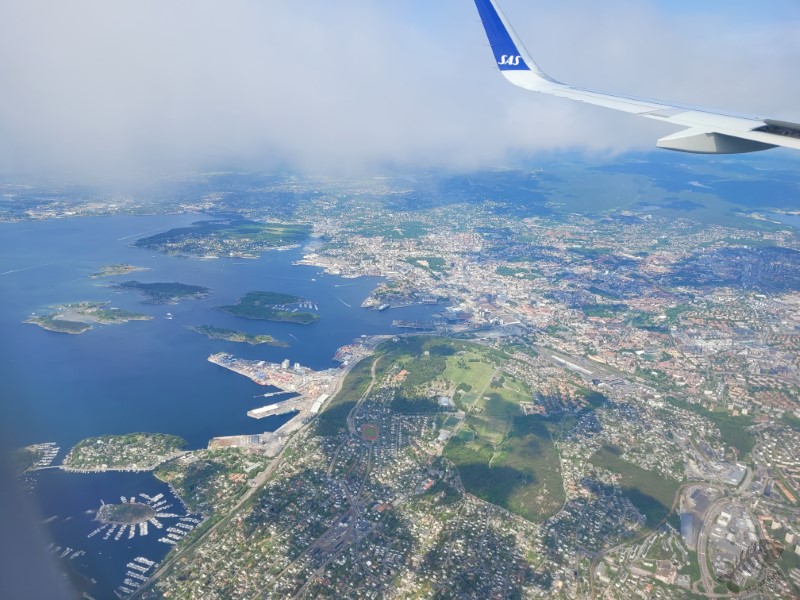 Maar ja, zover was het nog niet. Eerst moest ik er nog komen… Om iets voor 11 taxiede het vliegtuig naar de startbaan en zo’n 10 minuten later kliefde het vliegtuig de wolken om uit te komen onder een strakblauwe lucht. Een uur later bereikten we de zuidkust van Noorwegen en na weer eens 20 minuten vlogen we boven Oslo. Dit was de eerste keer dat ik de stad in de diepte zag liggen en ik was in de gelegenheid om een paar foto’s te maken. Toen ik de foto’s wat beter kon bekijken, bleek het dat ik echt het centrum vast heb kunnen leggen. Ik ben een grote liefhebber van het lezen van Scandinavische thrillers en in verschillende van deze boeken komt Oslo voor en worden er kenmerkende gebouwen genoemd. Op de foto’s kon ik een aantal van deze gebouwen terugvinden! Hoe leuk is dat? Ik heb een kaartje van Google Maps toegevoegd om een paar van deze gebouwen te markeren.