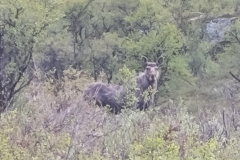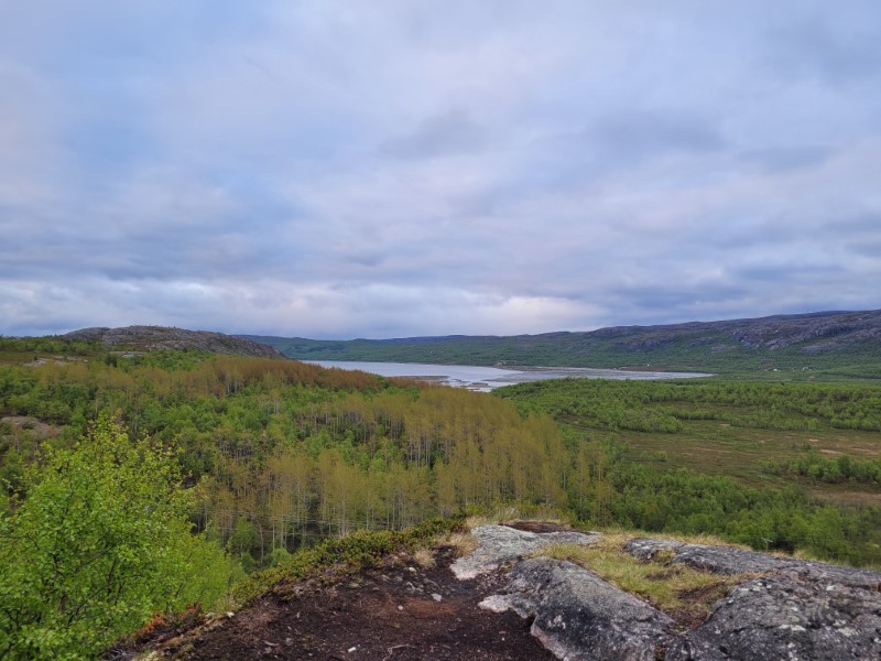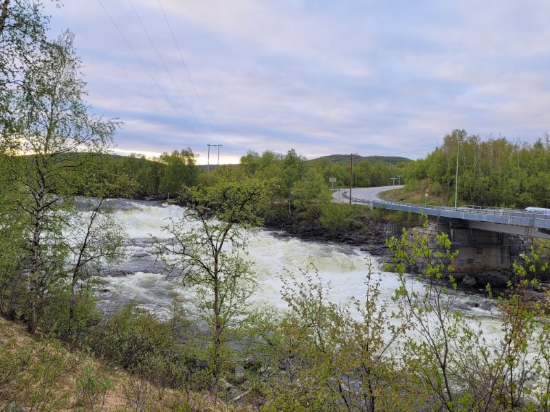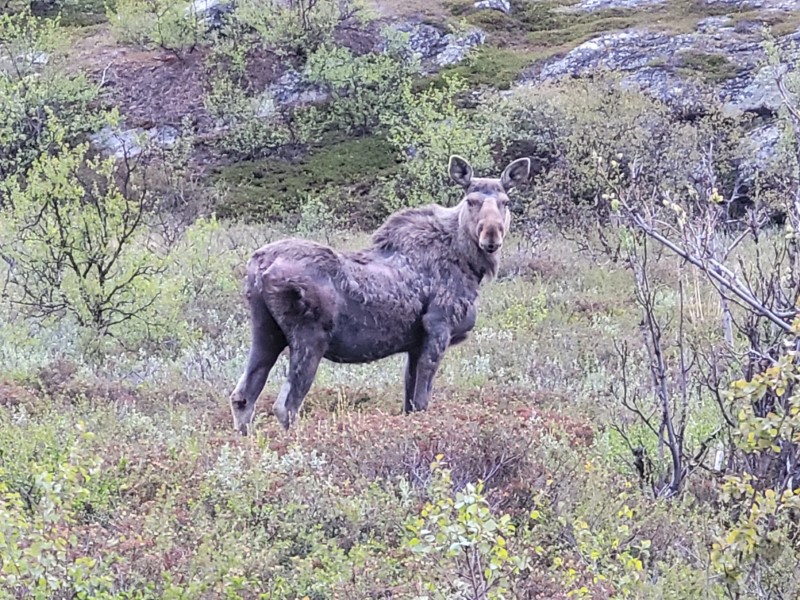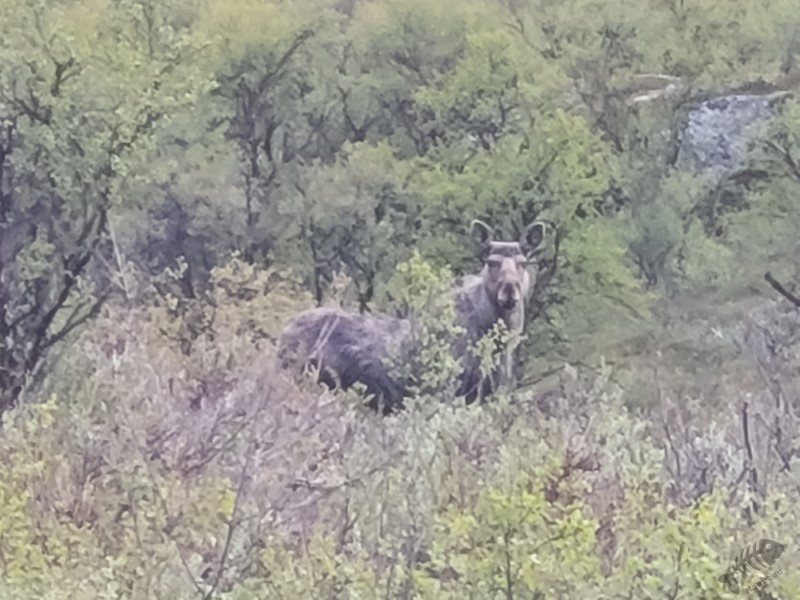 Het was prachtig weer: bewolkt maar met een zonnetje erdoorheen en m’n “roadtrip” naar het Schiereiland verliep voorspoedig. De eerste stop maakte ik bij m’n vaste plek met uitzicht over het Munkefjord. De Berken kleurden alweer redelijk groen en ik had een prachtig uitzicht over het fjord. Maar ik kon niet te lang stilhouden, want ik had nog een heel stuk te gaan. Ondanks dat stopte ik natuurlijk nog wel bij de Skoltefossen in de Njávdánjohka die uitkomt in het Munkefjord. Elke keer dat ik hier kom (en dit is de 3de keer in het voorjaar) vind ik het weer een machtig gezicht om te zien met wat voor een geweld het water naar beneden stort. Maar ik moet door… Ik wist te herinneren dat er niet heel veel meer plaatsen zouden komen waar ik per se wilde stoppen, dus ik kon even een lekker stukje opschieten. Na zo’n half uur kreeg ik een eerste zicht op het Varangerfjord en in het licht van de zakkende zon was dat werkelijk prachtig. Ik móest dit daarom toch wel even vastleggen. En verder… Na weer een kwartier rijden kreeg ik aan de linkerkant van de weg iets in het oog. Ik ben langzaam gaan rijden, de borden waarschuwen niet voor niets voor overstekend wild, al had ik nog nooit iets gezien behalve wat Schapen en Rendieren, en langzaam verscheen er een groot bruin dier uit de berm… En daar stak dus ineens een Eland de weg over! Een Eland! Deze had ik nog nooit gezien en nu kon ik hem (of haar) bewonderen terwijl hij heel rustig voor mij de weg overstak. Ik probeerde vanuit de auto wat foto’s te maken, wat jammerlijk mislukte, en dacht dat daarmee m’n kans op een foto wel verkeken was. Maar niets was minder waar: de Eland liep iets verder en bleef in eerste instantie staan beschut door wat struikjes. Ik kon een heel klein stukje verder rijden waarbij de Eland gewoon bleef staan en zo kreeg ik een prachtig zicht op dit imposante dier. Wat een kik! Ik heb het dier verder met rust gelaten en ben heel rustig weer verder gereden. Ik naderde het Varanger schiereiland en wilde zo langzamerhand wel naar m’n hostel. Maar ik moest nog een stukje…