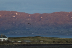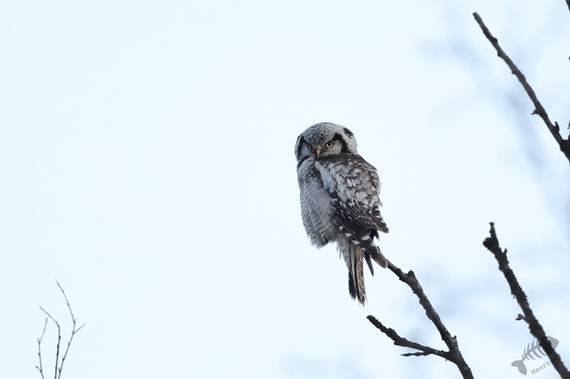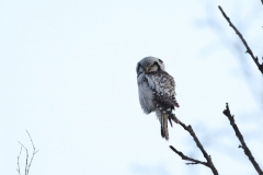 Bij Varangerbotn rondde ik de westelijke punt van het Varangerfjord en vandaar is het op de rotonde naar rechts, richting het oosten, richting Vestre Jakobselv. Het was inmiddels kwart voor 11 in de avond maar het was nog behoorlijk licht. Hierdoor viel nét na Varangerbotn op dat er iets bovenin een kaal boompje zat. Het zou toch niet waar zijn..? Maar wel, het was wel waar! In de top van een kale Berk zat een Sperweruil me een beetje aan te kijken. Wat een begin! Het lukte me er enkele foto’s van te maken waarna ik snel weer in de auto ben gaan zitten in de hoop misschien nog wel meer Uilen te gaan zien. Het uur én het terrein van de Velduilen moest nog komen… Maar helaas: het bleef bij deze ene geweldige Uil waardoor ik ongestoord door kon rijden tot Nesseby.