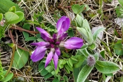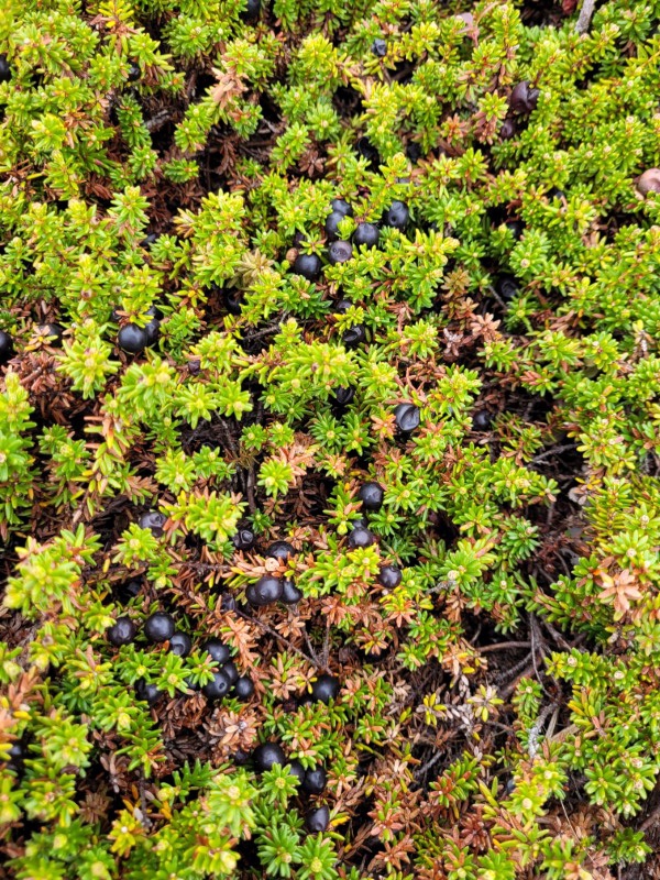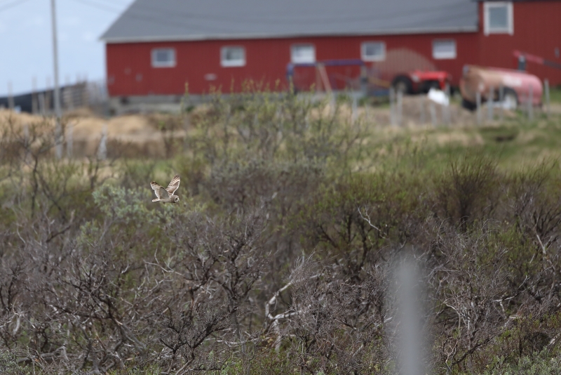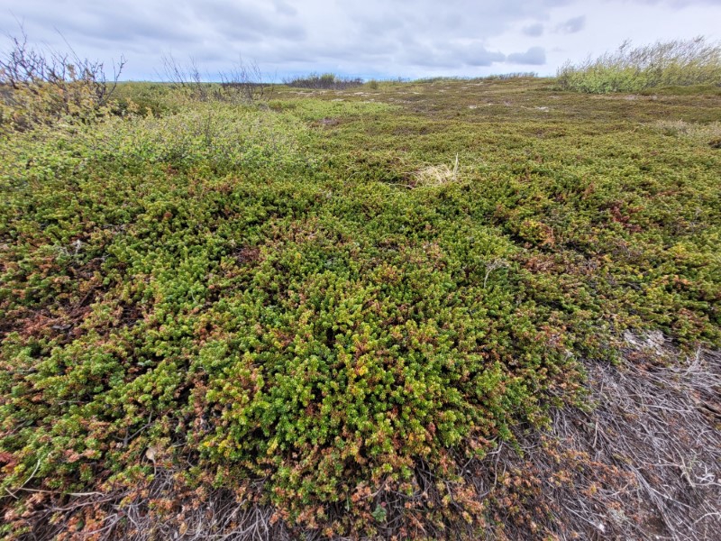 Maar ja: ik kwam natuurlijk niet echt voor de architectuur van Noorwegen, of Varanger in het bijzonder, dus ben ik weer naar de auto gelopen en ben weer naar Ekkerøy gereden om daar iets verderop bij de gebouwtjes de auto neer te zetten en m’n geluk te beproeven. Omdat de Velduil niet thuis leek, heb ik eerst het wandelpad afgelopen. Op deze tocht kwam ik, buiten een (de?) Ruigpootbuizerd, geen enkele vogel tegen en heb ik de flora van Varanger maar eens wat nauwkeuriger in beeld gebracht. Eénmaal in Nederland zoek ik dan de soorten op die ik gezien heb, wat nog niet altijd even makkelijk is. Eén van de soorten die een verrassing bleek te zijn, was de Kraaiheide. De lage, struikachtige begroeiing waarmee het hele schiereiland volstaat. Ik meende dat het een bessensoort (zoals Veenbes of Bosbes) zou zijn, maar het bleek dus iets heel anders te zijn. De besjes maken trouwens wel even hardnekkige vlekken als de andere bessensoorten… Maar ja, ik kwam natuurlijk niet écht voor de Flora, dus ben ik weer teruggelopen om bij de gebouwtjes te gaan staan en te kijken of de Uil misschien toch wilde komen.