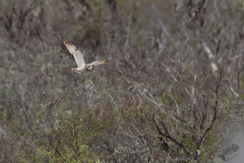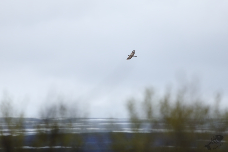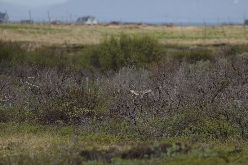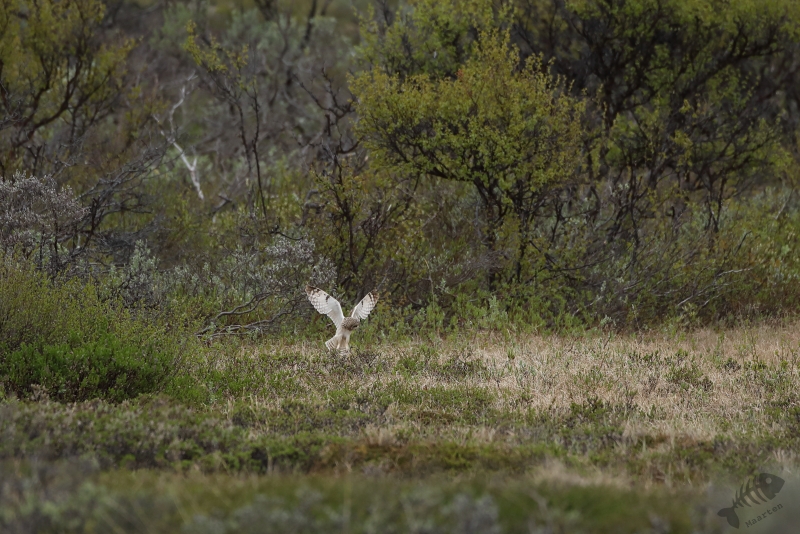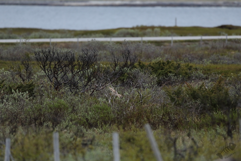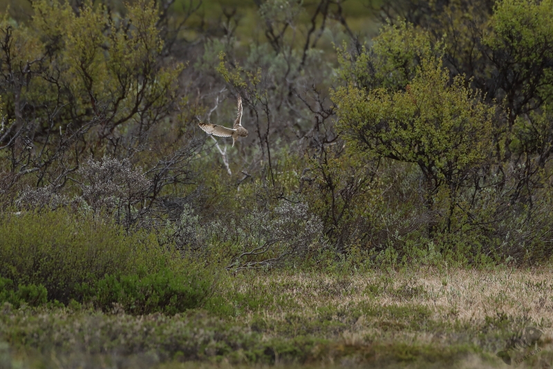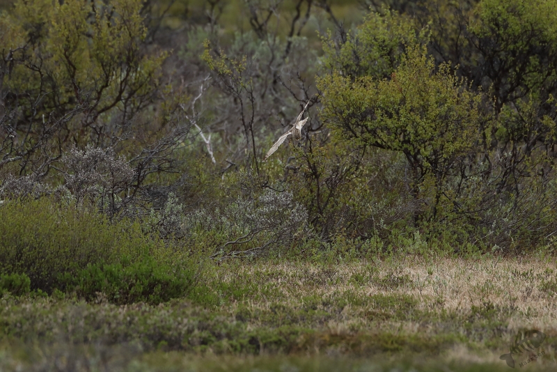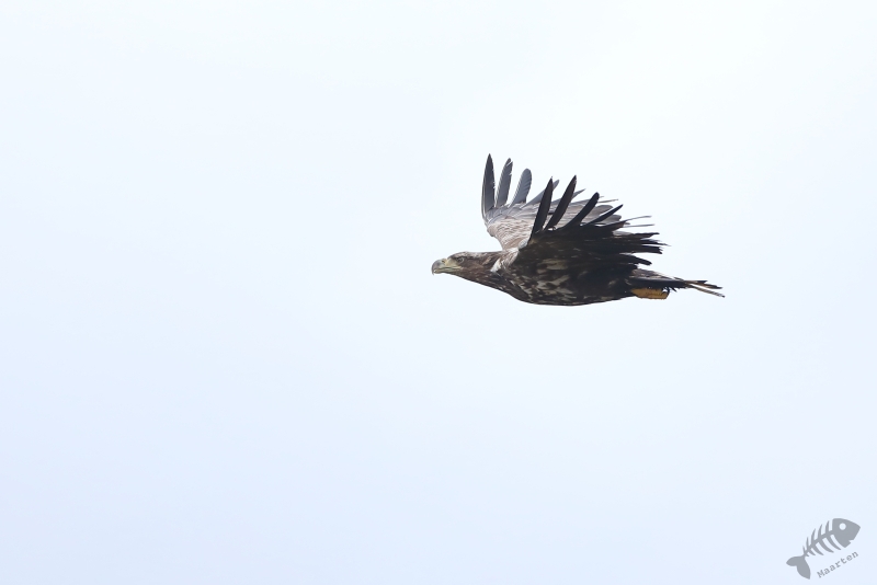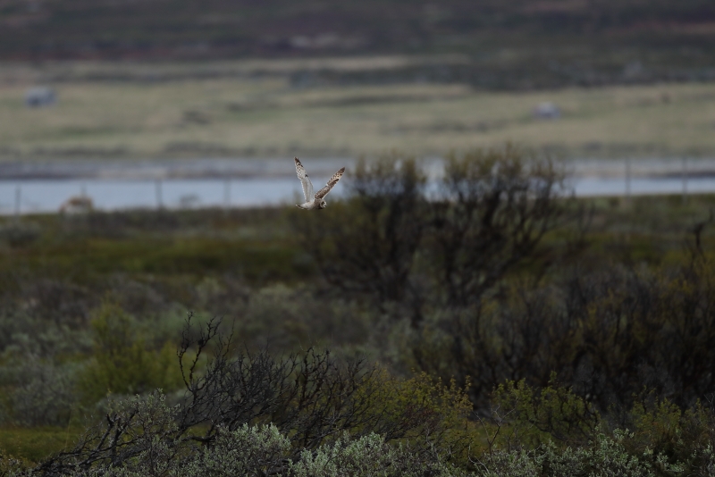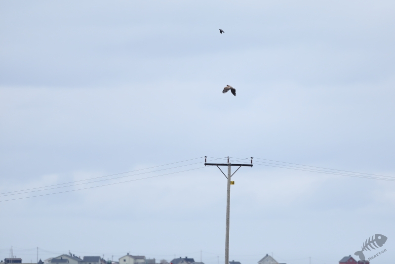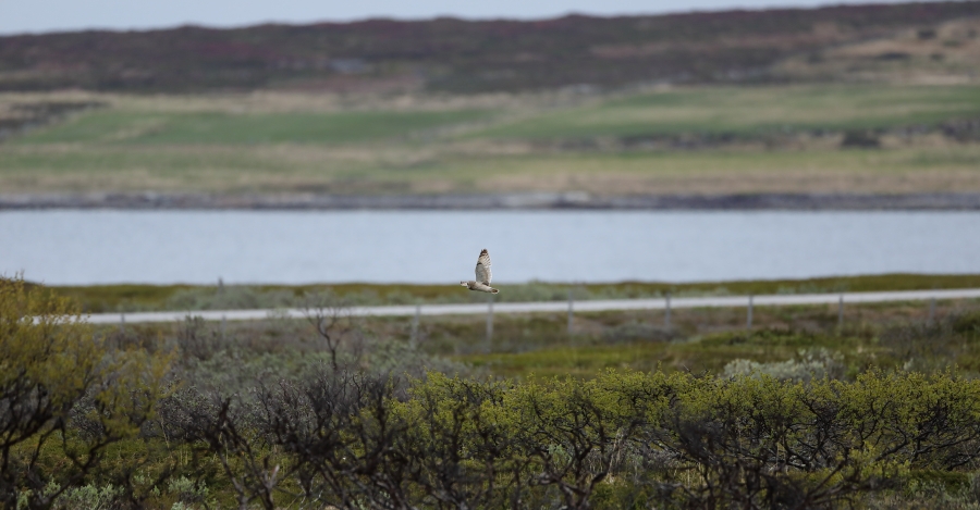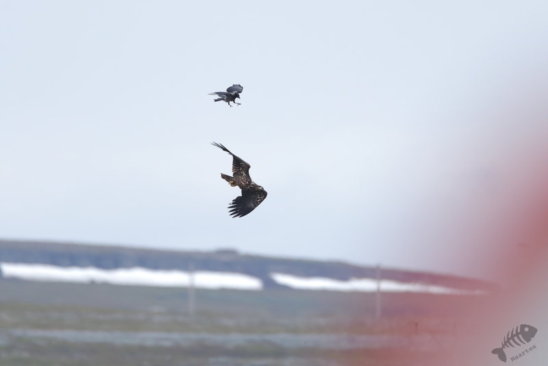 Het weer was wel wat minder geworden: het waaide hard en af en toe miezerde het ook, maar voor het licht was dit eigenlijk wel weer heel mooi. Er hing een heel mooi “gedempt” licht, dus wat mij betreft mochten de vogels komen! En hij kwam! Om iets voor 2 uur zag ik de lichte schim tussen de struiken vliegen, net als ik gisteren had gezien. Ik had dus verder geen plannen voor vandaag en daarom heb ik gewoon kunnen staan afwachten of ik dit prachtige dier nog wat mooier zou kunnen zien. En het geluk was aan mijn kant: de Uil (of misschien wel Uilen) kwam verschillende keren jagen boven het terreintje en ik kreeg de gelegenheid hem in allerlei poses vast te leggen. Soms van dichterbij, soms met het Fjord als achtergrond maar altijd even mooi. Ik denk dat ik toch wel mag zeggen dat dit écht 1 van mijn lievelingsdieren is… Op het moment dat de Velduil zich even niet liet zien, hoefde ik mij nog niet te vervelen. Om mij heen hoorde en zag ik voldoende om de tijd door te komen. Wat ik bijna continue hoorde was een soort roep, hoog vanuit de lucht. De maker van het geluid kreeg ik maar niet in beeld, maar ik had het vermoeden dat het een Snip-achtige zou kunnen zijn. Ik hoopte nog steeds een Bokje te zien hier op Varanger, maar ik had dat geluid thuis al een keer opgezocht (een soort “in de verte galopperend paard…” volgens de ANWB Vogelgids van Europa) en dat was dit niet. Het moest dus haast wel een Watersnip zijn, maar omdat ik hem niet zag én het geluid niet (her)kende, wist ik het niet 100% zeker. Gelukkig is een Zeearend op niet al te grote afstand wel makkelijk te herkennen en kreeg ik dit jonge exemplaar mooi in beeld.