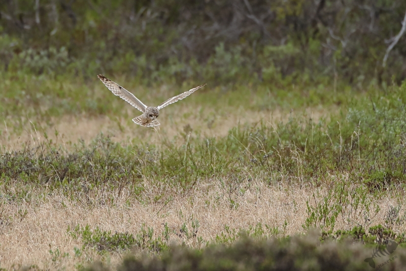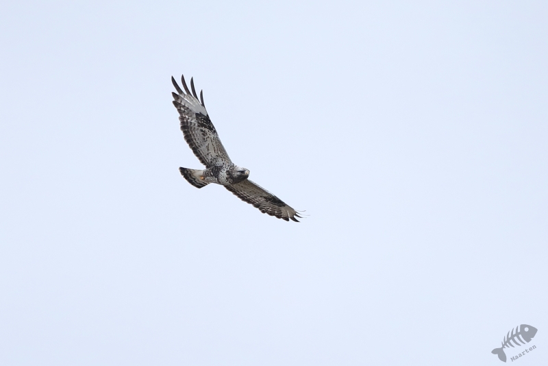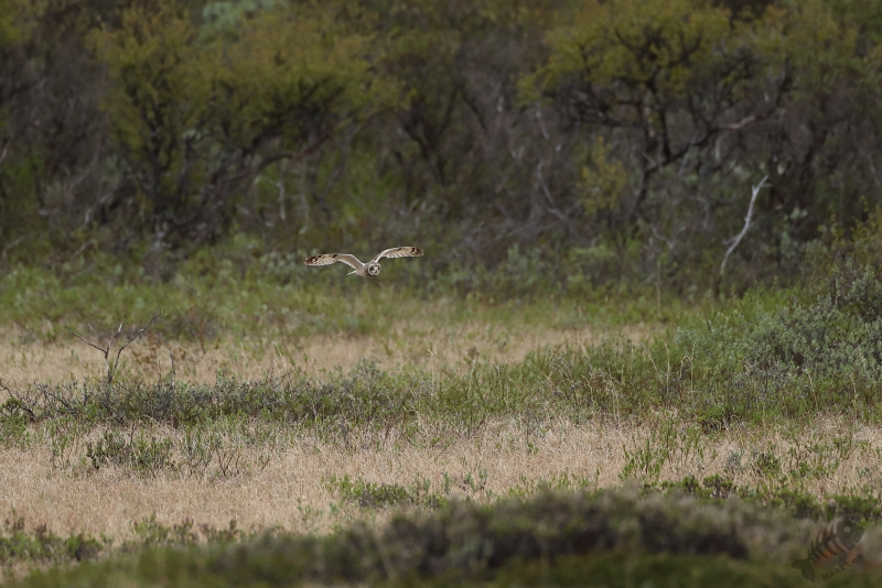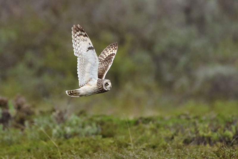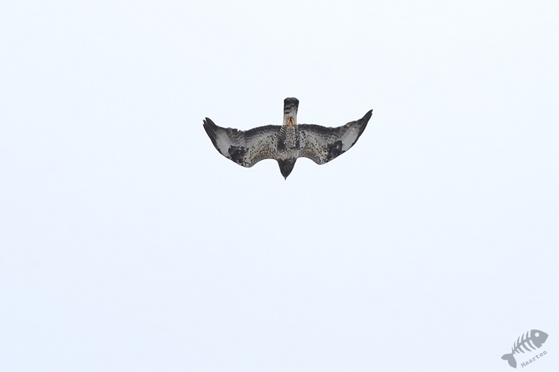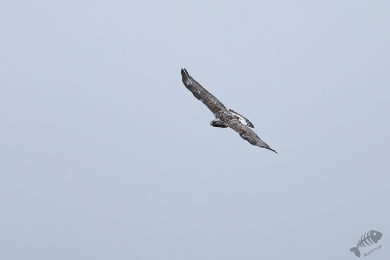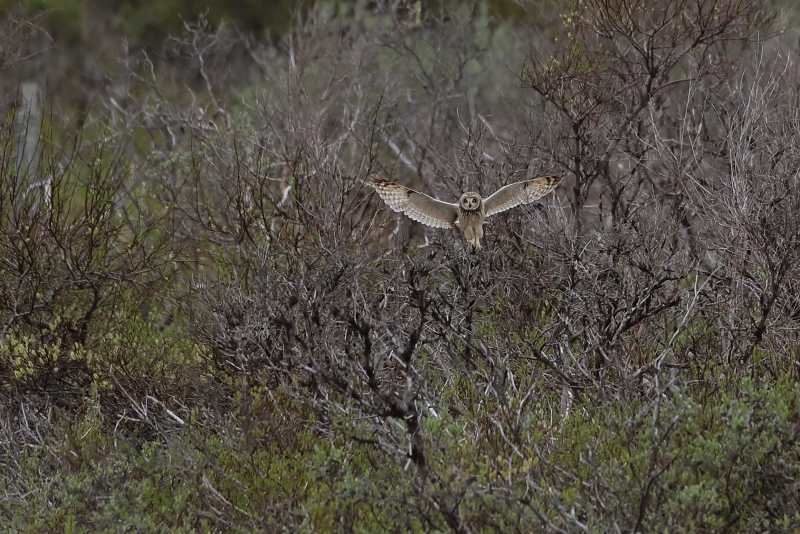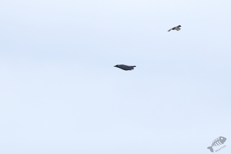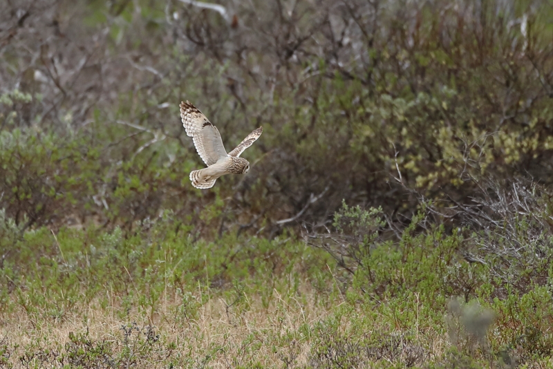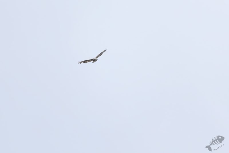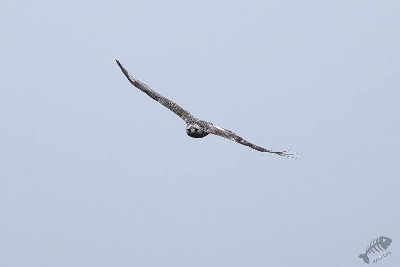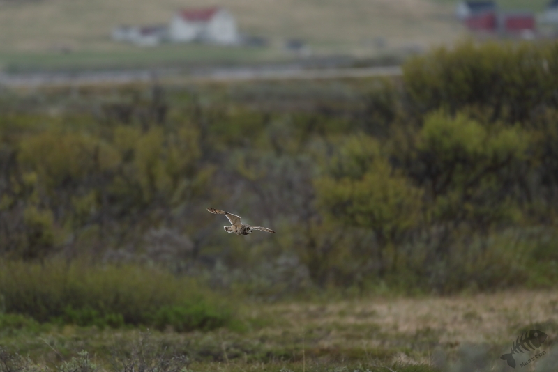 Het weer was wel wat minder geworden: het waaide hard en af en toe miezerde het ook, maar voor het licht was dit eigenlijk wel weer heel mooi. Er hing een heel mooi “gedempt” licht, dus wat mij betreft mochten de vogels komen! En hij kwam! Om iets voor 2 uur zag ik de lichte schim tussen de struiken vliegen, net als ik gisteren had gezien. Ik had dus verder geen plannen voor vandaag en daarom heb ik gewoon kunnen staan afwachten of ik dit prachtige dier nog wat mooier zou kunnen zien. En het geluk was aan mijn kant: de Uil (of misschien wel Uilen) kwam verschillende keren jagen boven het terreintje en ik kreeg de gelegenheid hem in allerlei poses vast te leggen. Soms van dichterbij, soms met het Fjord als achtergrond maar altijd even mooi. Ik denk dat ik toch wel mag zeggen dat dit écht 1 van mijn lievelingsdieren is… Op het moment dat de Velduil zich even niet liet zien, hoefde ik mij nog niet te vervelen. Om mij heen hoorde en zag ik voldoende om de tijd door te komen. Wat ik bijna continue hoorde was een soort roep, hoog vanuit de lucht. De maker van het geluid kreeg ik maar niet in beeld, maar ik had het vermoeden dat het een Snip-achtige zou kunnen zijn. Ik hoopte nog steeds een Bokje te zien hier op Varanger, maar ik had dat geluid thuis al een keer opgezocht (een soort “in de verte galopperend paard…” volgens de ANWB Vogelgids van Europa) en dat was dit niet. Het moest dus haast wel een Watersnip zijn, maar omdat ik hem niet zag én het geluid niet (her)kende, wist ik het niet 100% zeker. Gelukkig is een Zeearend op niet al te grote afstand wel makkelijk te herkennen en kreeg ik dit jonge exemplaar mooi in beeld.