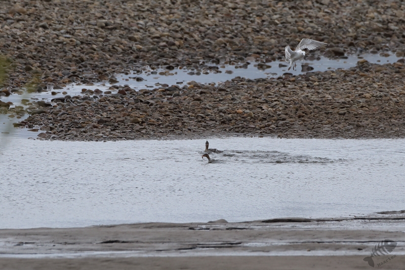 Ik ben eerst naar de shelter van Biotope aan de Jakobselv gereden om de rivier af te speuren. Daar bleef het beperkt tot een paartje Middelste Zaagbekken op grote afstand en een Tureluur op minstens even grote afstand. De Tureluur bracht me wel op het idee om bij de monding van de Jakobselv te gaan kijken. De vorige keer dat ik er geweest was, zaten er best heel leuke soorten, dus was het in ieder geval de moeite waard het te gaan bekijken.
