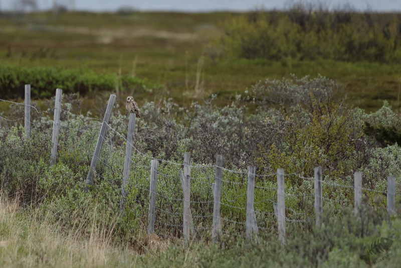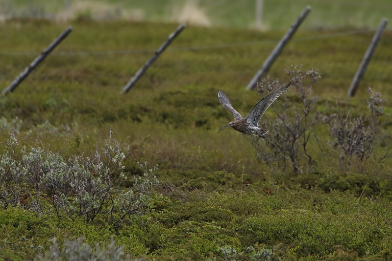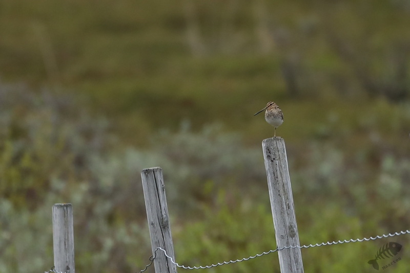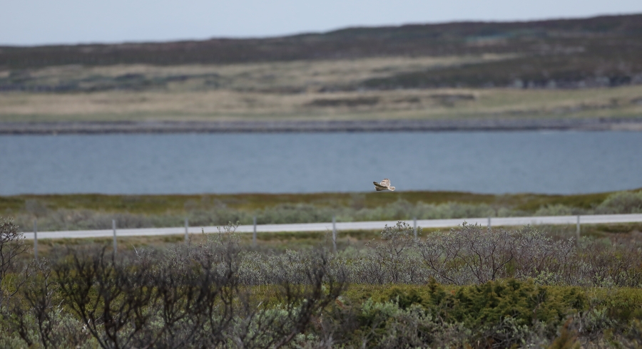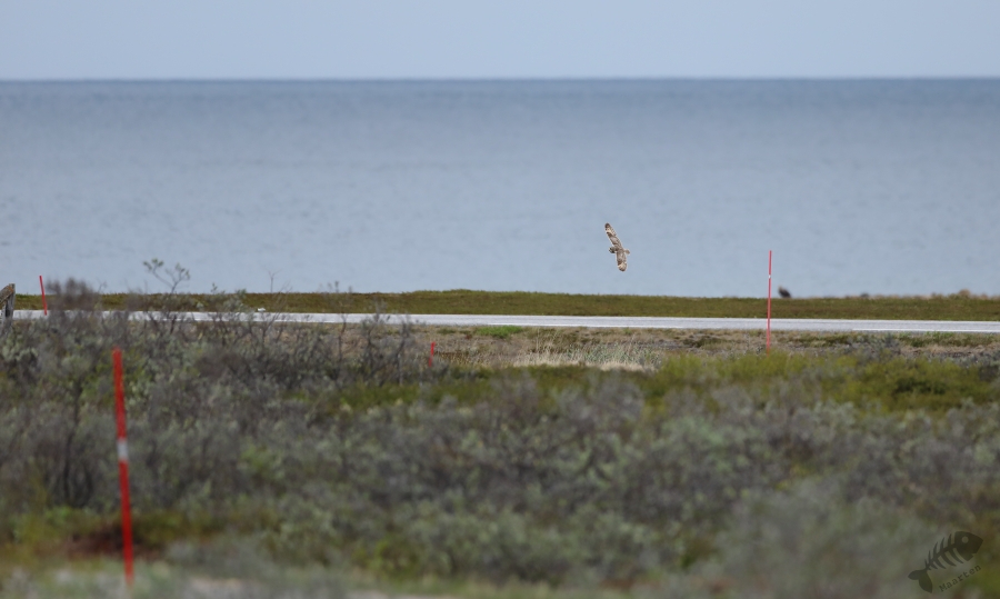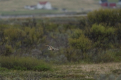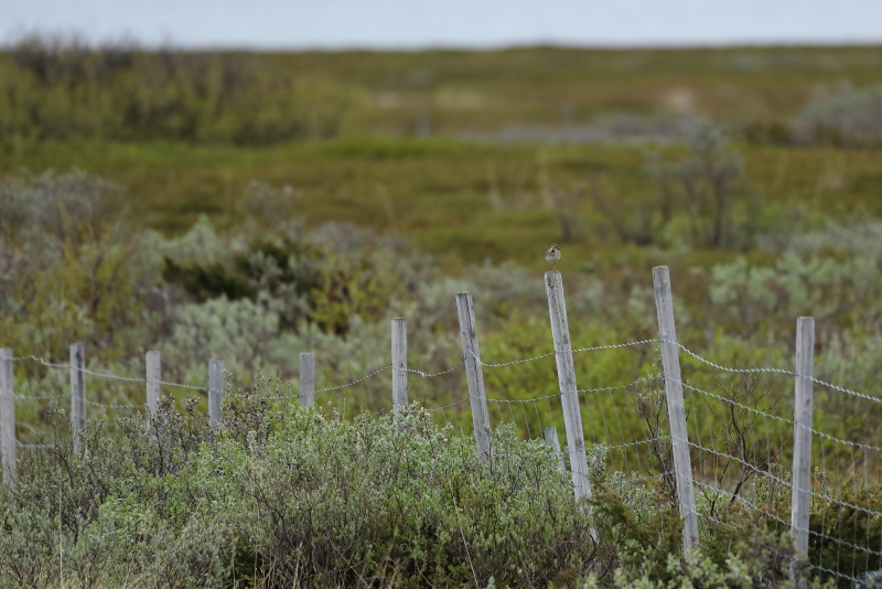 Maar met regelmaat kwam ook de Velduil weer terug en lukte het me steeds weer om hem vast te leggen. Stilletjes hoopte ik dat het dier ook nog een keer op 1 van de paaltjes zou gaan zitten waar ik al zo’n tijd op uitkeek. En ook die wens werd verhoord! Het was niet het dichtstbijzijnde paaltje, maar toch. Ik heb een kort filmpje gemaakt waarop het dier te zien is en rustig de omgeving afspeurt. Nadat de Velduil weer vertrokken was, werd al vrij snel z’n plaats ingenomen door een Watersnip! Dat bevestigde toch wel een beetje m’n vermoeden dat de rondvliegende zanger een Watersnip moet zijn geweest. En terwijl je daar zo rustig staat, op niet eens de allermooiste plek, gebeurt er om je heen genoeg. Opnieuw vloog er een Zeearend voorbij, ditmaal lastiggevallen door een Bonte Kraai. Van de andere kant vloog er een Wulp in beeld die niet ver van me vandaan landde en ik ook deze soort eens heel mooi kon afbeelden. Ik ben er zeker van dat het geen regenwulp is, die ik hier meer had gezien, want het dier had een langere snavel, meer vlekken op de borst en was “romiger” van kleur. Als laatste kon ik nog een Kramsvogel heel mooi vastleggen (eindelijk!) waarna ik alles weer opgepakt heb en weer richting huis ben gereden. Ik kon toch niet de rest van mijn tijd op Varanger hier blijven staan…