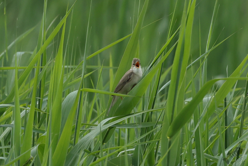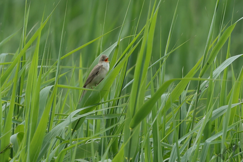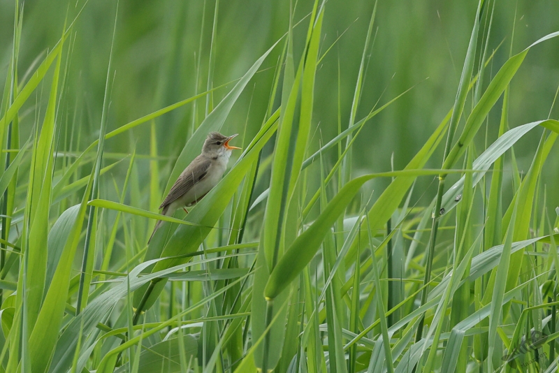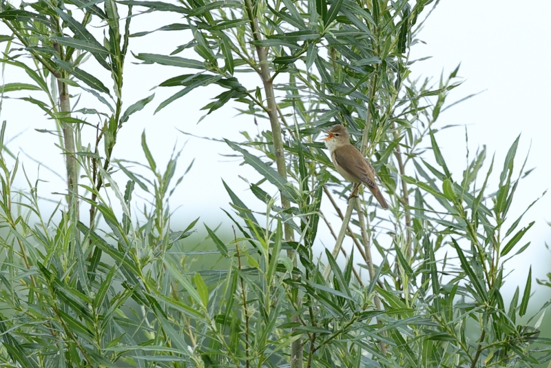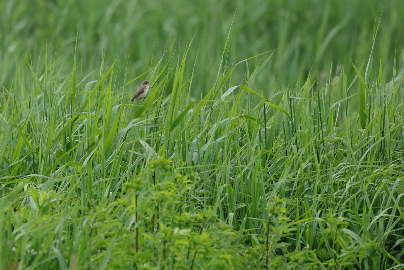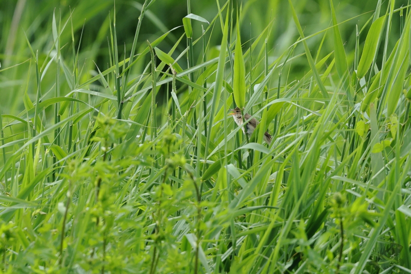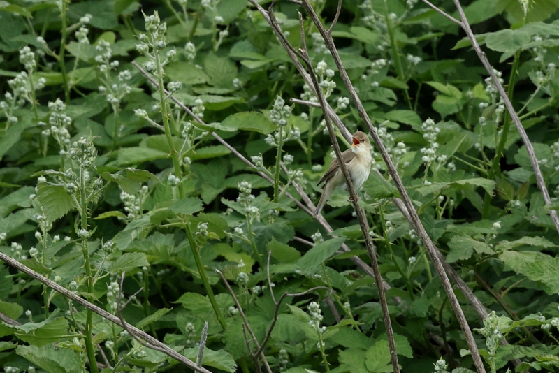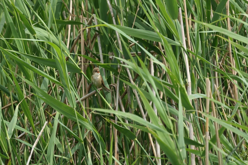 Omdat ik maar een uurtje had, kon ik ook niet zo heel ver gaan, maar dat hoeft ook niet als de volgende zomergast zich alweer aandient. Iets verderop dan waar de Grasmus zat te zingen, vond ik een Bosrietzanger die misschien nog wel meer zijn best aan het doen was. Ik vind dit zo’n geweldige vogels met die heerlijk drukke zang! Ik zou er wel een uur naar kunnen luisteren, maar die tijd had ik al niet meer: tik,tak,tik,tak…