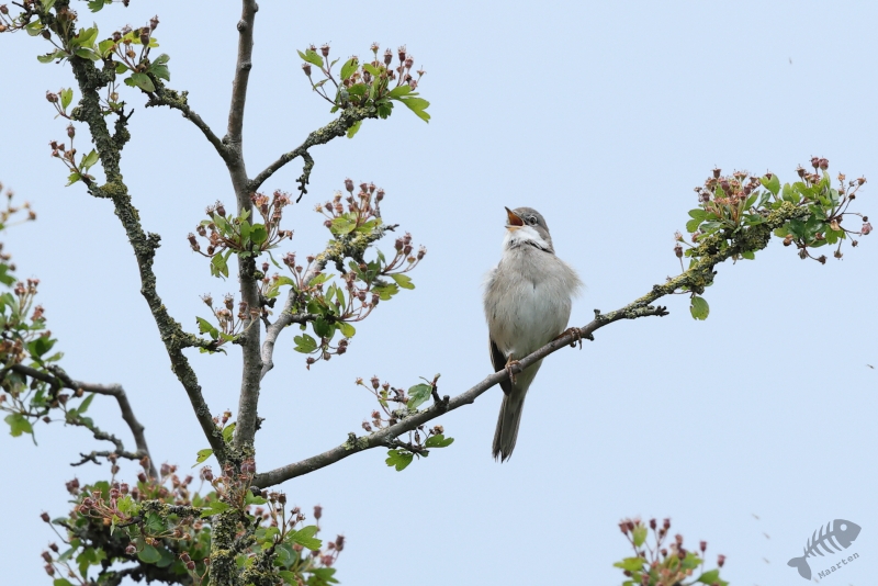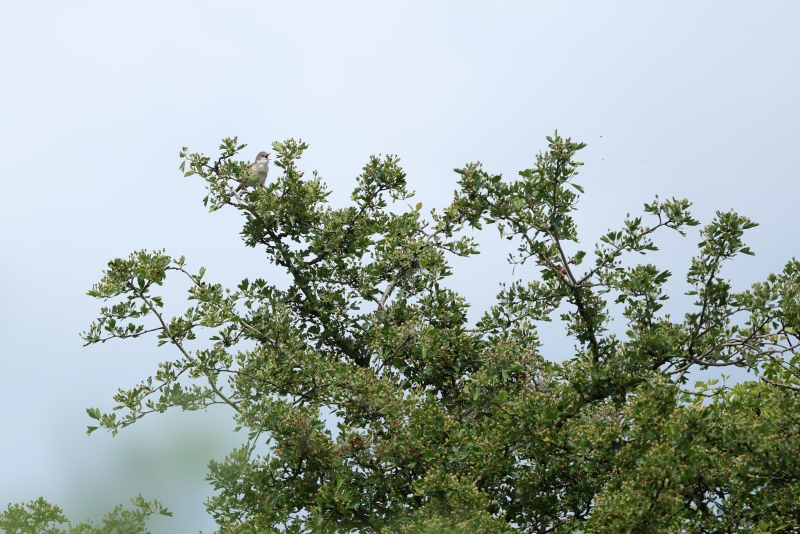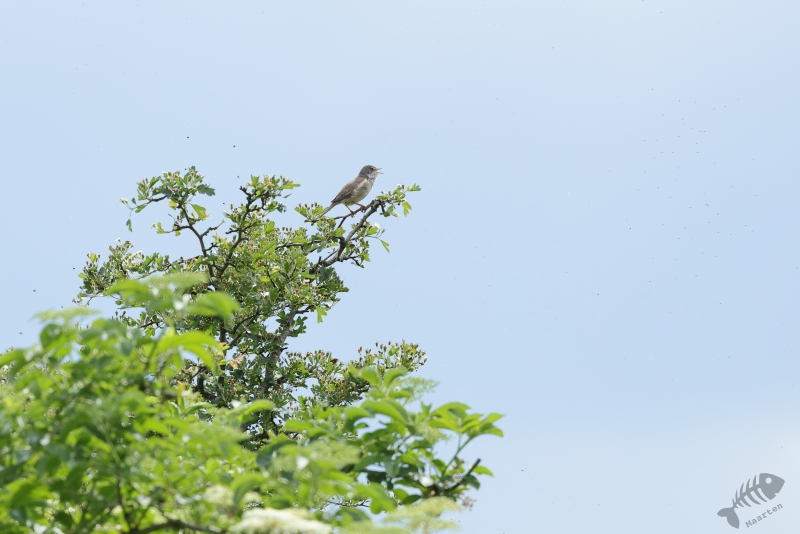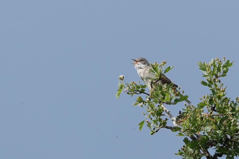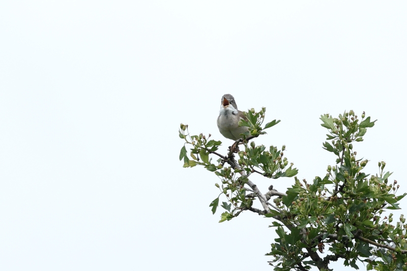Het begon al meteen goed met een luid zingende Grasmus in een Meidoornstruik. Ook deze zomergast was dus weer veilig teruggekeerd. Ik kreeg de kans hem vanaf een aantal verschillend plekken te fotograferen, waarna ik weer verder ben gelopen richting de Rijn.