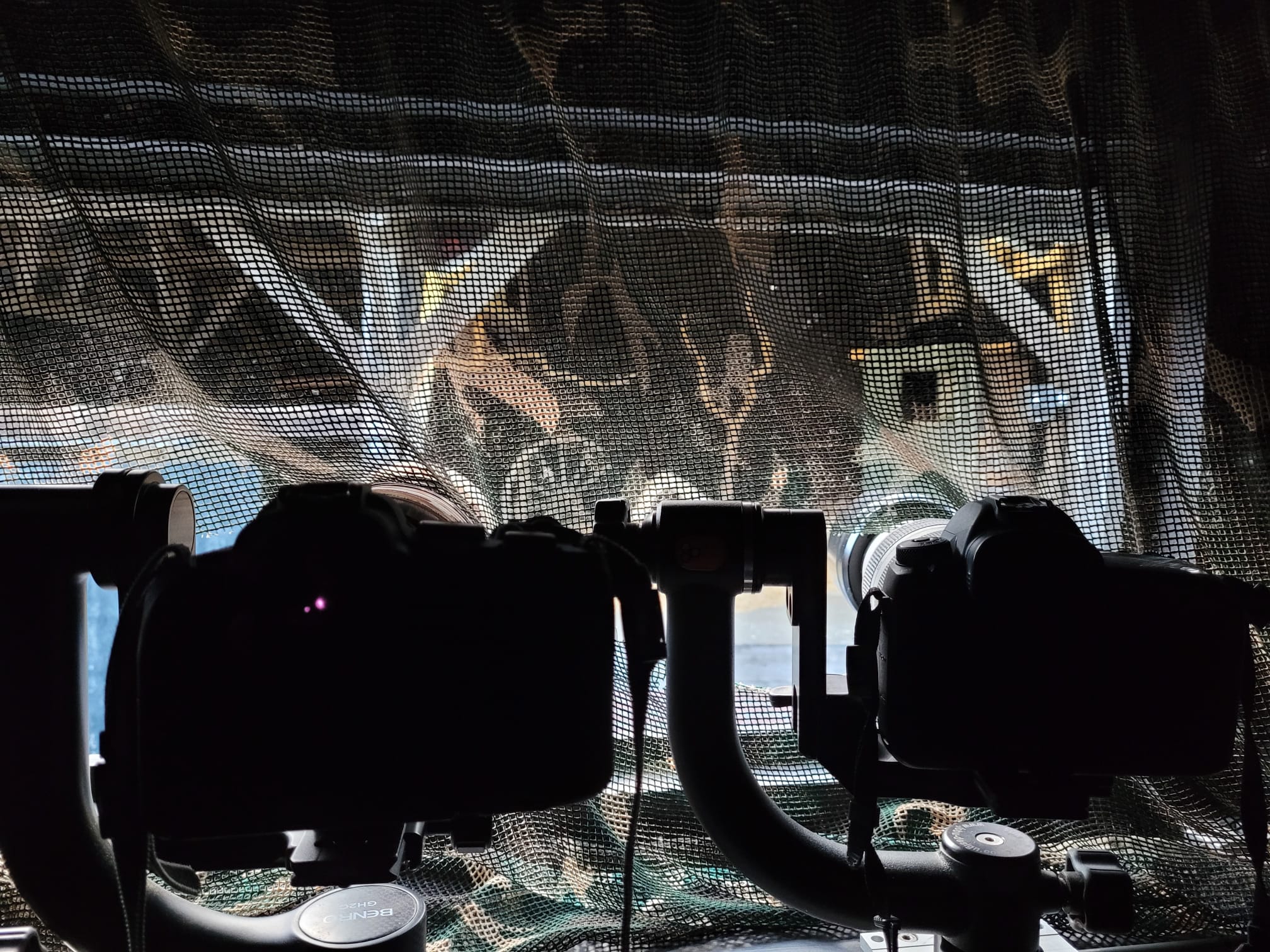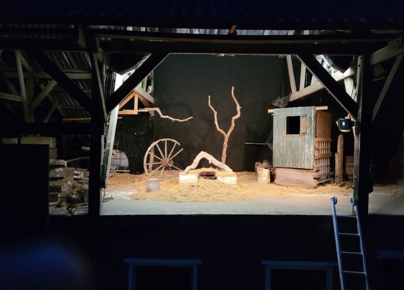 Daarvoor moesten we een trap op en kwam ik in een een behoorlijk ruime hut met zicht op de set. Daar vertelde Hans hoe het ongeveer zou gaan. Op het moment dat ik gesetteld was, zou hij een aantal muizen op de set brengen. Deze zou hij in een soort schuurtje leggen en nadat hij van de set af was, moest ik goed gaan opletten. De Uilen zouden er ineens kunnen zijn, waarbij ze eerst de, nog levende, muizen uit het schuurtje gaan vangen. Ik moest er rekening mee houden dat het heel snel zou gaan en elk moment dat de Uil er zat, meteen gaan fotograferen. Wanneer alle muizen van de set op zouden zijn, zou het waarschijnlijk een tijd rustig worden, maar na verloop van tijd was de kans heel groot dat ze weer regelmatig zouden verschijnen wanneer ze in de velden om de boerderij zouden gaan jagen en ze de set als tussenstop gebruiken. Daarna liet Hans zien hoe ik de lampen moest bedienen en welke stand ik het best kon gebruiken op het moment dat de Uilen op de set zaten. Toen alles duidelijk was, is Hans vertrokken om de muizen te plaatsen en heb ik mijn camera’s geïnstalleerd. Ik kon goed zien waar de muizen gelegd werden en wist dus waar ik op moest letten. Met een klikker liet Hans aan de Uilen weten dat ze weer konden komen smullen (toch wel een klein beetje geconditioneerd), waarna hij van de set verdween en ik moest gaan opletten…