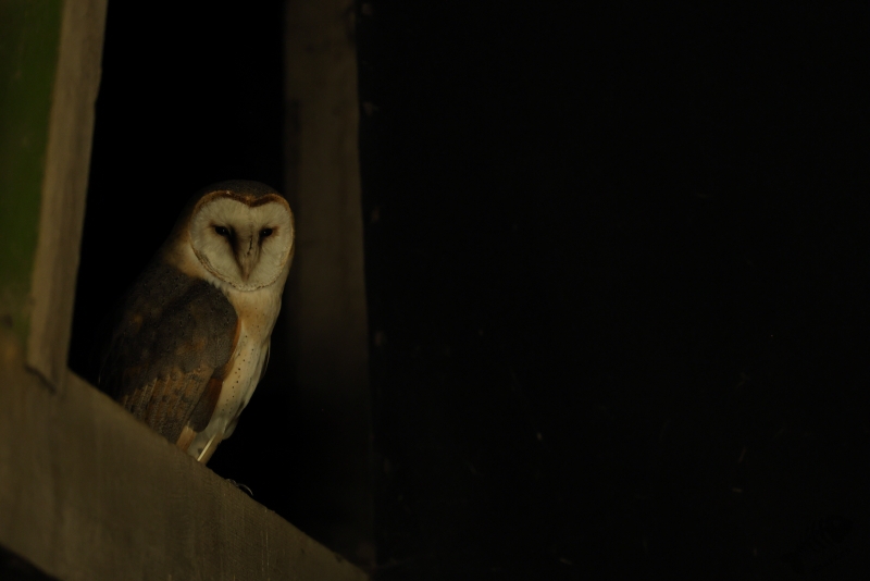En het begon vrijwel meteen. Misschien 5 minuten nadat Hans weg was, verscheen de eerste Uil. Wat een geweldig gezicht! Het was nog redelijk licht (het grote voordeel van deze tijd van het jaar) en ik kon de Uil prachtig zien. Zijn aanwezigheid was alleen van vrij korte duur. Hij ging op de rand van een soort raampje in het schuurtje zitten en dook vrijwel meteen naar binnen. Ik had nog niet eens de kans gehad 1 foto te maken! Nu was ik wel gewaarschuwd hoe snel het ging en ik ging er nog eens goed voor zitten. Nadat de eerste muis gevangen was, vloog de jager vanuit het raampje direct door naar de nestkast en was deze kans verkeken. Vrij korte tijd daarna verscheen de Uil weer en ging op een tak zitten voordat hij naar het raampje vloog. Nu kreeg ik wel de kans verschillende foto’s te maken voordat hij doorvloog en had ik hem te pakken! De Kerkuil! Een soort waar ik al eerder wel eens pogingen voor ondernomen had te fotograferen, maar wat nog nooit gelukt was. Vanaf de tak vloog hij naar het schuurtje waar hij even in het raampje bleef zitten om te kijken (luisteren?) of er nog wat te halen viel. Blijkbaar nam hij iets waar, want hij vloog het schuurtje weer in en kwam naar buiten met muis nummer 2 waarmee hij even op dezelfde tak ging zitten voordat hij naar de nestkast vloog. Ook nu weer kreeg ik de kans hem vast te leggen onder andere met uitgeslagen vleugels. Een prachtig gezicht! Daarna was het weer even rustig. Ik was nu wel beter voorbereid op de gang van zaken en was ook klaar toen hij voor de derde keer verscheen. Ook nu weer lukte het om foto’s te maken en de daarop volgende momenten ging het steeds beter. Ik kon de Uil op verschillende plekken en in verschillende poses vastleggen en tussentijds kon ik zelfs genieten van alleen al het zien van dit prachtige dier.