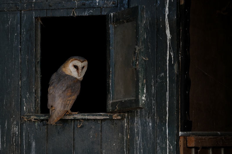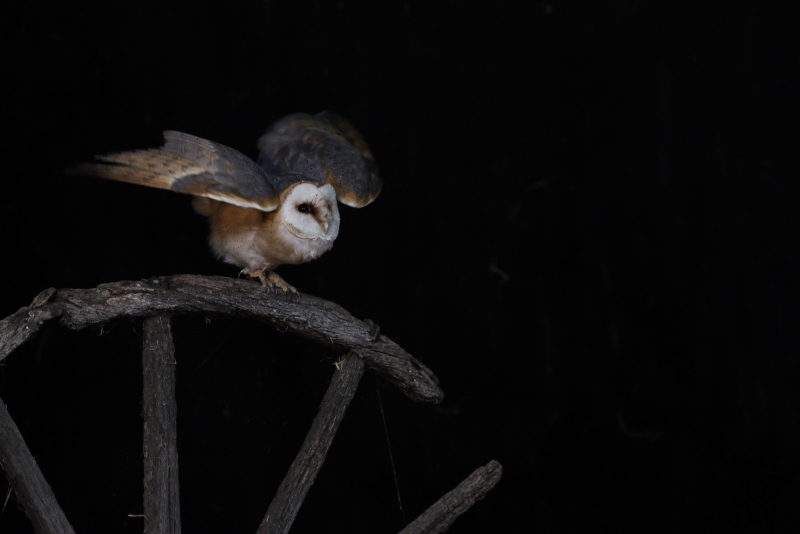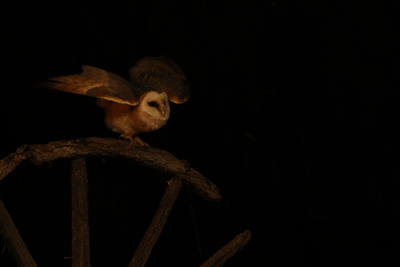 Ik weet niet precies meer hoelang deze eerste sessie duurde, in m’n herinnering ongeveer een uur, maar daarna werd het inderdaad stil. De Uil verscheen niet meer en langzaamaan werd het ook steeds donkerder en stiller op de boerderij. Ik gebruikte de tijd om de eerste resultaten te bekijken en werd daar al best heel blij van! Ik had een soort actiefoto’s kunnen maken, maar ook portretten van de Uil in het raampje en op verschillende voorwerpen op de set zoals een tak en groot wagenwiel.