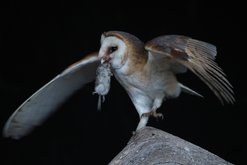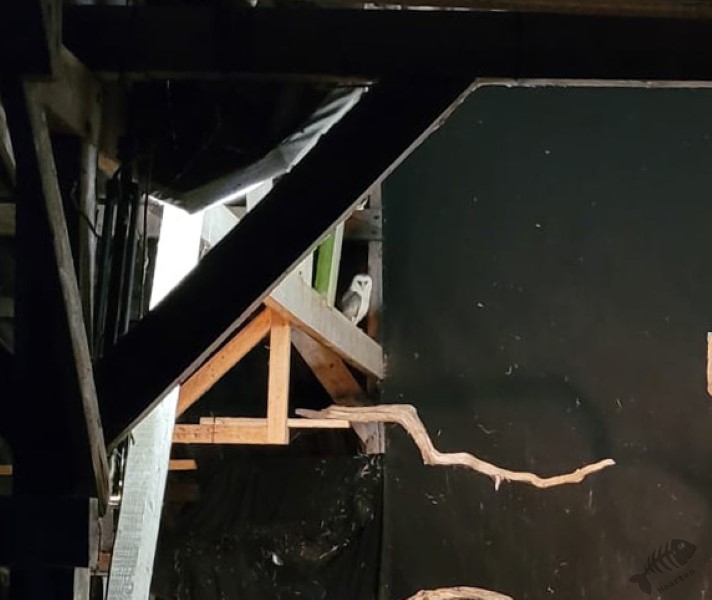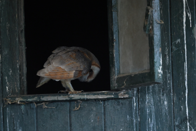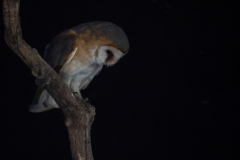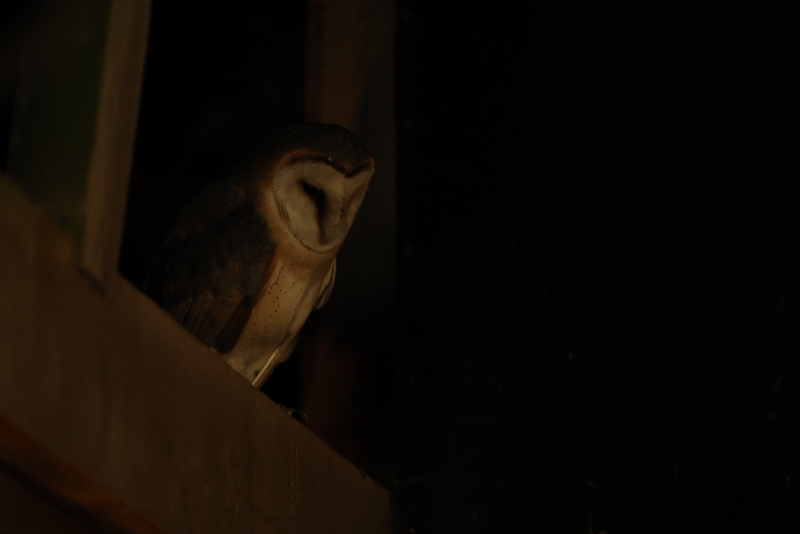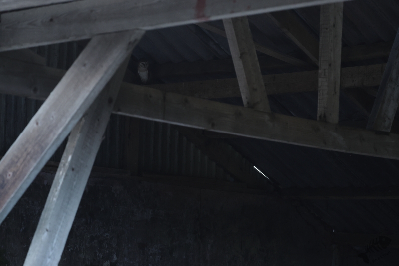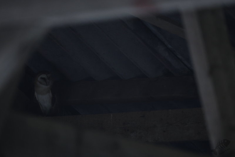 De stilte duurde een kleine 2 uur en daarna verscheen hij weer op de set. Hij bleef even op de balken van de schuur zitten waarna hij wegvloog en een paar minuten later kwam hij weer terug, met muis, en vloog door naar de kast. En dit ging de verdere avond en begin van de nacht zo door. Af en toen bleef hij heel lang op een balk zitten, maar de bewegingen waren eigenlijk elke keer hetzelfde. Ik was best verbaasd over het tempo waarmee de Uil elke keer verdween en terugkwam met prooi. Wat een ontzettend effectieve jagers zijn het!