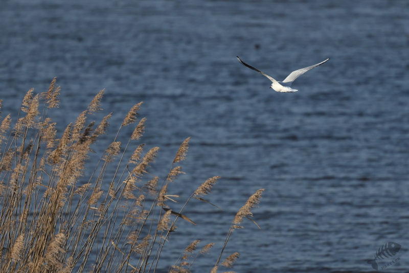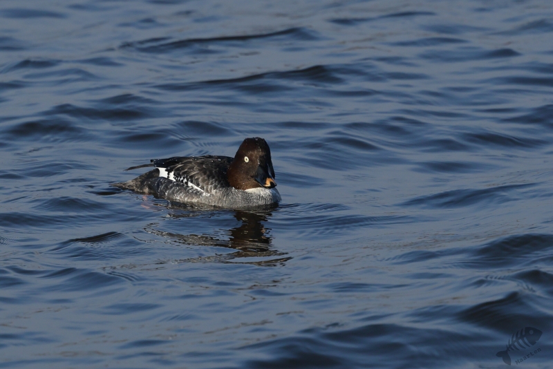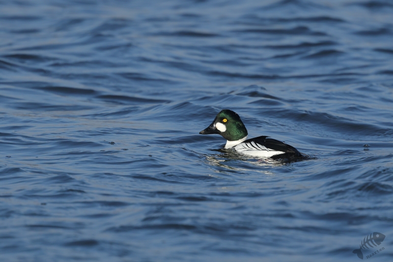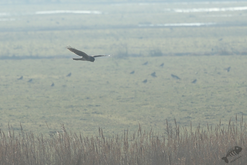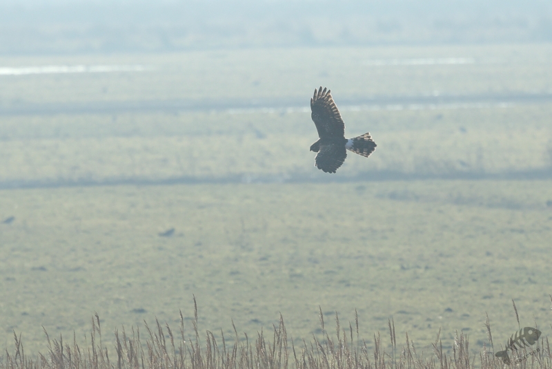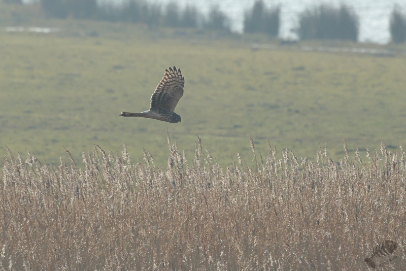 Ik was een behoorlijk eind de Zeedijk afgelopen waarbij ik op het water met name grote groepen Kuifeenden zag, maar ook het wijfje van een Grote Zaagbek. Na een klein half uur ben ik weer omgedraaid en richting de parkeerplaats gaan lopen. Al snel zag ik een Brilduiker niet zo heel ver uit de kant zwemmen en probeerde iets te bedenken om hem misschien wat beter te kunnen fotograferen (lees: van dichterbij). De tactiek waar ik eerder al eens geluk mee had met een Roodkeelduiker in Noorwegen, was telkens als de Duiker onder dook, een stukje dichterbij de waterkant komen en laag te gaan zitten op het moment de vogel weer bovenkwam. Zo deed ik het ook deze keer en het werkte! Ik kreeg de Brilduiker echt prachtig in beeld en de zon, normaal niet eens mijn beste vriend als ik aan het fotograferen ben, gaf een prachtig licht op deze prachtige vogel waarbij zijn kleuren heel mooi te zien waren (echt niet alleen zwart en wit…). Uiteraard had de Duiker mij echt wel in de gaten en zag ik steeds een “Goldeneye” op mij gericht en daarom ben ik gestopt hem te “besluipen” en toen hij weer onder ging snel de dijk weer opgelopen. Ik ben weer teruggelopen richting het Gemaal, en daarna daar voorbij gegaan om het water ten oosten hiervan af te zoeken naar eventueel moois. Ook hier zaten grote groepen Kuifeenden en zwommen ver van de kant ook nog Brilduikers rond. Deze laatsten zaten te ver om te fotograferen en daarom ben ik maar niet verder gelopen en ben weer omgedraaid. Op het moment dat ik me omdraaide, zag ik een Buizerd laag de dijk overvliegen richting het Gemaal. Hij landde in een boompje naast het rietveld wat daar nog staat, maar ik kon hem eigenlijk niet goed op de foto krijgen omdat de zon zo’n beetje tegen stond. De camera daarom weer naar het water gericht waar ik een voorbij vliegende Kokmeeuw kon pakken en daarna ben ik weer wat verder gelopen. Toen ik weer opkeek naar de plek waar de Buizerd geland was, zag ik een grote vogel over het riet vliegen. Heel even dacht ik dat het de Buizerd was, maar de manier van vliegen en de vorm van de vogel deden me direct inzien dat het om een andere jager ging: de Blauwe Kiekendief! Een maand geleden heb nog heel fraaie foto’s van een mannetje kunnen maken, deze keer kreeg ik het vrouwtje weer eens voor de camera. De zon stond natuurlijk nog steeds tegen, maar omdat het dier rondjes vloog, kon ik haar in verschillende poses in verschillend licht vastleggen. Perfect! Weer terug bij het Gemaal ben ik nog 1 keer naar de pier gelopen waar een vrouwtje van de Brilduiker dichtbij rondzwom. Met deze laatste beauty op de gevoelige chip ben ik in de auto gestapt om naar de Puttense kant te gaan om daar te bekijken wat ik zou kunnen vinden.