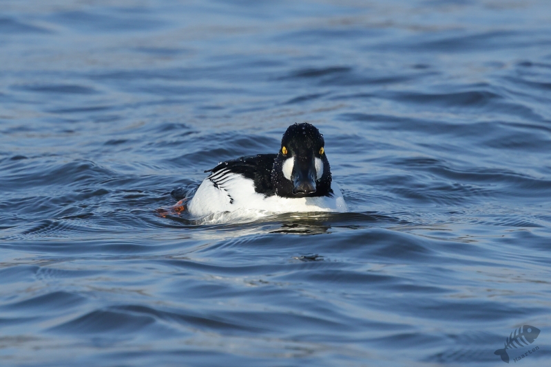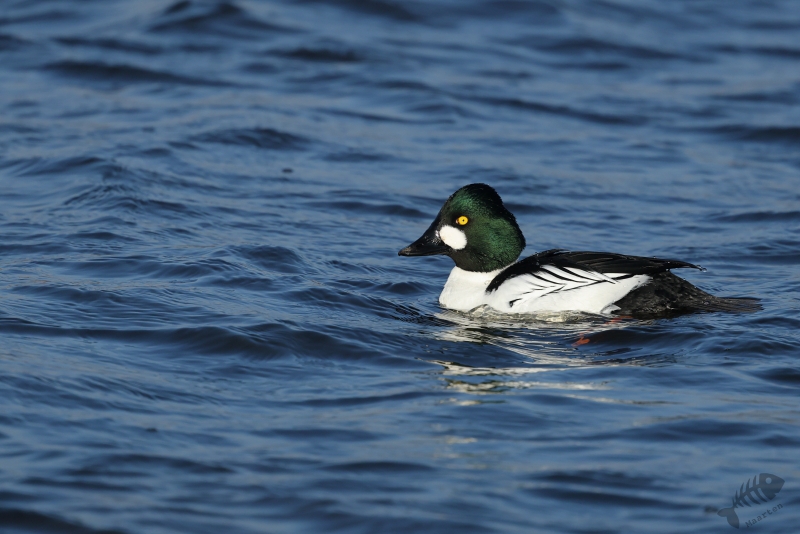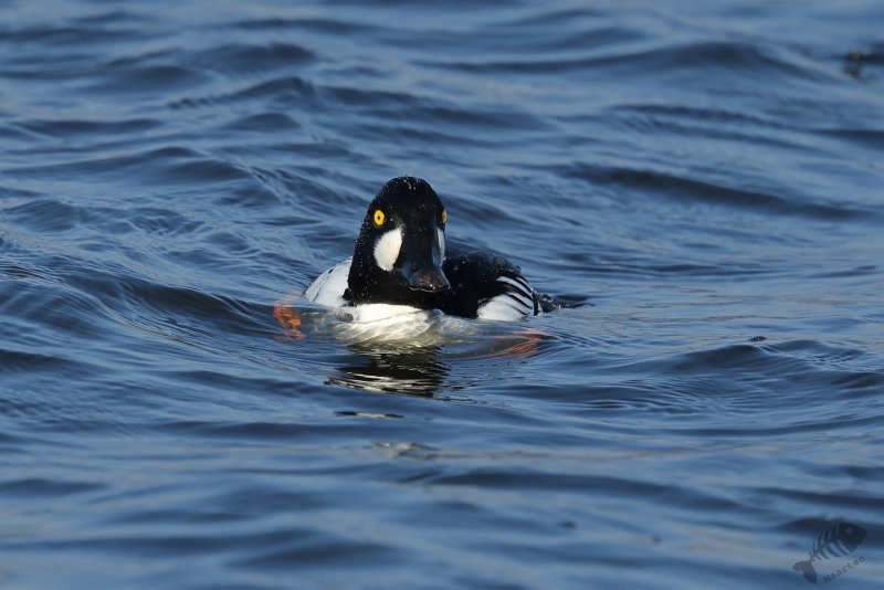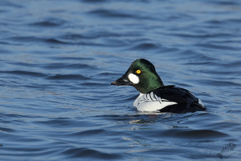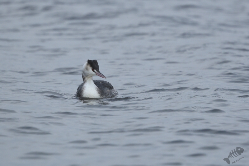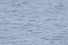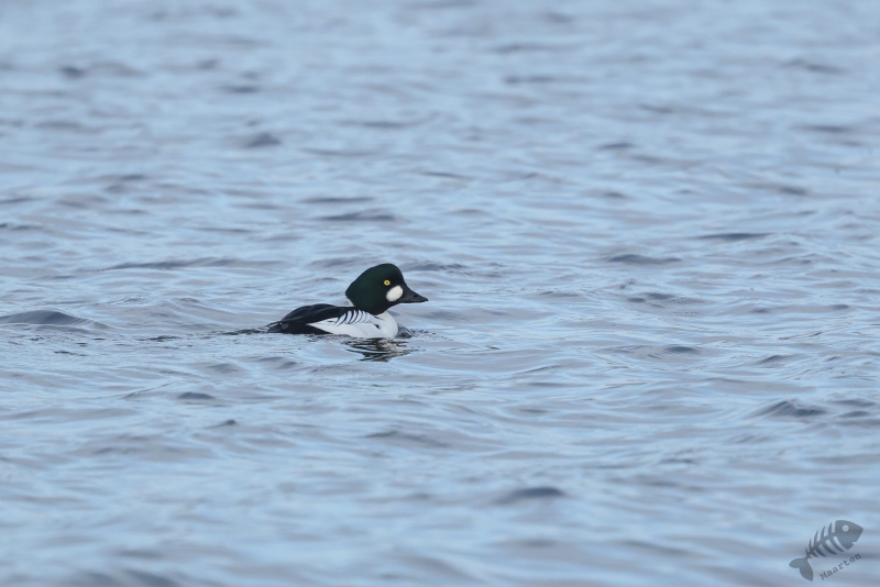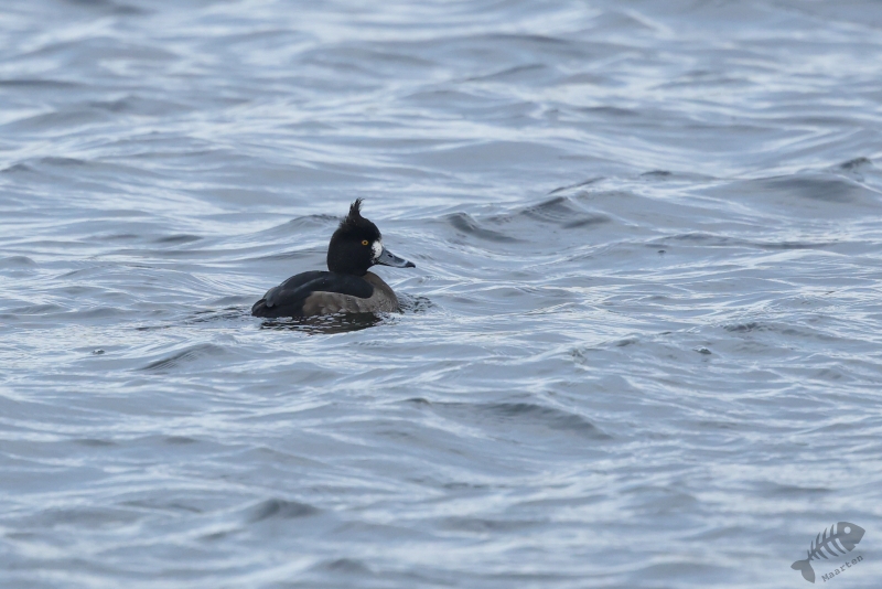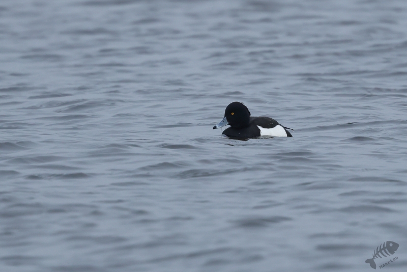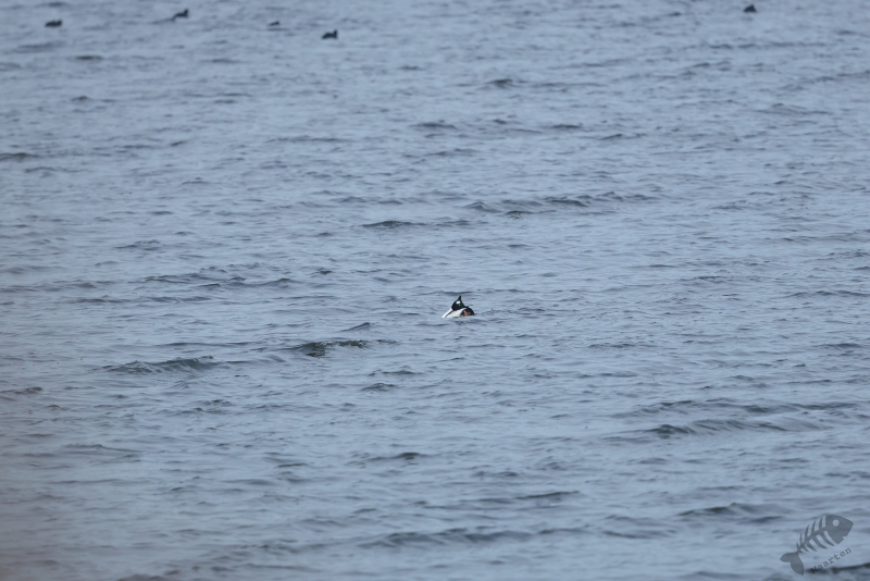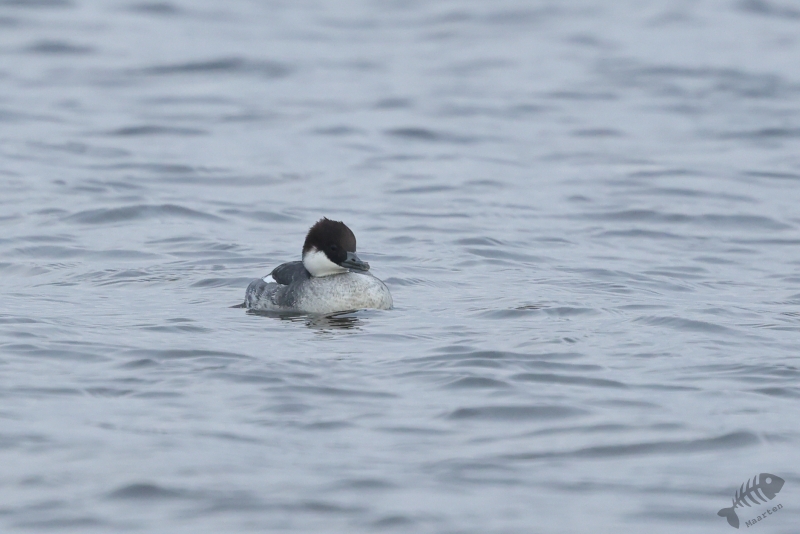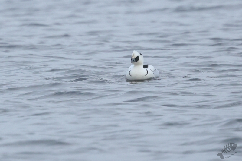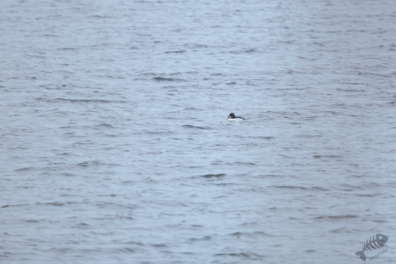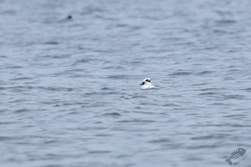 Ik was de dijk bij parkeerplaats nog niet overstoken en ik zag in de verte al iets wits zwemmen. Hij zat niet eens zo heel ver weg en zo heb ik meteen wat plaatjes van het Nonnetje kunnen maken. Wat een lekkere start! Daarna ben ik de steiger die het water inloopt opge(s)lopen, om nog van iets dichterbij foto’s te kunnen maken. Dit lukte zelfs een beetje en zo kwamen de plaatjes een beetje in de buurt van welke ik eerder gemaakt had. Toen ik probeerde op het einde van de steiger te komen, leek de Non het toch minder leuk te vinden en zwom rustig maar zeker weer verder van me weg. Ik kreeg nog wel een Kuifeend vermomd als Topper in beeld en een andere wenssoort, de Brilduiker, van heel in de verte.