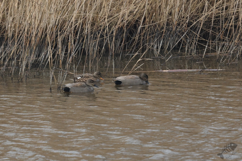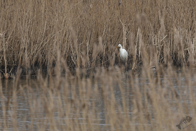 Na dit intermezzo heb ik er dan toch maar even goed de pas in gezet, proberend de omgeving goed in de gaten te houden op eventuele Roerdompen of Waterrallen (die ik beide niet vond), en kwam na een klein kwartiertje bij de “Eilandjes”. Het water wordt hier weer wat breder en er liggen een aantal eilandjes in dit gedeelte. Wat meteen opviel was het grote aantal Bergeenden dat hier rondzwom en met de billen omhoog aan het foerageren was. Ook bleken er Pijlstaarten rond te zwemmen, maar helaas vertoonden zij hetzelfde gedrag als dat ik eerder van ze mee had gemaakt: omkijken en rustig maar zeker afstand nemen van de fotograaf… Toen ik op een plek gekomen was waar ik dit gedeelte van het water goed kon overzien, zag ik behoorlijk in de verte hetgeen ik naar opzoek was. Er stonden 3 Kleine Zwanen in het water (inderdaad “stonden”: het water leek heel laag te staan) maar zij hadden lekker de kop in de veren gestoken en daarom was de snavel, datgene waaraan je ze kunt herkennen, niet te zien. Maar na een tijdje wachten en blijven observeren, stak er 1 zijn kop in de lucht en was het zeker: dit waren de Kleine Zwanen. Gelukkig was het nog nét licht genoeg om er foto’s van te maken, maar daarna ben ik snel aan de terugweg begonnen. Ik ben nog wel gestopt voor een mooi plaatje van een Grote Zilverreiger en een grote wolk Spreeuwen maar verder ben ik niet meer gestopt.