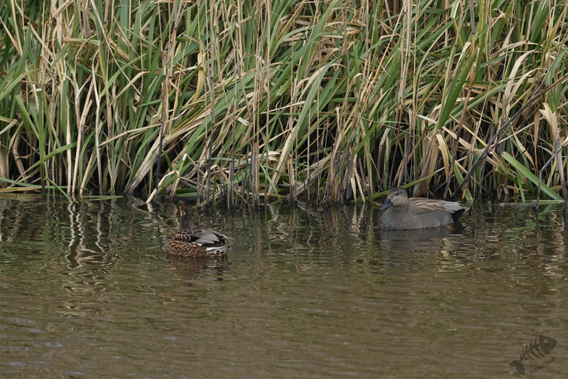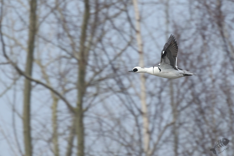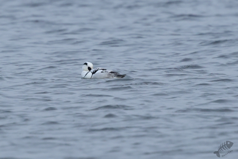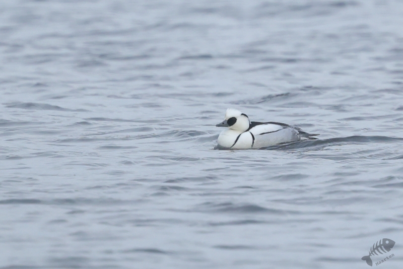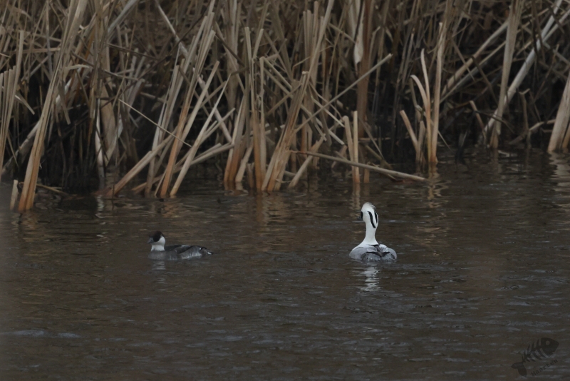 Aan het begin van deze wandeling trof ik als eerste een Grote Zilverreiger en een paar Krakeendjes. In een weilandje binnendijks zat een groepje Canadese Ganzen waar ik ook een paar foto’s van heb gemaakt. Toen ik daar zo stond, kwam er een fietser aan die stopte. Het bleek mw Bekema te zijn, een dame waarvan ik regelmatig waarnemingen zie vanuit de Polder op waarneming.nl, en we raakte even aan de praat. Ik ben haar al vaker tegengekomen en vaak heeft ze een paar goede tips. Ook nu bleek dat weer het geval te zijn: een behoorlijk stuk verder over de dijk zat een groepje Kleine Zwanen. Een soort die ik nog niet eerder had gezien, dus zeker de moeite waard om nog een stuk verder te wandelen. Het werd al wat later en het licht werd er niet beter op (nu werd het juist weer wat te donker… zucht…), dus ik moest wel een beetje doorlopen. Dat werd me wel heel moeilijk gemaakt door een Nonnetje dat eerst voorbij vloog en daarna door een koppeltje dat niet ver op het water, in de soort vaart, rondzwom. Daar moest ik natuurlijk wel even de tijd voor nemen en als ik het zelf mag zeggen: niet voor niks. Wat zijn dit toch prachtige kleine Zaagbekjes in monochroom!