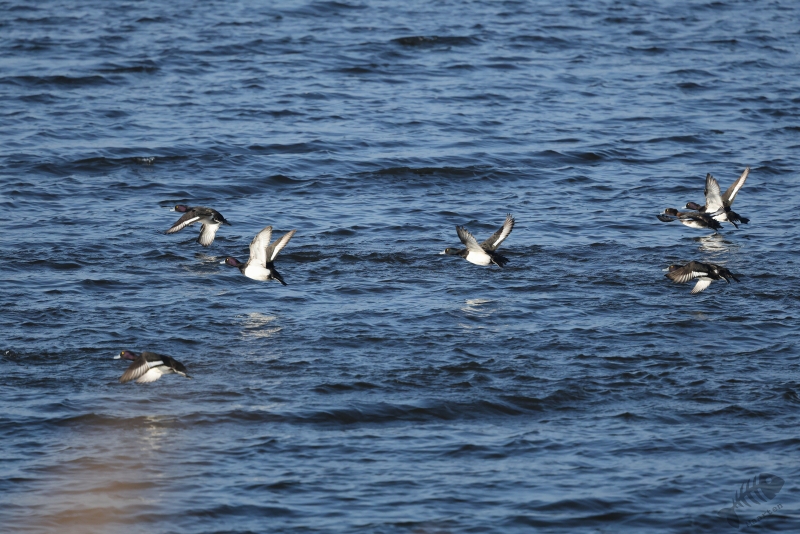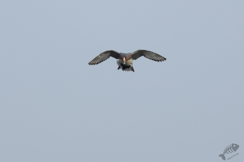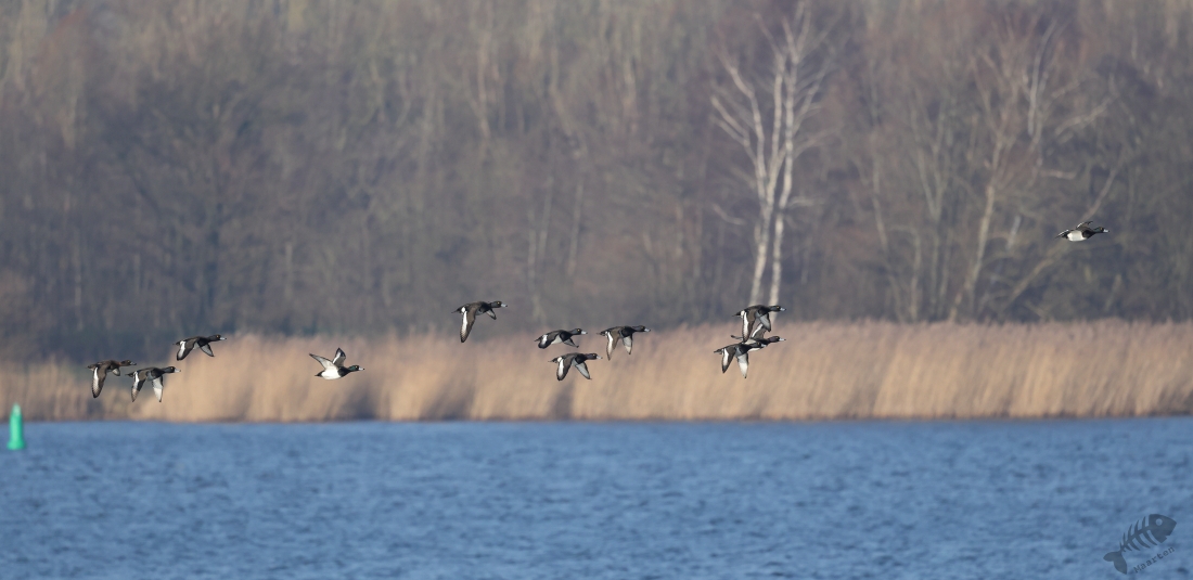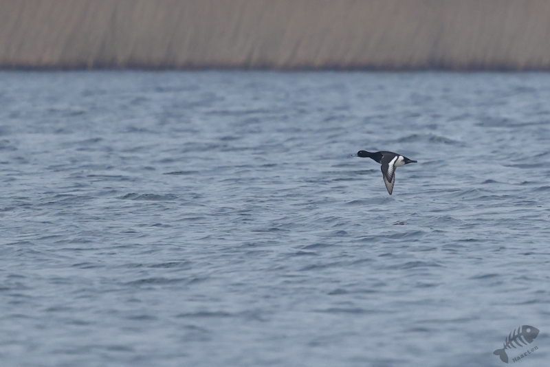 Ik ben daarop de dijk weer opgelopen en besloot richting Bunsschoten/Spakenburg te lopen. Op de dijk fotografeerde ik eerst nog een Roodborstje omdat het een leuk vogeltje is en om mijn snelheid een beetje te trainen. Ik heb sinds kort een nieuwe draagriem zodat ik niet mijn camera steeds echt vast hoef te houden. Mijn statief had ik niet bij me omdat ik bedacht had wat meer te gaan lopen, wat met de nieuwe draagband makkelijker zou zijn. In Noorwegen hadden de 2 Nederlandse vogelaars die ik daar ontmoet had ook zo’n band en zij waren hier heel tevreden over. Ik moest nog een beetje oefenen met het dragen en dan snel de camera te focussen en klik-klaar te krijgen. Het Roodborstje was hier dus een prima model voor en het lukte me heel aardig. Ook kon ik zo een mooie vlucht Kuifeenden vastleggen. Het dragen was inderdaad wel heel comfortabel zo in vergelijking met hoe ik het eerst altijd moest doen. Het veel lagere gewicht van de combinatie van camera en lens hielp natuurlijk ook…