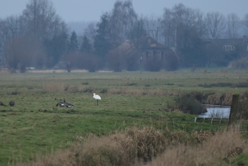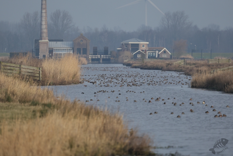 Ik had gezien dat er nog steeds mooie Eenden als Brilduiker en Nonnetje gezien werden en natuurlijk zit er altijd veel meer, soms ook iets leuks onverwachts. Zodoende kwam ik iets over 10en aan in de Polder en ben ik, zoals altijd, eerst het Nekkeveld afgereden. Een aantal jaar geleden heb ik daar op de Wiel heel mooi een Nonnetje kunnen fotograferen en ik hoop nog altijd dit een keer te kunnen herhalen. Wat ik als eerste wist vast te leggen was een Lepelaar in het veld. Verder zag ik tot de Wiel niet zo veel. Op het water zaten weer grote aantallen Smienten die af en toe zomaar uit de lucht leken te vallen. De Hermelijn die ook regelmatig langs het Nekkeveld gezien wordt, liet zich helaas niet aan mij zien. Ik had hier heel erg op gehoopt, maar zal moeten wachten tot een volgende keer. Ik ben naar het Gemaal gereden om te zien of op het grote water misschien meer te zien zou zijn.