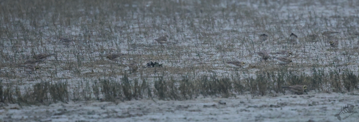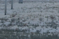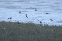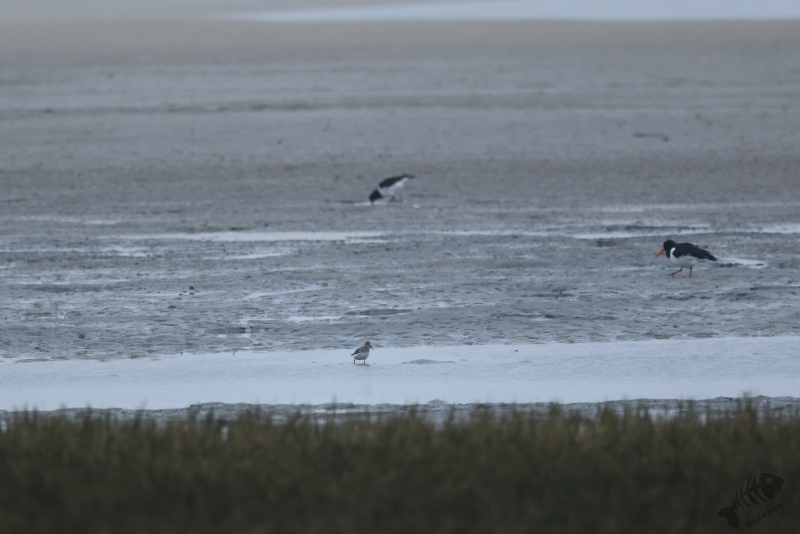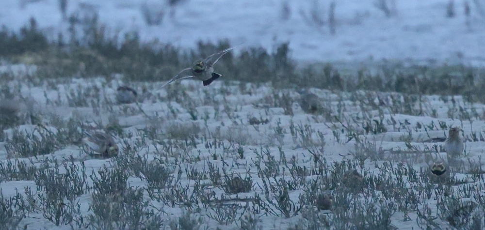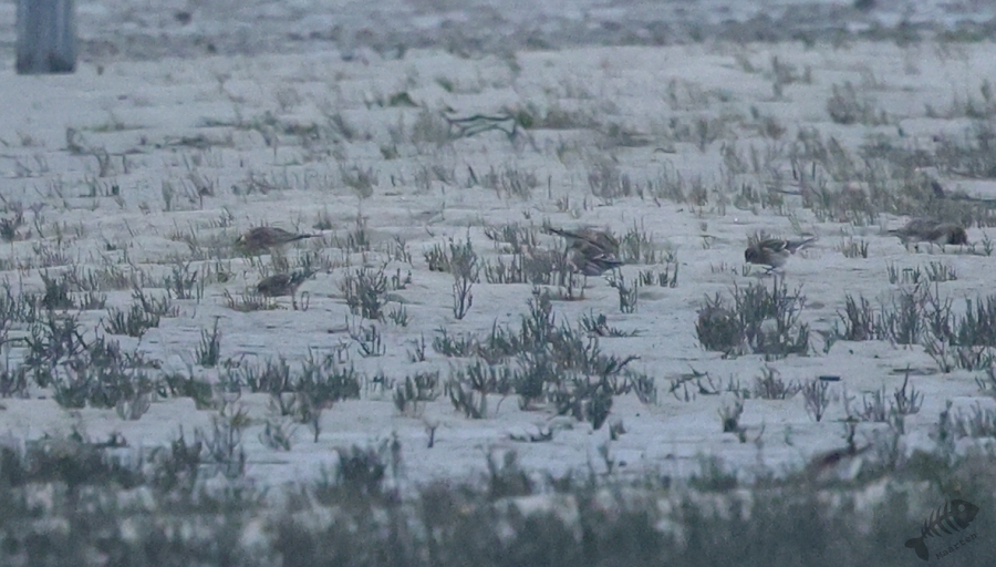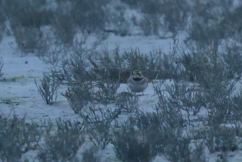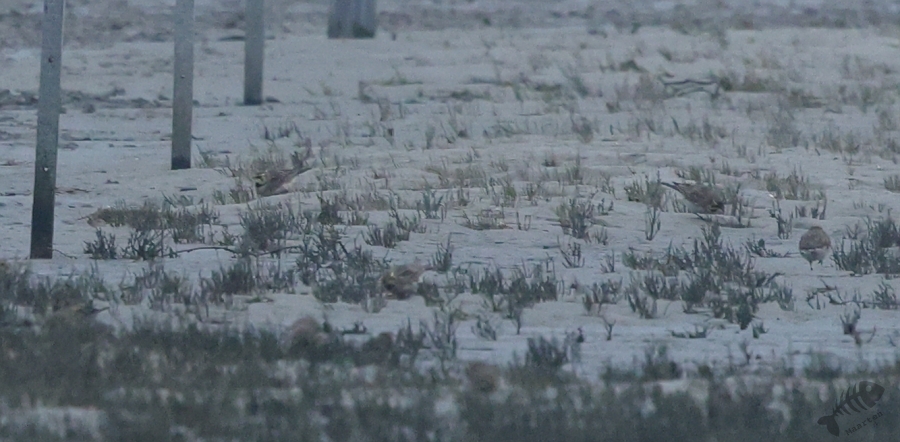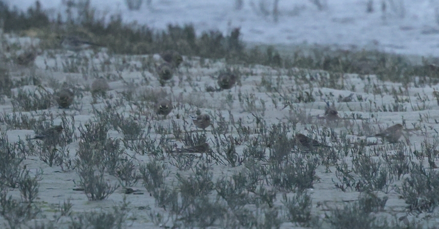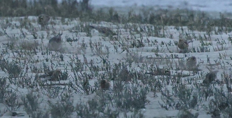 In het eerste gebied, het kwelder gedeelte, zag ik niks waardoor ik wel lekker kon doorlopen. Ik kwam dan ook al vrij snel bij het touw rondom het afgezette gebied aan en zag daar wat Bonte Strandlopertjes en Bergeenden. Een groepje vogelaars stond een eindje verderop en ik ben voorzichtig, met een beetje een omtrekkende beweging richting het groepje gelopen, aangezien zij behoedzaam een groep vogels stonden te observeren. Ze stonden uitgebreid naar de hoek van het terrein te kijken en toen ik bij ze was gekomen, vertelde 1 van hen dat er Strandleeuweriken en Fraters zaten. Het was op behoorlijke afstand, maar ik bedacht dat ik niet dichterbij moest proberen te komen, omdat deze mannen ook alle voorzichtigheid in acht hielden om de vogels maar niet te verjagen. Gelukkig waren de vogels zelf niet bang dat ze ons zouden verjagen en kwamen af en toe een beetje dichterbij. Ook wij konden een klein beetje in hun richting lopen en zo werd de afstand toch iets kleiner. De weersomstandigheden (lees: lichtomstandigheden) werden er helaas niet beter op. Ik moest met enorme iso’s werken om toch nog iets te kunnen zien, maar zelfs daarmee was het moeilijk. Af en toe schoot ik maar een beetje in de richting waarvan ik dacht dat de vogels zouden zitten, of waar ik ze als laatste met m’n verrekijker had gezien. Op een gegeven moment vloog er een grote groep weg, wat de Fratertjes bleken te zijn, maar kwamen de anderen juist weer wat dichterbij. Zo heb ik in het half duister nog behoorlijk wat foto’s gemaakt van de Strandleeuweriken op verschillende plekken rondom het draad totdat ook zij opvlogen om meer verscholen tussen de begroeiing te gaan zitten. De andere vogelaars gaven aan dat ze weer gingen en toen ik zag dat het al tegen 4en liep, besloot ik met hen mee naar de auto te wandelen. We hebben nog even gezellig gepraat en een allerlei aan wetenswaardigheden uitgewisseld waarbij de rode draad toch wel de Brileider was. Ook zij hadden enorm genoten van het zien van deze zeldzaamheid en hadden de trip er absoluut voor over gehad.