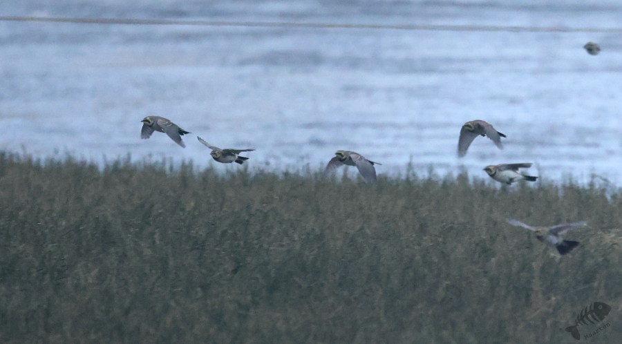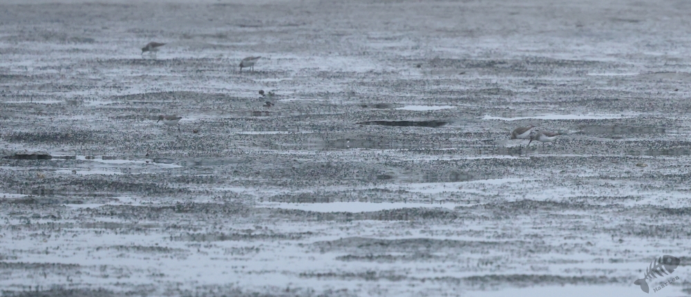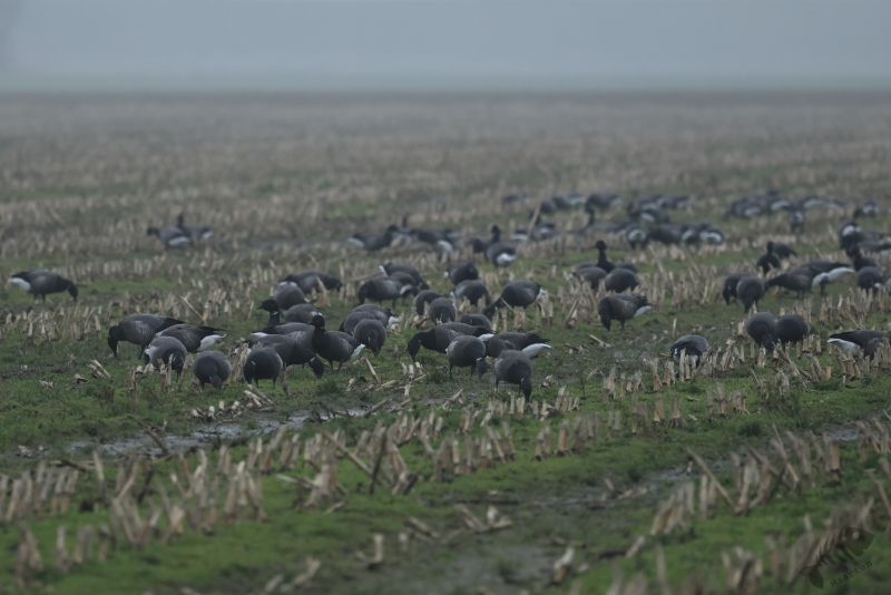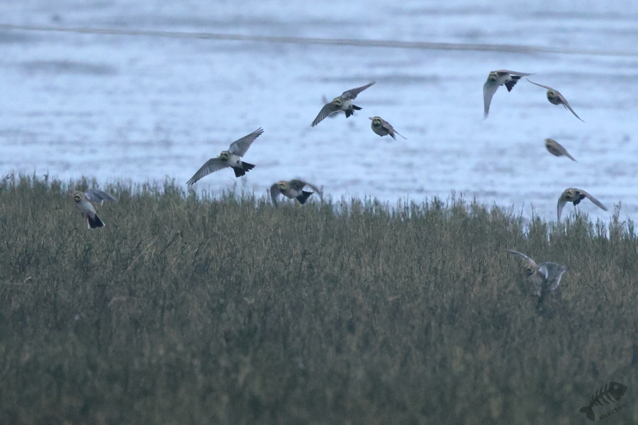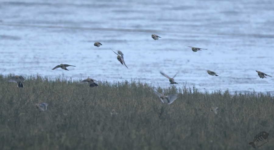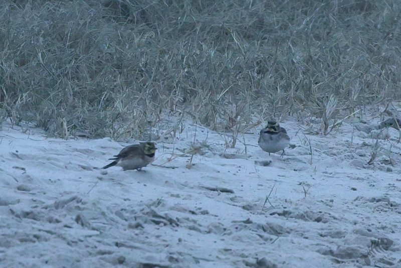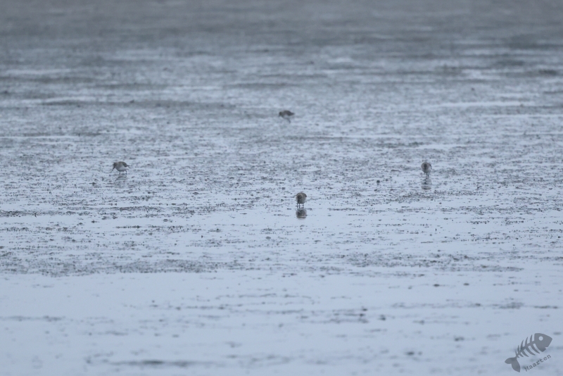In het eerste gebied, het kwelder gedeelte, zag ik niks waardoor ik wel lekker kon doorlopen. Ik kwam dan ook al vrij snel bij het touw rondom het afgezette gebied aan en zag daar wat Bonte Strandlopertjes en Bergeenden. Een groepje vogelaars stond een eindje verderop en ik ben voorzichtig, met een beetje een omtrekkende beweging richting het groepje gelopen, aangezien zij behoedzaam een groep vogels stonden te observeren. Ze stonden uitgebreid naar de hoek van het terrein te kijken en toen ik bij ze was gekomen, vertelde 1 van hen dat er Strandleeuweriken en Fraters zaten. Het was op behoorlijke afstand, maar ik bedacht dat ik niet dichterbij moest proberen te komen, omdat deze mannen ook alle voorzichtigheid in acht hielden om de vogels maar niet te verjagen. Gelukkig waren de vogels zelf niet bang dat ze ons zouden verjagen en kwamen af en toe een beetje dichterbij. Ook wij konden een klein beetje in hun richting lopen en zo werd de afstand toch iets kleiner. De weersomstandigheden (lees: lichtomstandigheden) werden er helaas niet beter op. Ik moest met enorme iso’s werken om toch nog iets te kunnen zien, maar zelfs daarmee was het moeilijk. Af en toe schoot ik maar een beetje in de richting waarvan ik dacht dat de vogels zouden zitten, of waar ik ze als laatste met m’n verrekijker had gezien. Op een gegeven moment vloog er een grote groep weg, wat de Fratertjes bleken te zijn, maar kwamen de anderen juist weer wat dichterbij. Zo heb ik in het half duister nog behoorlijk wat foto’s gemaakt van de Strandleeuweriken op verschillende plekken rondom het draad totdat ook zij opvlogen om meer verscholen tussen de begroeiing te gaan zitten. De andere vogelaars gaven aan dat ze weer gingen en toen ik zag dat het al tegen 4en liep, besloot ik met hen mee naar de auto te wandelen. We hebben nog even gezellig gepraat en een allerlei aan wetenswaardigheden uitgewisseld waarbij de rode draad toch wel de Brileider was. Ook zij hadden enorm genoten van het zien van deze zeldzaamheid en hadden de trip er absoluut voor over gehad.