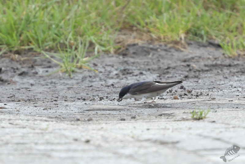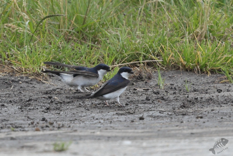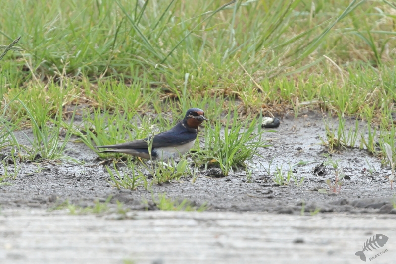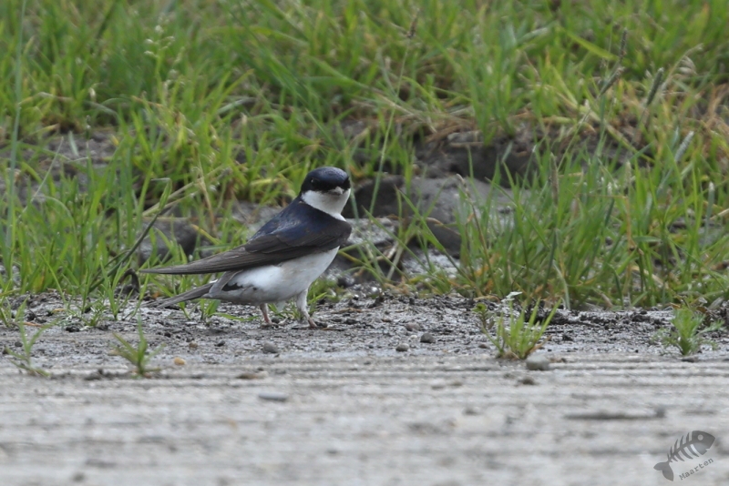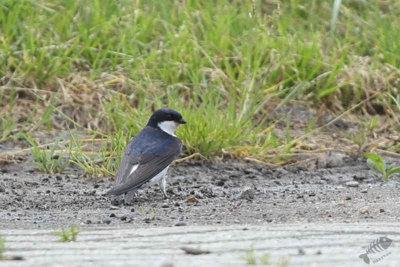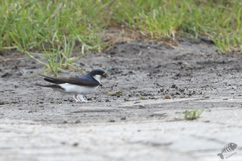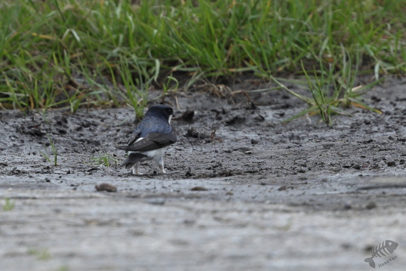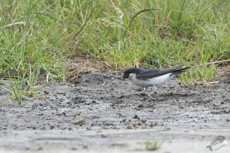 Gelukkig heb ik me ook nog even kunnen vermaken met wat Visdiefjes en een Fuut, wat natuurlijk altijd leuk is. Ik besloot al vrij snel terug naar de auto te lopen om nog een stukje aan deze kant van de Polder met de auto te gaan bekijken. Richting de snelweg vond ik helemaal niets in e weiden en ook verder naar het oosten niet. Ik vond het wel mooi geweest en ben weer langzaam terug gereden. Bij de laatste boerderij (misschien is het nu gewoon een woonhuis) aan de linker kant, voordat de weg afdraait naar links, zag ik eindelijk wat beweging. Aan de rand van wat bestrating op het erf van de boerderij vlogen Huiszwaluwen af en aan. Ze waren druk doende nestmateriaal te verzamelen en daarmee kreeg ik eindelijk weer eens de mogelijkheid (na al die droge voorjaarsdagen de afgelopen jaren) deze schitterende dieren wat beter in beeld te krijgen. Ik heb er best een tijd gestaan en heb de vogels op alle mogelijke manieren kunnen vastleggen. Tussendoor kwamen er ook Kneutjes in beeld en kwam ook een Boerenzwaluw nestmateriaal halen.