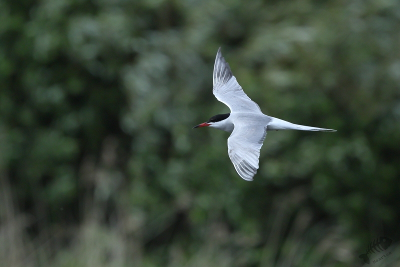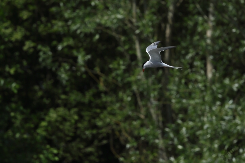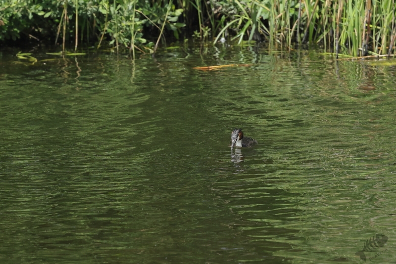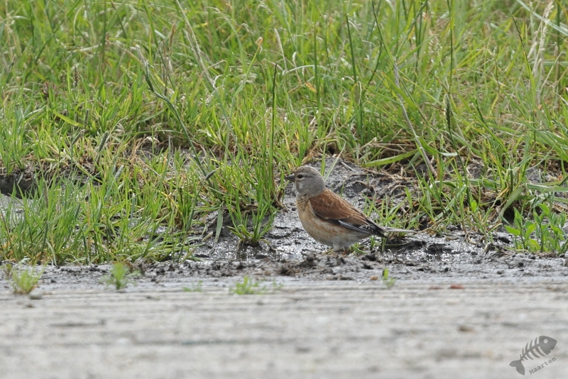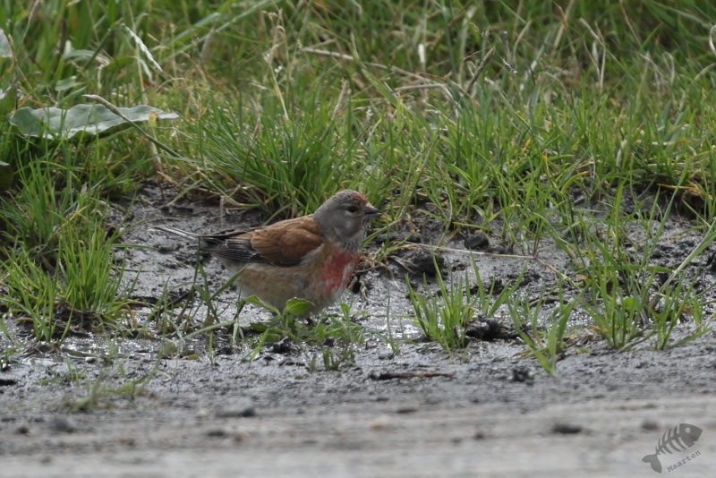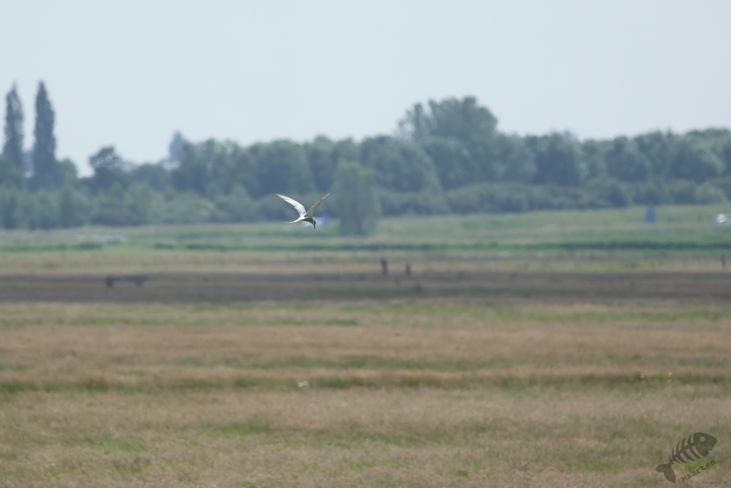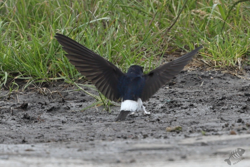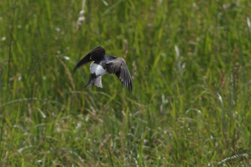 Gelukkig heb ik me ook nog even kunnen vermaken met wat Visdiefjes en een Fuut, wat natuurlijk altijd leuk is. Ik besloot al vrij snel terug naar de auto te lopen om nog een stukje aan deze kant van de Polder met de auto te gaan bekijken. Richting de snelweg vond ik helemaal niets in e weiden en ook verder naar het oosten niet. Ik vond het wel mooi geweest en ben weer langzaam terug gereden. Bij de laatste boerderij (misschien is het nu gewoon een woonhuis) aan de linker kant, voordat de weg afdraait naar links, zag ik eindelijk wat beweging. Aan de rand van wat bestrating op het erf van de boerderij vlogen Huiszwaluwen af en aan. Ze waren druk doende nestmateriaal te verzamelen en daarmee kreeg ik eindelijk weer eens de mogelijkheid (na al die droge voorjaarsdagen de afgelopen jaren) deze schitterende dieren wat beter in beeld te krijgen. Ik heb er best een tijd gestaan en heb de vogels op alle mogelijke manieren kunnen vastleggen. Tussendoor kwamen er ook Kneutjes in beeld en kwam ook een Boerenzwaluw nestmateriaal halen.
