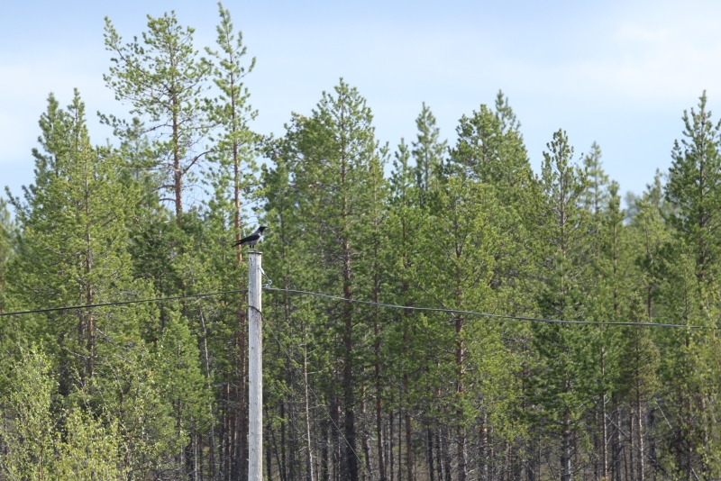 Doordat ik goed om me heen bleef kijken, kreeg ik het landschap ook goed mee. Het was zeer bosrijk: Berken afgewisseld met naaldbomen bepaalden grotendeels het uitzicht. Met een zekere regelmaat werden de bossen onderbroken door weiden en akkers. Deze leken me minder interessant en ik schonk hier dan ook niet zo veel aandacht aan. Een Zwarte Kraai of Raaf liet ik ongemoeid en zo bereikte ik de afslag naar de ingang van het Nasjonalpark. Daar zat een Noordse Gele Kwikstaart en na die op de foto te hebben gezet, besloot ik dat ik het park in zou rijden. Het was maar 15km…