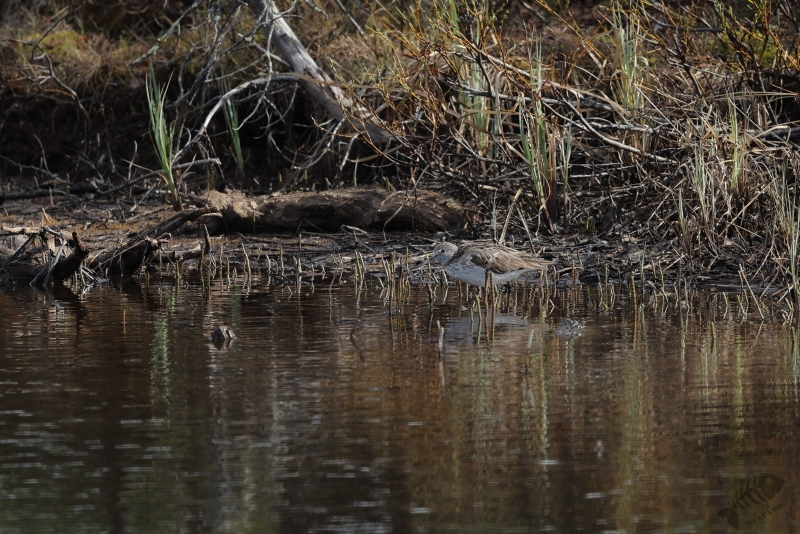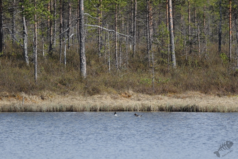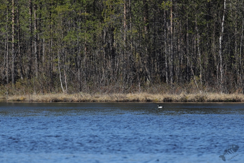 Ik besloot dus om door te rijden in de hoop misschien een Houtsnip of een Hoen spec. te gaan zien. In eerste instantie bleef het bij een Bonte Kraai op grote afstand bovenop een elektriciteitsmast en een Bosruiter aan de oever van 1 van de vele meertjes. Af en toe werd het bos verwisseld voor een uitgestrekte heide, maar het dichte bos bepaalde het landschap. En eigenlijk maakte dat dus het vogelen vanuit de auto behoorlijk onmogelijk. Er was hierdoor weinig zicht op wat iets verder van de weg zou zitten en in die beboste stukken zag ik dan ook niets. Op een volgend meer zag ik wel weer een koppeltje Brilduikers. Ik vind het zo leuk dat ik het hele jaar door met deze fantastische soort bezig kan zijn: ’s winters aan de kust van Nederland of op de randmeren van de Arkemheense Polder. In het voorjaar zijn ze hier op de grotere meren en kon ik ze dus zien in hun natuurlijke broedgebied.