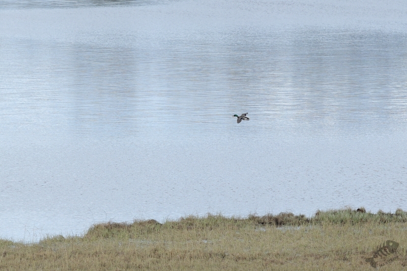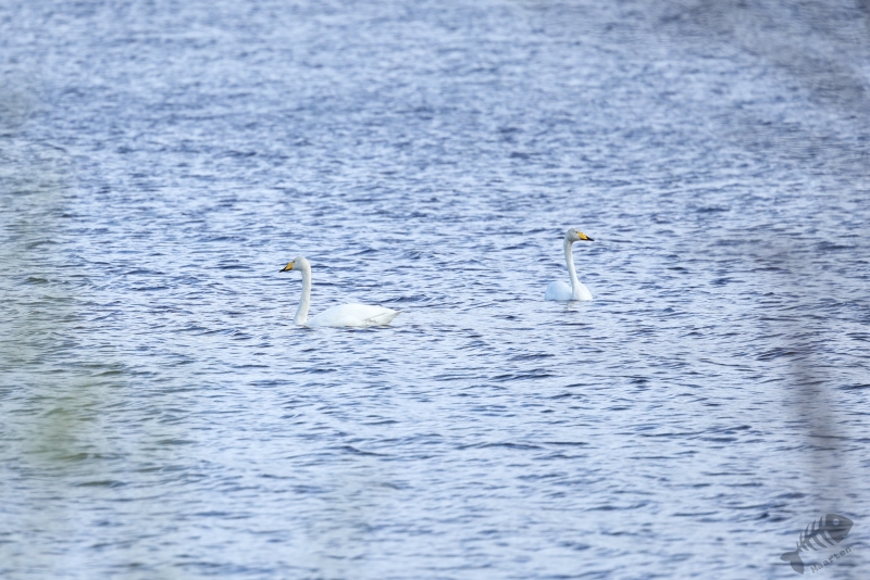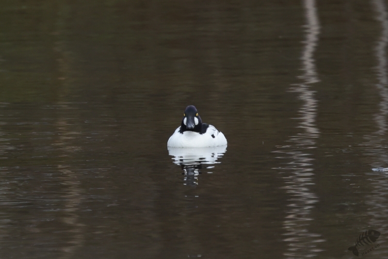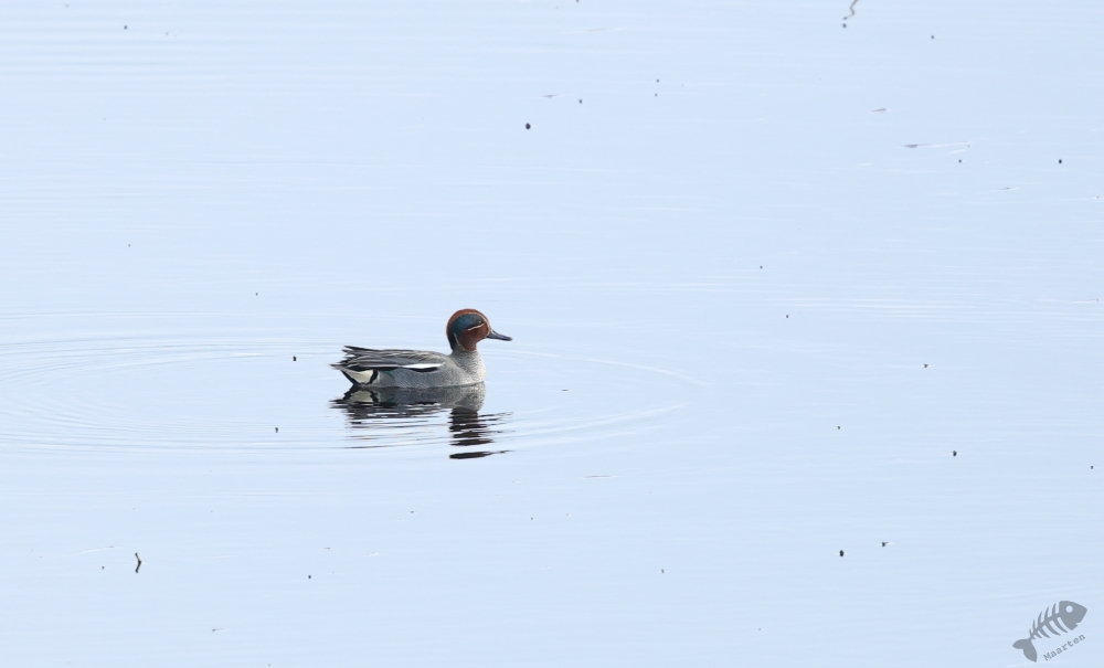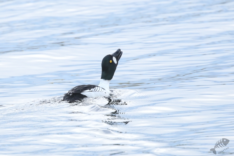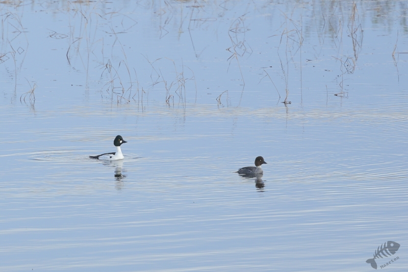 Ik moet eerlijk bekennen dat ik het observatiepunt waar het Engelse echtpaar het over had gehad niet zomaar gevonden kreeg. Ik denk dat ik ergens onderweg wel een bord heb zien staan en ben er eerst (weer) voorbij gereden. In dit geval pakte dat goed uit, want ik passeerde een plek waar ook weer een Brilduiker zat. Deze zat zelfs nog dichterbij dan de vorige en deze Goudoog liet zien dat hij het voorjaar in z’n bol had. Toen ik eenmaal doorhad dat ik de afslag gemist had, ben ik weer omgedraaid om op tijd de afslag naar Skrøytnes te nemen. En daar vond ik al vrij snel het observatiepunt. Een houten vlonderpad liep naar de hut dat op een soort stellage stond waar je met een trap bij kon komen. Toen ik de trap beklommen had en in de hut uitkwam, was ik even stil… Ik keek uit over een prachtig sereen landschap in prachtig licht. Het was helemaal stil, op blatende Watersnippen en roepende Wilde Zwanen na. Een werkelijk prachtige scene. Op het water voor de hut zat een koppeltje Brilduikers en zwom er een Wintertaling rond.