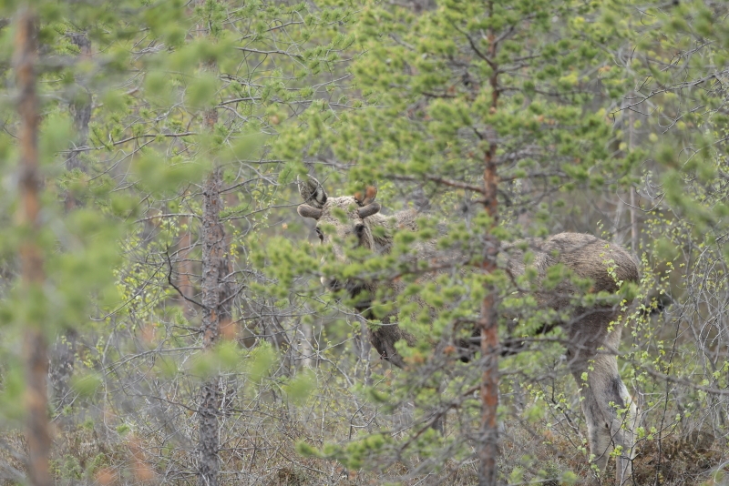 De weg loopt hier eigenlijk in een ruime cirkel van zo’n 15km. Ik had dat niet in de gaten en ben weer naar het noorden gereden om na ongeveer 8km een stukje naar het westen te rijden en daarna over de weg die ik al gereden had, weer af te zakken naar het zuiden. Na een kleine 20 minuten na vertrek bij de kerk zag ik vanuit een ooghoek ineens iets in de bosjes staan. Tot mijn heel grote vreugde bleek dit een Eland te zijn en met dit prachtige dier had ik de eerste “wild” foto gemaakt! De kop was eraf, dat smaakte absoluut naar meer! Zonder nog iets tegen te zijn gekomen, kwam ik op de splitsing waar je weer naar Skanvik kunt, maar ben ik nu rechts afgeslagen om verder zuidwaarts te rijden, dieper Pasvik in.