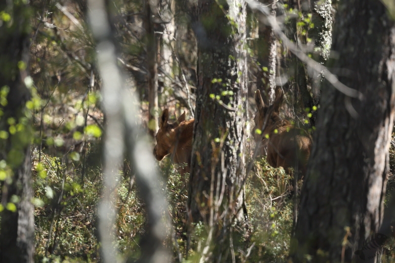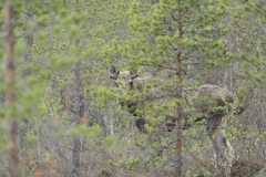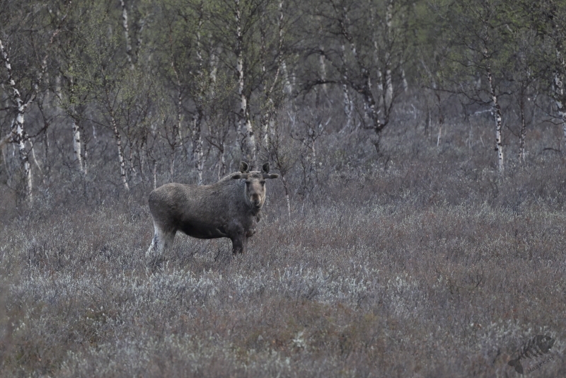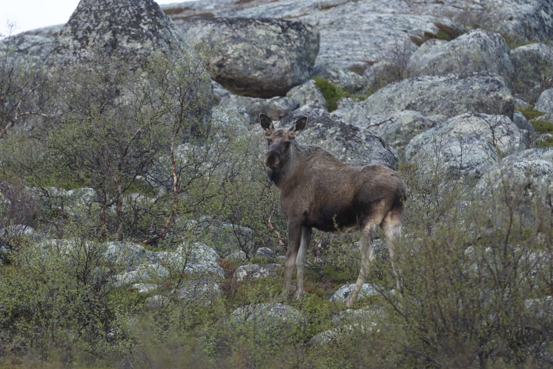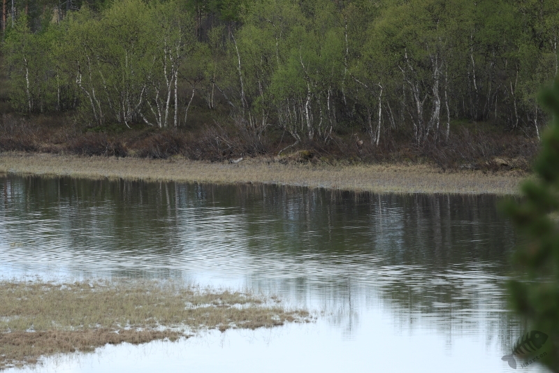 Al vrij snel werd mijn aandacht getrokken door een parkeerplaatsje bij een meer het Indre Loken. Het leek dat je vanaf die plek een mooi uitzicht over het meer had, dus ben ik gestopt om dat beter te gaan bekijken. Het bleek de accommodatie van de visclub Loken te zijn. Helaas leek ook hier niet zo heel veel te zitten, behalve een Witte Kwikstaart (natuurlijk!) en ging ik weer door over de Fv8850. Ik had onderweg een bord zien staan met “Øvre Pasvik Nasjonalpark” wat me de moeite waard leek om te gaan bezoeken. Daarvoor hoefde ik alleen de Fv8850 zo’n beetje helemaal af te rijden en dan zou ik er wel komen. Op een gegeven moment werd mijn aandacht getrokken door een witte vlek ergens rechts op het water. Gelukkig was er iets verderop een plek waar ik de auto neer kon zetten en ben een stukje teruggelopen om te zien wat het was. Ik hoopte Nonnetjes of Brilduikers in hun zomer-omgeving te vinden en het bleek de laatste te zijn. Het was een koppeltje en helaas bleven ze erg ver weg. Ik heb er een paar plaatjes van gemaakt en ben weer verder gegaan. Na 10 minuten rijden kon ik weer op de rem gaan staan. Van de rechterkant van de weg stak een moeder Eland over gevolgd door 2 jongen! Het duurde natuurlijk net te lang voordat ik de auto goed gestopt had en m’n camera klaar had. Ze verdwenen met grote snelheid voor zulke grote dieren tussen de bomen, waardoor ik de moeder sowieso niet meer in beeld kreeg. Wel lukte het om de 2 jongen vast te leggen wat ik helemaal geweldig vond. Ik ben langzaam weer verder gereden, ogen en oren goed open houdend om niets te zullen missen. Ondanks mijn oplettendheid zag ik eigenlijk niks. Een paar Wilde Zwanen na een half uur rijden was het enige.