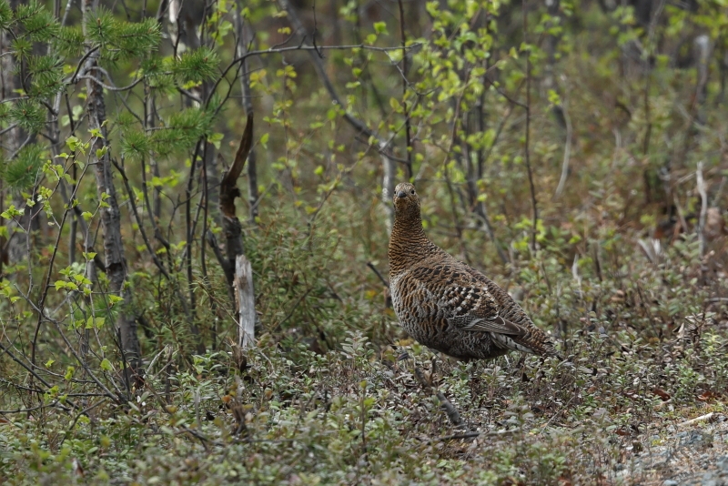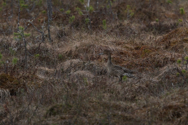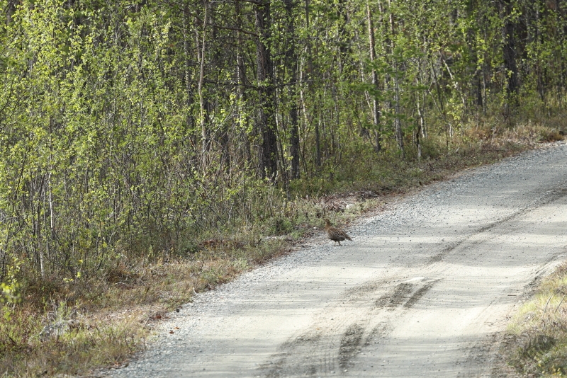 De terugweg was bijna net zo rustig als de heenweg. Alleen werd ik nu vrij snel opgehouden door een Hoen die ik verderop op de weg zag lopen. Ik kon er snel wat foto’s van maken en daarna zelfs nog wat dichterbij komen en nog meer foto’s maken. Ik was er direct van overtuigd dat ik het wijfje van de Auerhoen op de foto aan het zetten was, dus had ik een nieuwe soort te zien gekregen! En wat voor 1! Omdat ik na terugkomst in Nederland toch wat twijfelde heb ik nog eens heel goed naar de foto’s gekeken en bleek dat het geen Auerhoen was, maar het wijfje van het Korhoen. Alsnog een geweldige nieuwe soort! Ik moest de terugweg nog 1 keer onderbreken voor een Eend een stukje in het bos wat een vrouwtje van de Pijlstaart bleek te zijn. Een bijzondere omgeving voor een prachtige soort.