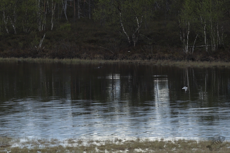 Toch wat sneller dan dat ik het park in gereden was, was ik er weer uit. Ik had eerder gezien dat er een schuilhut langs de “grote” weg zou moeten liggen met uitzicht op de grensrivier waar ook weer mooie soorten te zien zouden moeten zijn. Ik was de hut op de heenweg al voorbij gereden, maar nu zag ik het bordje wel en ben meteen gestopt om het zicht vanaf de hut te bekijken. De hut bij Gjøbukta lag op een heuveltje tussen de bomen en het uitzicht over het meer Höyhenjärvi (Fjørvatnet in het Noors) is erg mooi. Er waren nog 2 mensen in de hut aanwezig: een echtpaar uit Engeland en we wisselden wat wetenswaardigheden uit. Zij vertelden onder andere over een 2de hut nog verder naar het noorden waar een enorme groep Wilde Zwanen zou moeten zitten. Onderwijl was ik over het water aan het speuren naar alles wat maar interessant was. Ik was speciaal gefocust op Meeuw-achtige verschijningen: in deze streek zouden Dwergmeeuwen kunnen zitten en dit was 1 van de soorten die ik heel graag zou willen zien. Als eerste zag ik een Kuifeend helemaal aan de andere kant van het water zitten: het was een begin… Maar direct daarna vloog er een witte gedaante het beeld in. Ik was direct paraat en maakte meteen wat foto’s.