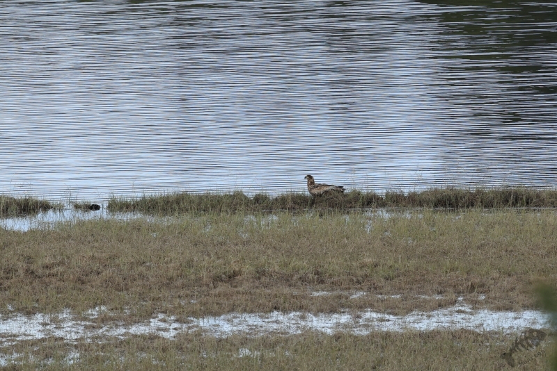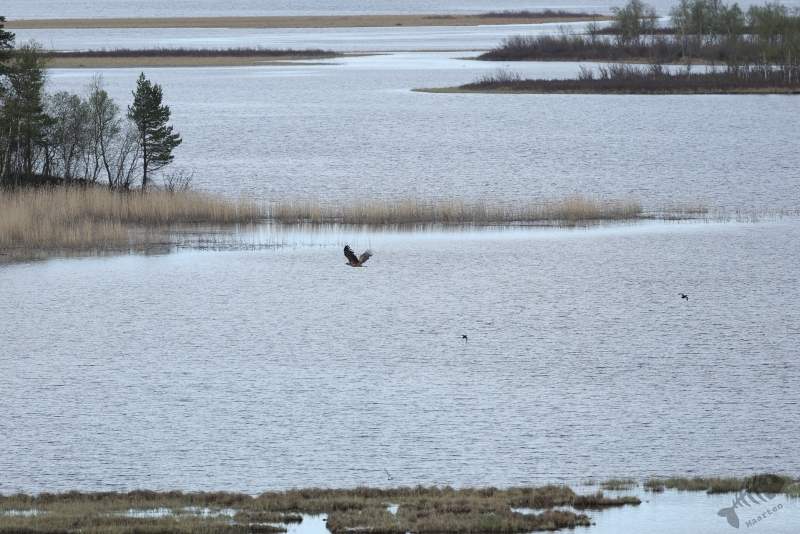 Het zou toch niet… En inderdaad: het was er geen. Het bleek een Stormmeeuw te zijn. Ook leuk, maar… Aan de rand van het water aan de kant van de hut (nog steeds ver weg) zat een Zeearend. Altijd een indrukwekkende verschijning, zeker toen hij later op de wieken ging en zich in vol ornaat liet zien. Aan de andere kant van het water dan waar de Zeearend zat, liepen 2 Kraanvogels. Deze pasten ook echt hier in de omgeving en ik vond het dan ook erg leuk deze steltige types te zien. Ik was druk de Kraanvogels nog enigszins leuk op de foto te krijgen ondanks de afstand, toen er weer een witte verschijning verscheen. Weer heb ik direct m’n camera op hem gericht en wat bleek: deze keer was het inderdaad de Dwergmeeuw! Ik had hem gezien, weer eentje voor op de lijst! Ook dit Meeuwtje zat erg ver weg, waardoor ik hem misschien niet helemaal optimaal kon vastleggen, maar wel kon ik hem goed bekijken en zijn jachttechniek goed observeren. Hierbij scheerde de vogel vlak over het water om er insecten vanaf te pikken. Heel kunstig. Ik was verder nog in de gelegenheid 2 Eenden vast te leggen en bedacht dat het daarmee wel mooi was geweest. Ik had de Meeuw en moest nog een heel eind rijden. Tijd om door te gaan.