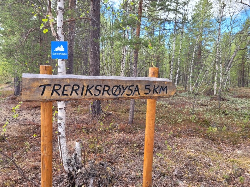 Na 2 uur(!) rijden en niets meer gezien te hebben, kwam ik aan bij het einde van de “weg”. Hier bleek ook een shelter van Biotope te staan waar kampvuur- en overnachtingsmogelijkheden waren. En ook stond er een bordje waar: “Treriksrøysa 5km” op te lezen was. Het bleek dus dat je vanaf dit punt nog eens 5km verder moest, ik te voet want ik had geen sneeuwscooter bij me. Dat leek me een beetje teveel en lichtjes teleurgesteld ben ik weer in de auto gestapt om de weg terug weer te beginnen. Nou wist ik niet wat de “Treriksrøysa” was, dus wat ik er aan zou missen, maar toch vond ik het wel jammer. Ik heb het later opgezocht en het bleek een drielandenpunt te zijn: Noorwegen, Rusland en Finland grenzen hier aan elkaar. Misschien interessant, maar ik heb er geen spijt van dat ik dit toch maar niet gedaan heb (in Zuid-Amerika heb ik eerder wel eens zo’n punt bezocht en natuurlijk ook in Vaals…).