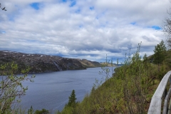 Na ongeveer 500 meter hield de verharding van de weg op en werd het wat onregelmatiger. En het werd onregelmatiger en onregelmatiger… En mijn snelheid werd lager en lager en de 15km gingen steeds langzamer voorbij. Ik was om half 4 bij de ingang van het Park aangekomen en begon te twijfelen of ik wel moest doorrijden tot het einde van de weg: ik moest ook weer helemaal terug en zat hier op het verste punt. Het was ook nog 250km naar Vestre Jakobselv wat me, volgens Maps, een kleine 4uur zou kosten en ik wilde niet pas midden in de nacht aankomen… Maar goed, als je eenmaal een weg bent ingeslagen is het ook weer lastig om zomaar om te draaien. Wie weet wat ik allemaal nog tegen zou komen… De landschappen en uitzichten waren in ieder geval zeer de moeite waard. En de rust…