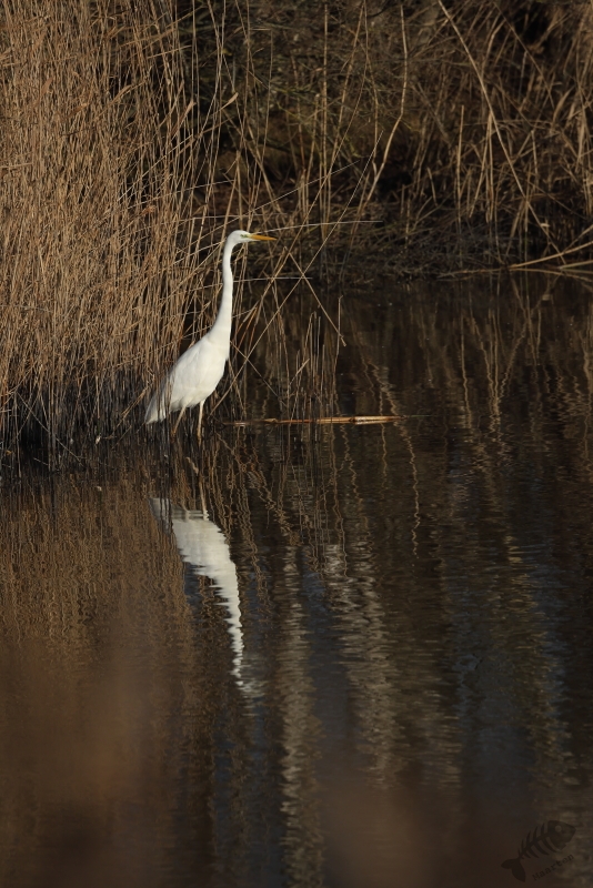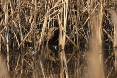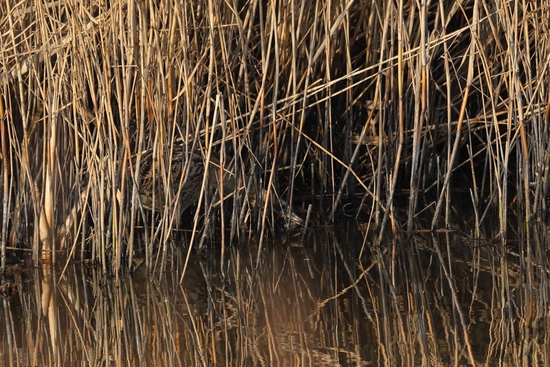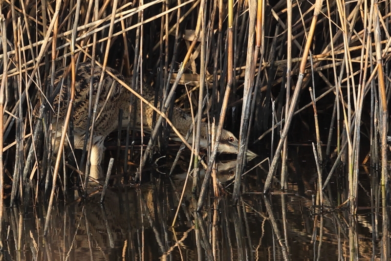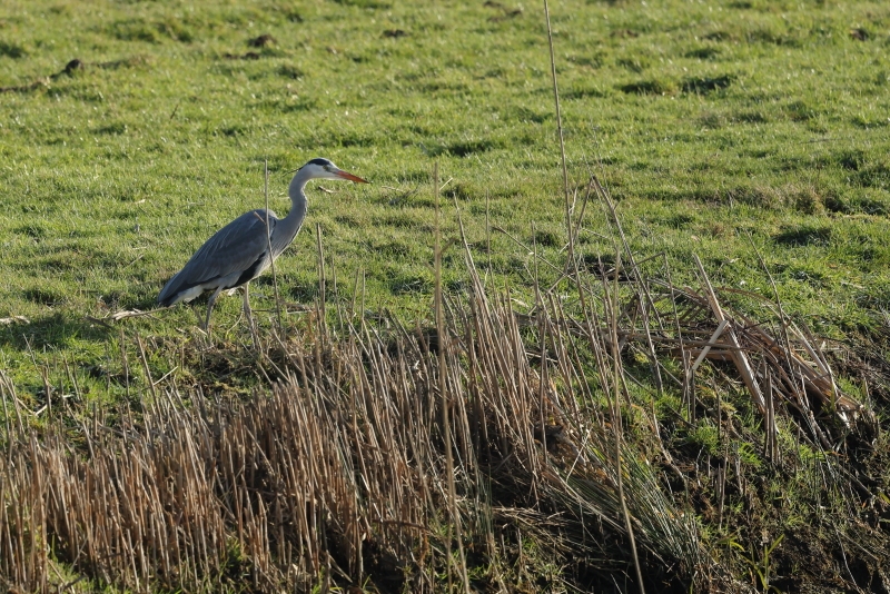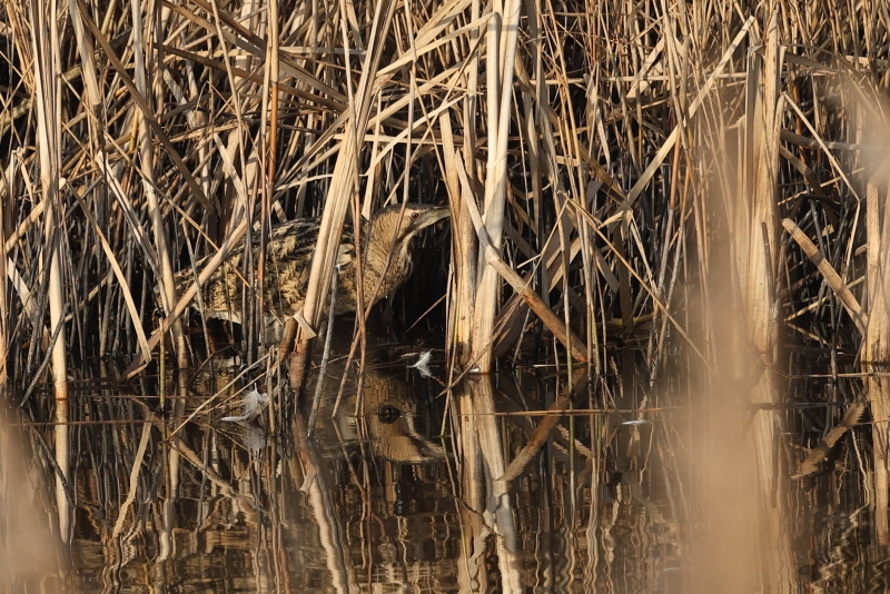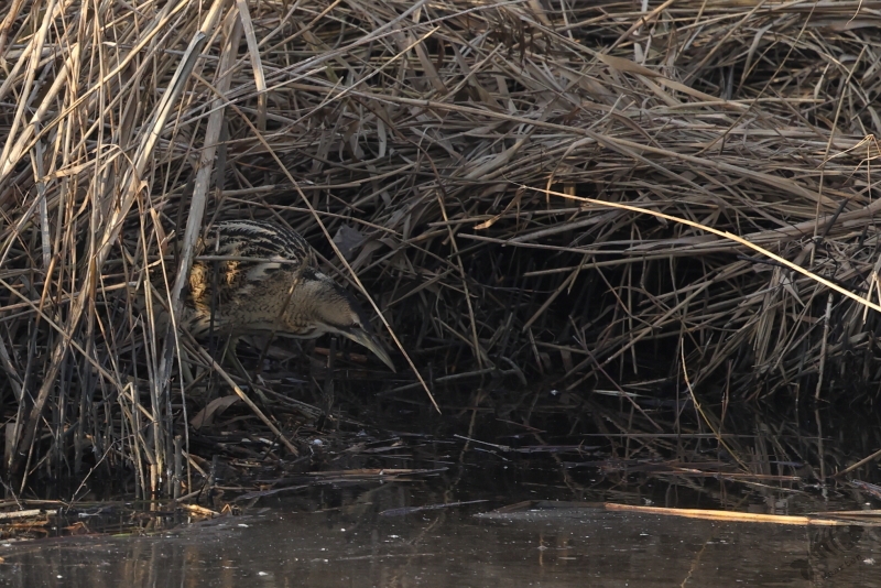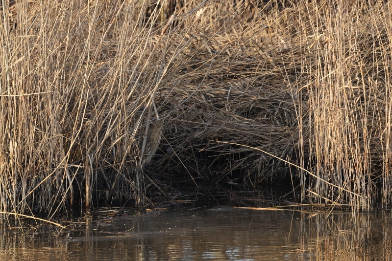 Op een bepaald moment kun je ook genoeg foto’s van de Pijlstaart hebben (al lijkt dat soms onmogelijk) en ben ik toch maar weer omgedraaid en teruggefietst. Ik ben gestopt voor een mooie Blauwe Reiger, toch maar weer 1 van de Reiger-familie, en net voor de sluis bij het Putter Gemaal zag ik een oranje-blauwe flits. Dat kan dus maar 1 ding zijn en met zijn oranje borst vooruit, zag ik de IJsvogel dus al snel aan de overkant van het water op een tak van een Wilg zitten. Ook weer eens heel leuk om deze flitsende soort te zien! Bij de sluis zelf zat een meer ingetogen gekleurde Aalscholver pontificaal op een meerpaal, maar geen Roerdomp… Ik ben toen de Middelbeekweg opgereden en eerst tot de snelweg gegaan. Daar kon ik niks vinden, dus gekeerd en rechtsaf de Arlersteeg opgereden. Daar zaten enorme aantallen Ganzen in de weiden: met name Brandganzen en Kolganzen. Een bijzonderder soort was de Canadese Gans die ik op de terugweg in de weiden bij het Gemaal zag. Op het punt waar je de dijk weer op kunt om naar de westkant te rijden, stond een groep mensen bij elkaar intensief naar de overkant te staren. Nog voordat ik mijn fiets had weggezet en bij hen stond, wist ik al dat er een Roerdomp gezien was. Ik vind het best vervelend als mij gevraagd wordt: “Wat ziet u???”, dus ik ben een beetje afzijdig gaan staan en ben zelf gaan speuren. En tot mijn grote genoegen vond ik hem ook! Eerst heel verscholen, voorzichtig jagend met zijn snavel plat op het water. Maar hij bewoog heel behoedzaam naar rechts, waar een soort van open plek in het riet was. Als hij daar nou eens uit zou komen… Terwijl ik daarop stond te wachten, zag ik dat 1 van de mede-Roerdomp-wachters een warmtekijker tevoorschijn haalde. Ik kreeg de indruk dat hij degene was die de vogel ontdekt had en bedacht dat het wel hele handige apparaatjes waren. Ik moest me er toch maar eens in gaan verdiepen… Na zo’n 20 minuten ingespannen hebben staan turen en geconcentreerd blijven afwachten (en verschillende keren de vraag: “Wat ziet u???” te hebben genegeerd), kwam de Roerdomp inderdaad uit bij de open plek en stapte er heel voorzichtig in. En zo kon ik hem eindelijk eens in volle glorie op de gevoelige chip zetten. Wat een ontzettend leuk moment! Vanuit de open plek liep de vogel naar achteren en verdween tussen het dichte riet. Het maakte niet meer uit: ik had m’n wensvogel van vandaag heel mooi kunnen zien.