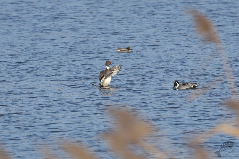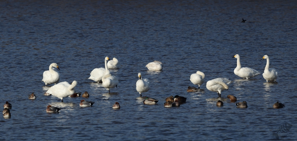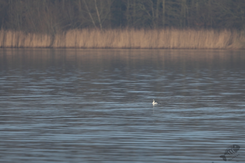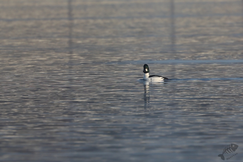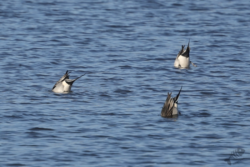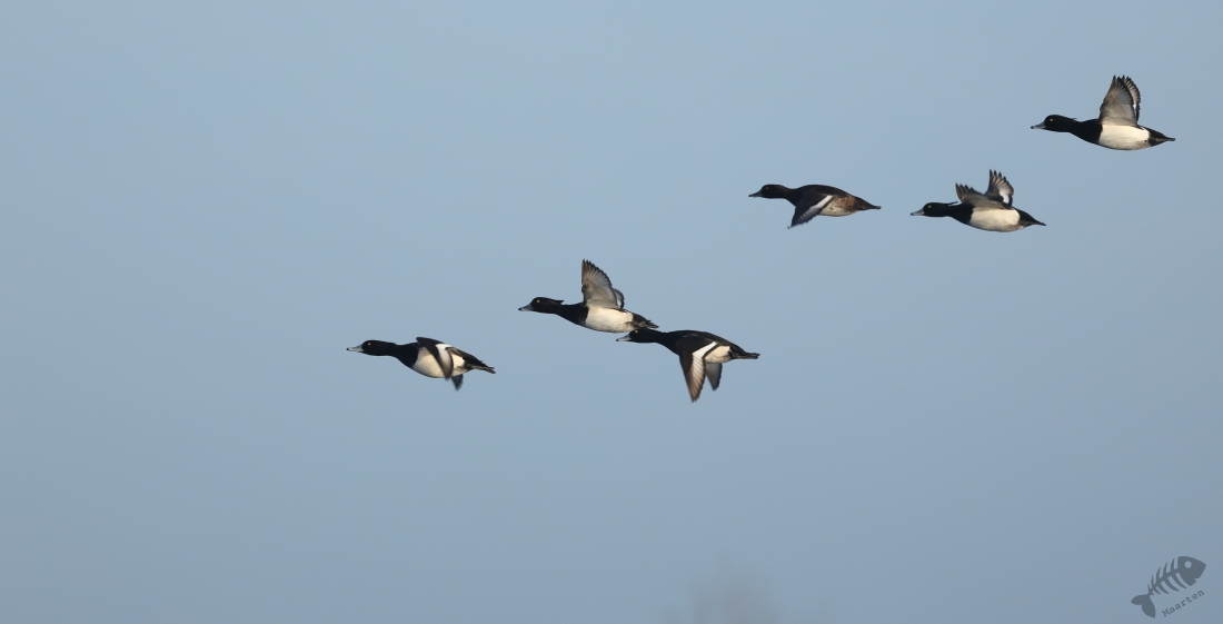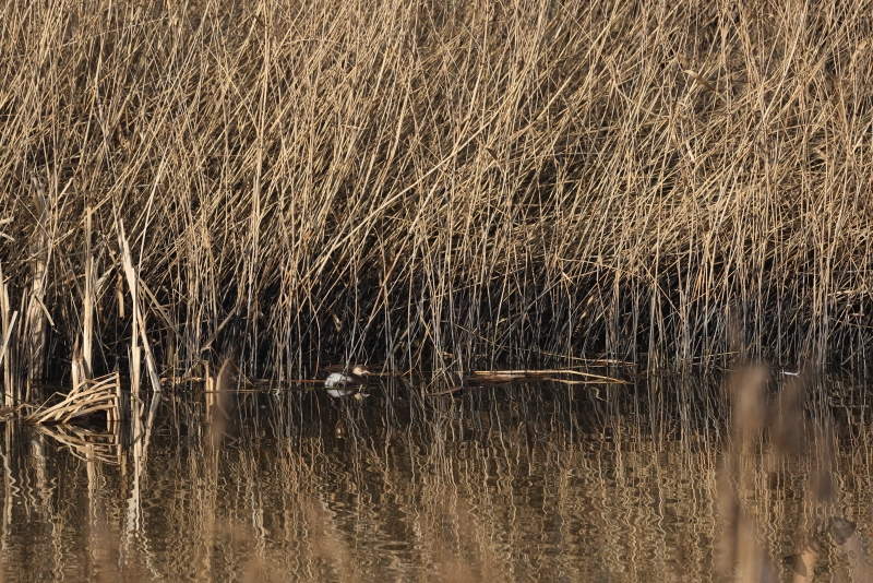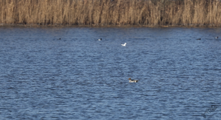 Al een aantal jaar zitten aan het begin van de Zeedijk interessante soorten zoals Nonnetjes en Pijlstaarten, maar vandaag zag ik alleen een woerd van deze laatste prachtige Eenden soort. Heel rustig heb ik toen de Zeedijk vervolgd en ben op het punt waar de weg naar rechts afbuigt en de Middelbeekweg wordt, het fietspad opgegaan en ben doorgereden tot het bredere water met de eilandjes. Daar zat een mooie groep Kleine Zwanen en kon ik in heel andere licht-omstandigheden foto’s maken van deze sierlijke vogels. Omdat verderop niet heel veel meer leek te zitten, ben ik weer omgedraaid en tot de boerderij voor het Putter Stoomgemaal gekomen. Het gekwetter van een grote groep Huismussen hield me staande en terwijl ik bezig was foto’s van de druktemakers te maken, besloot ik nog een keer hetzelfde stuk te gaan fietsen; ik was er nou toch… Waarom ik dit deed was eigenlijk maar met 1 reden: ik hoopte een Roerdomp te vinden. Omdat ik het riet aan de overkant afzocht, kreeg ik wel een Dodaars in beeld, een Grote Zilverreiger (die wel wat meer opvalt dan een Roerdomp) en een vrouwtje van de Grote Zaagbek. Geen Roerdompen dus… Aangekomen bij de eilanden ben ik nu wel weer wat veder gereden waardoor ik op een plek kwam waar grote aantallen Eenden zaten. Met name vond ik Wintertalingen en..: Pijlstaarten! Hier zaten er dus heel veel en tja, daar moet ik wel even de tijd voor nemen. Eigenlijk was de afstand voor écht mooi net te groot, maar toch was ik helemaal niet ontevreden met de foto’s die ik kon maken. De Pijlstaarten lieten zich op allerlei verschillende manieren goed zien waarbij er met regelmaat gegrondeld werd met de billen omhoog, waarbij de pijl-staart fier omhoog stak.